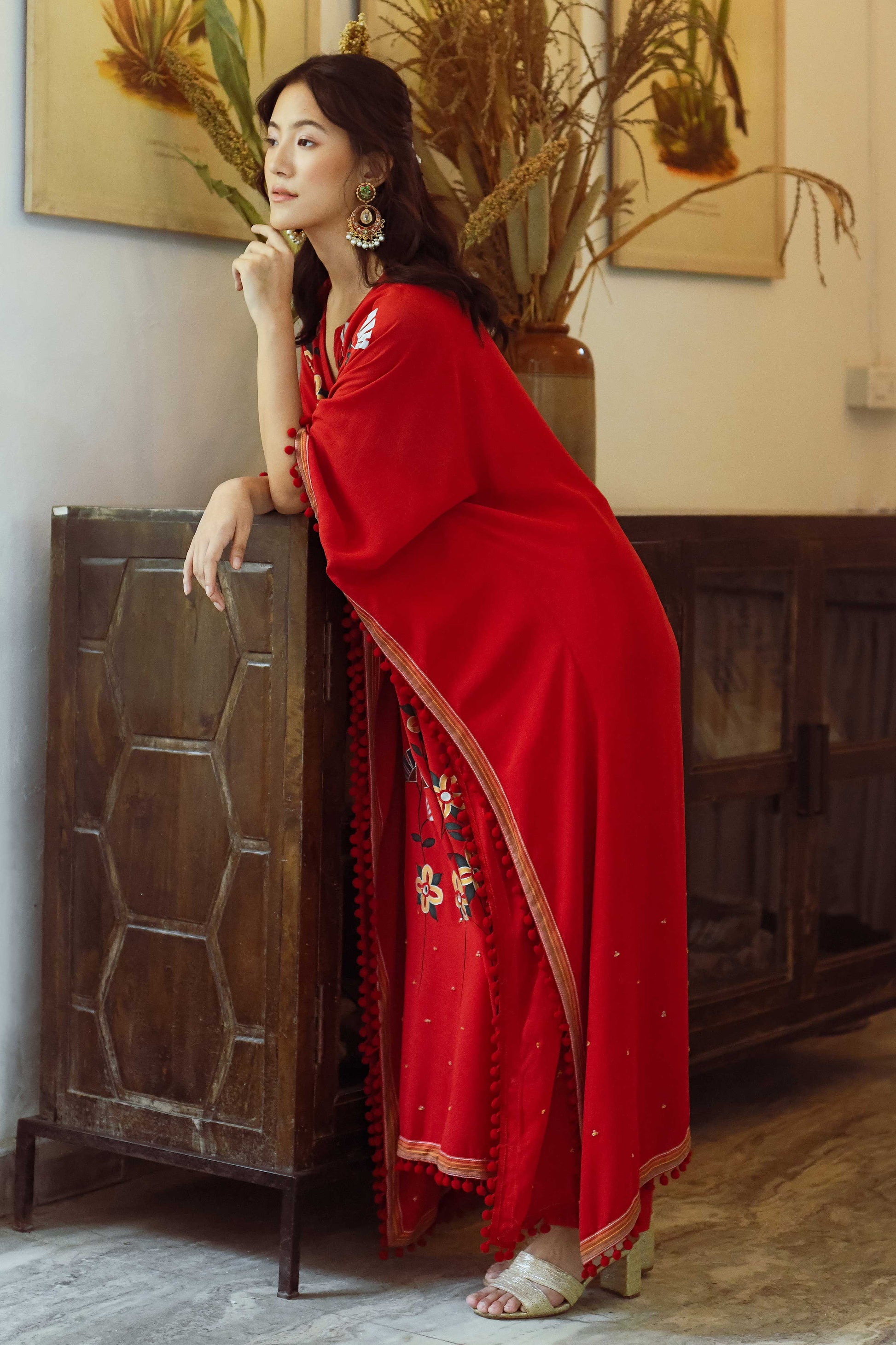 Handpainted intricate floral art work on the yoke with lace detailing paired with matching loose fit pants.