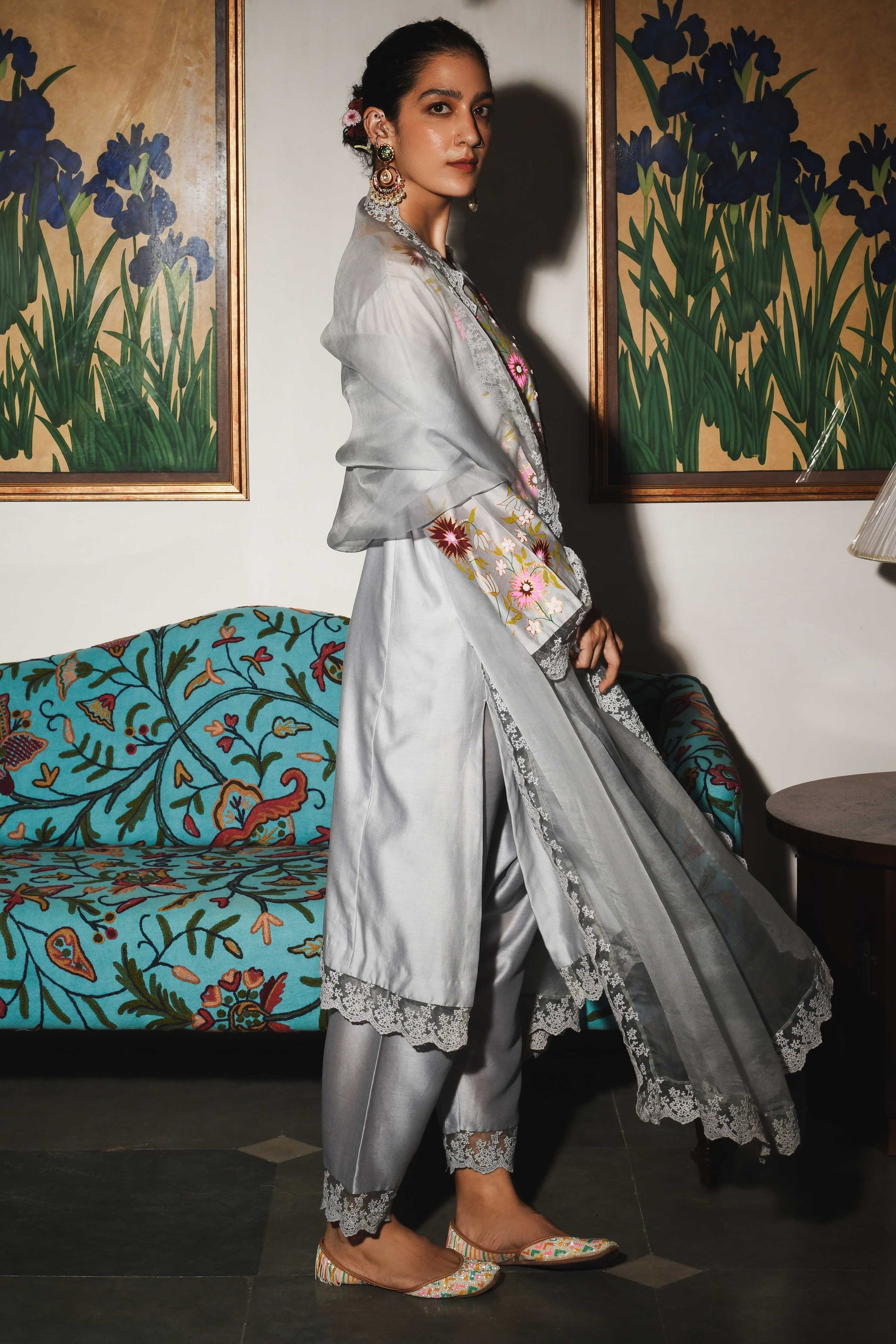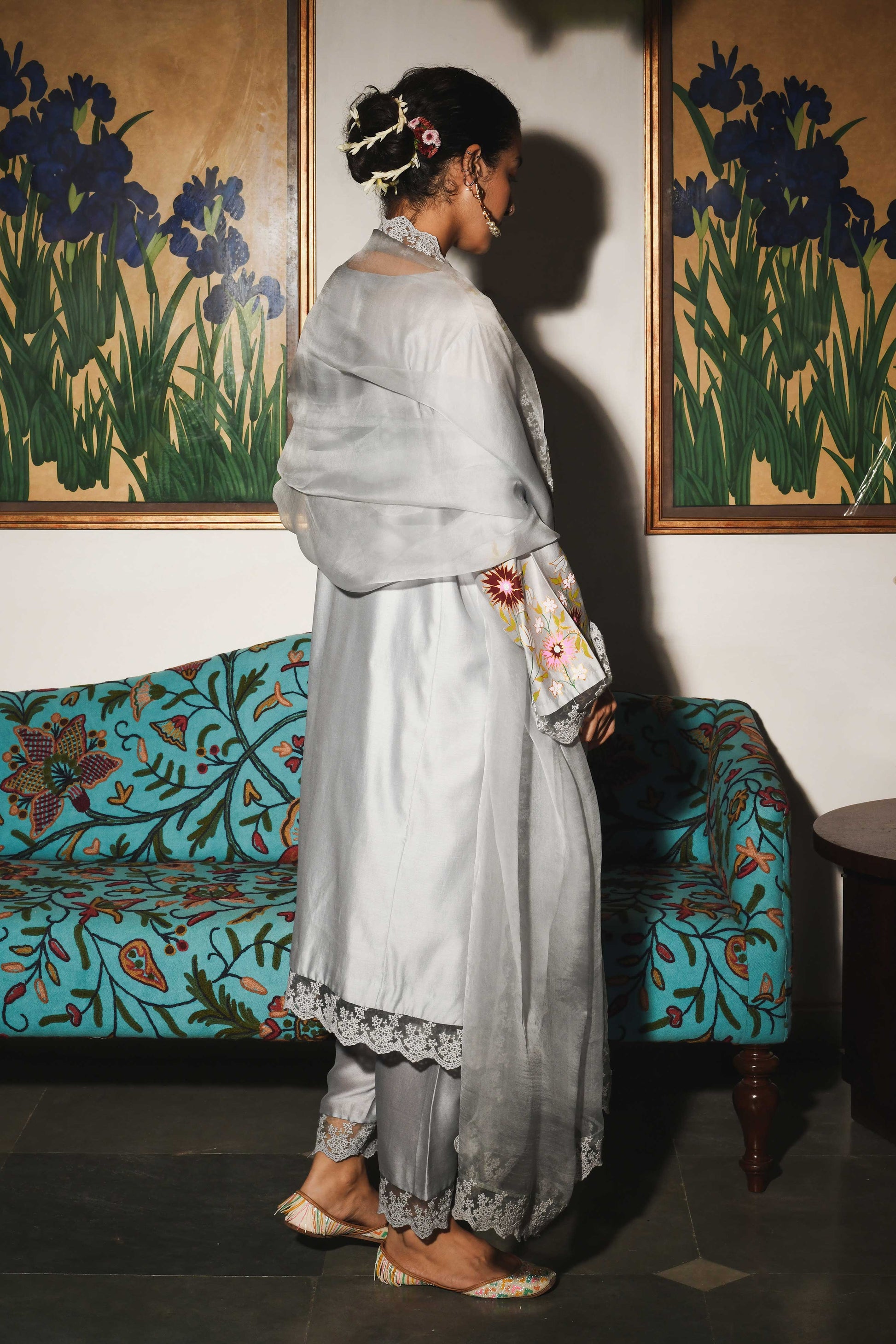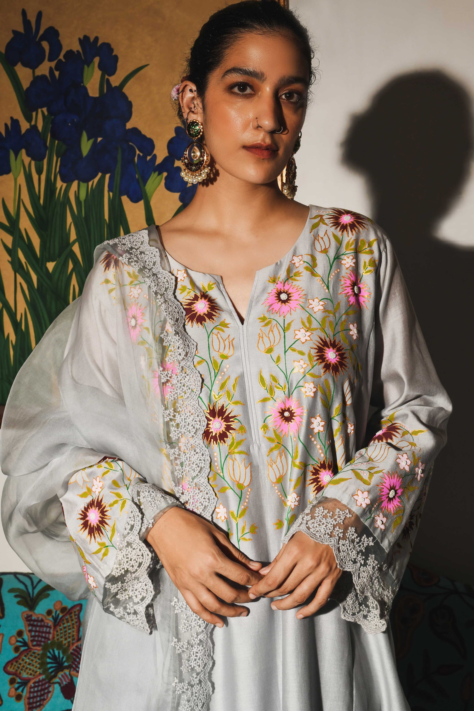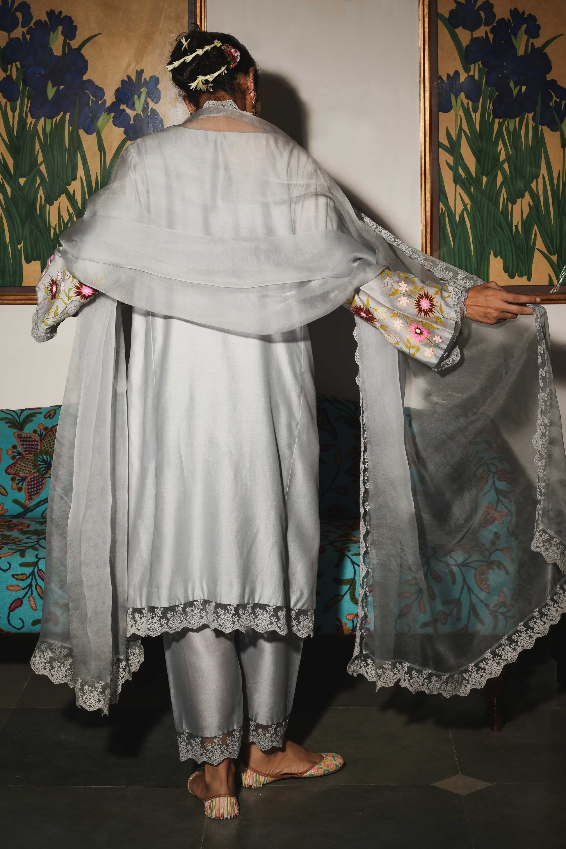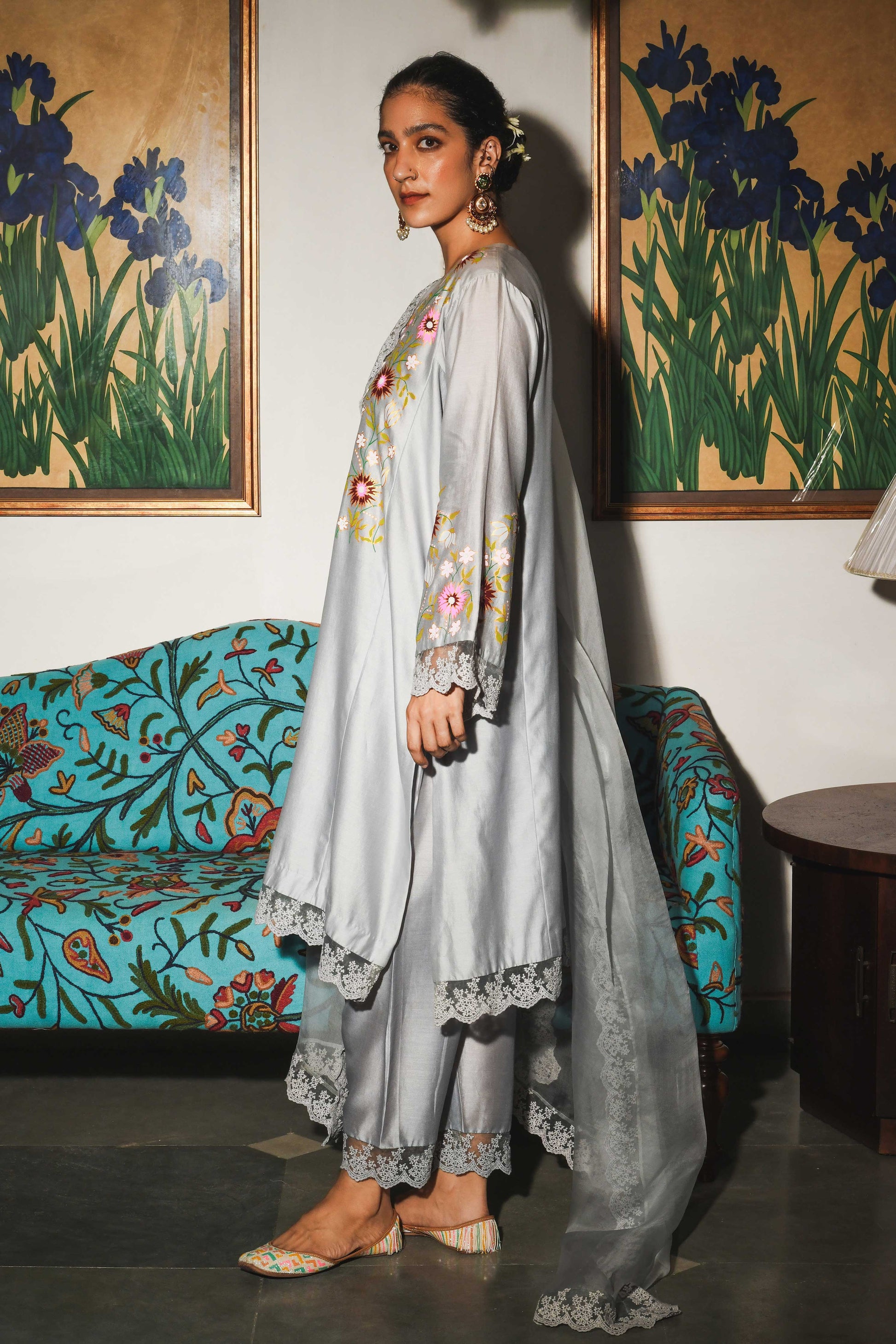Chanderi grey suit set with hand painted floral art work and embroidery highlight, finished with floral lace on the hemline of the suit and sleeves. Paired with salwar pants with organza lace detailing on the hemline and matching organza duppatta, finished with a floral lace.