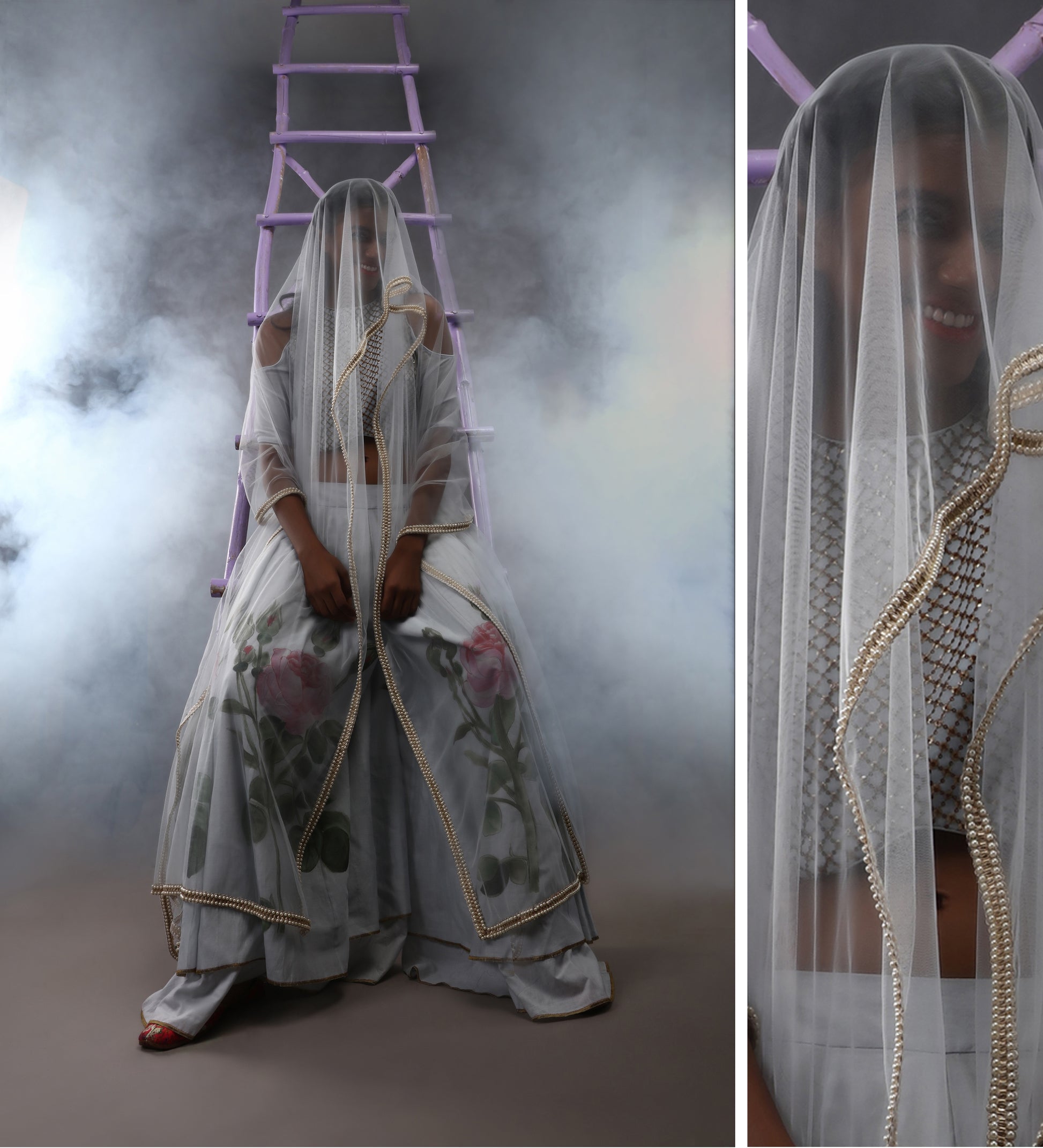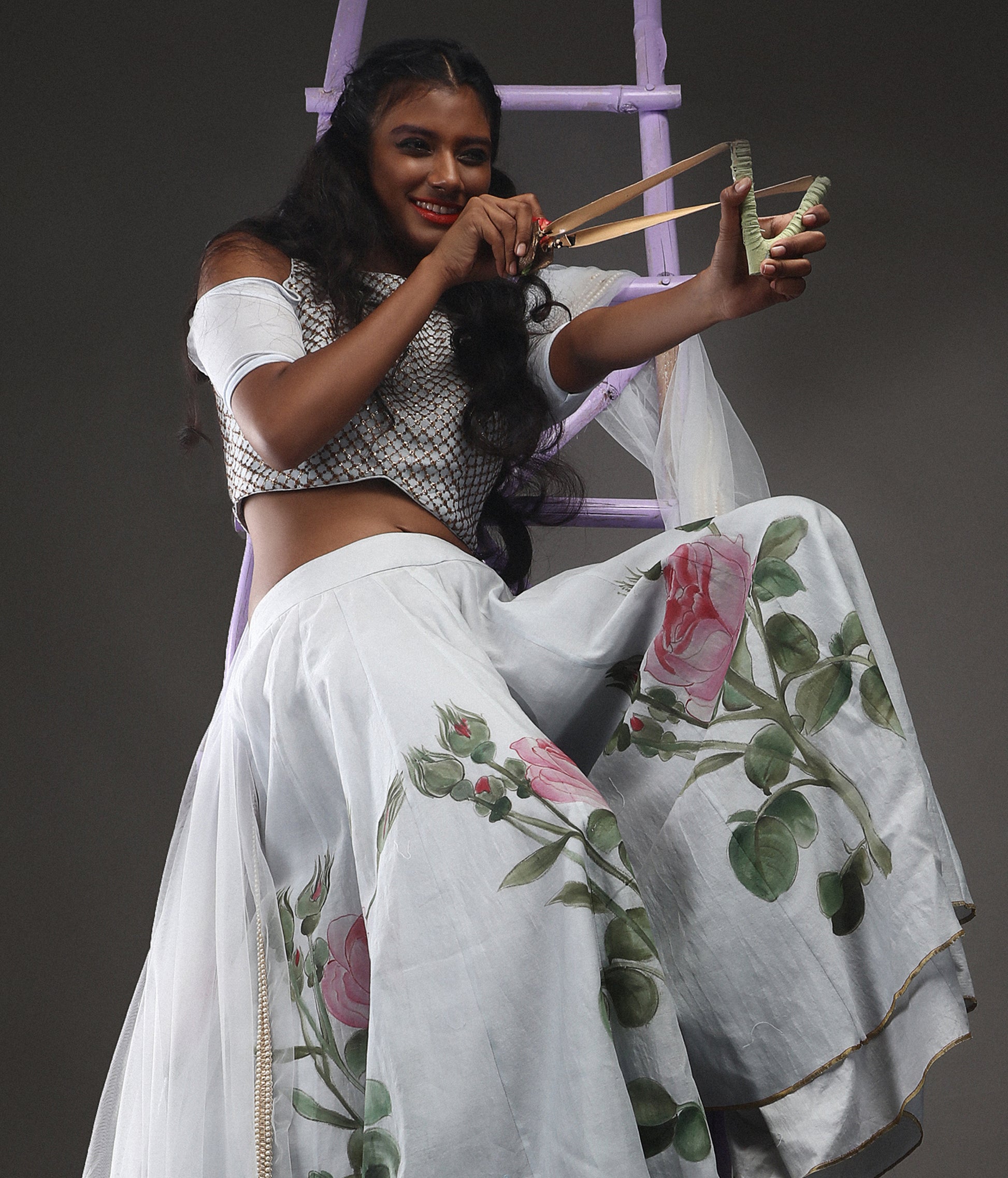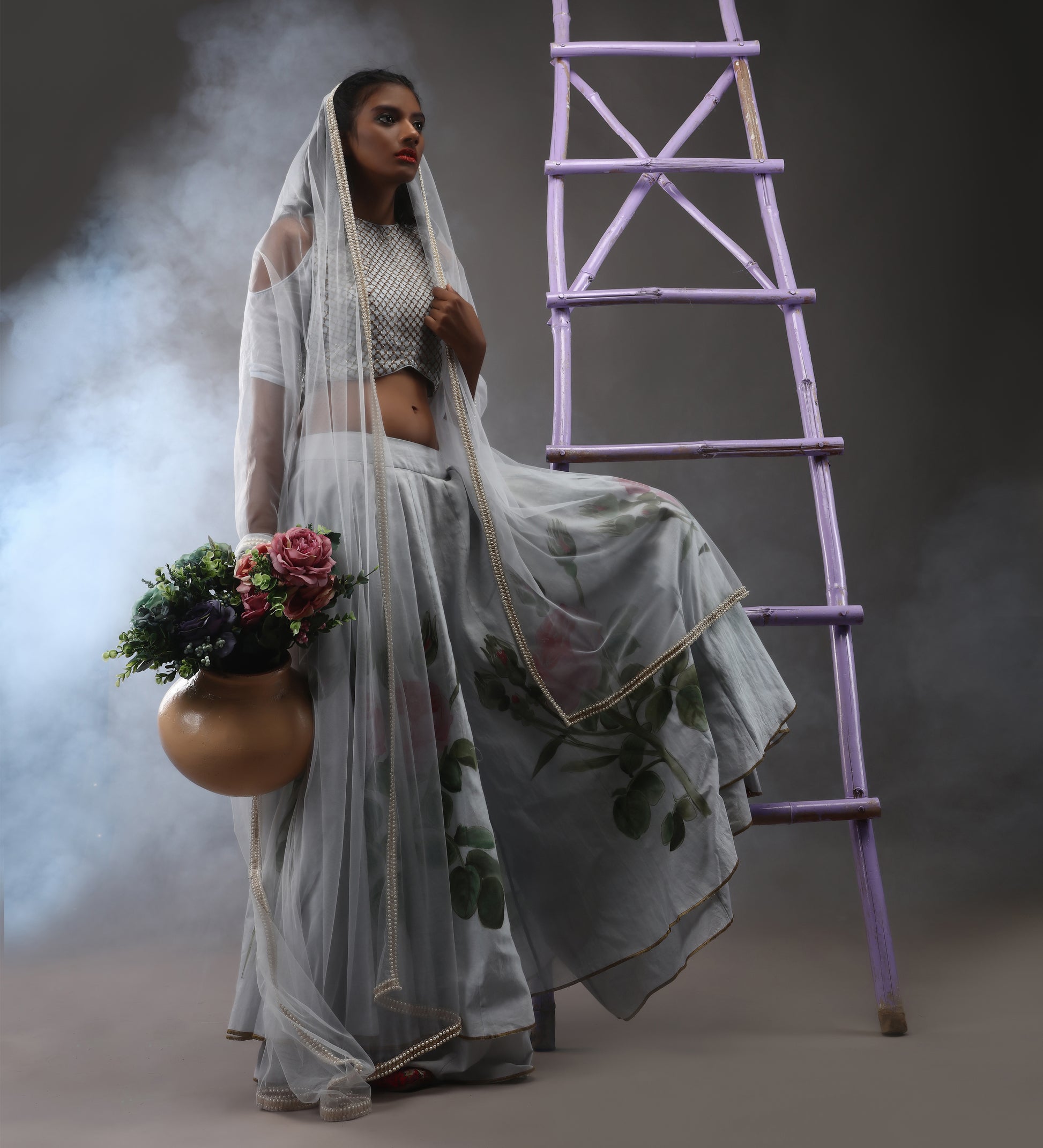 "Slate blue Double layered flared pant, hand-painted with pink roses paired with an hand-embroidered cold shoulder crop top, with a net duppatta.
