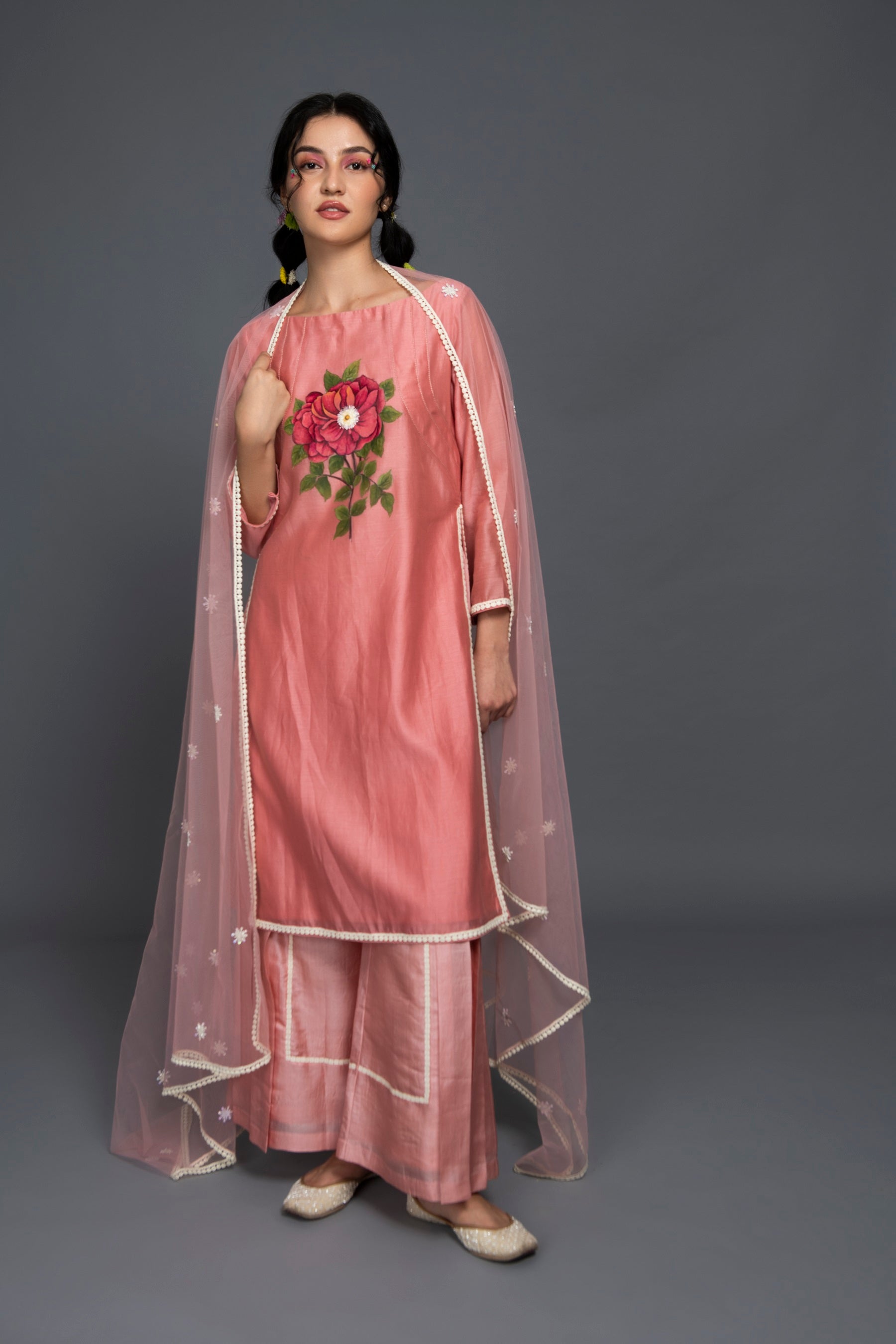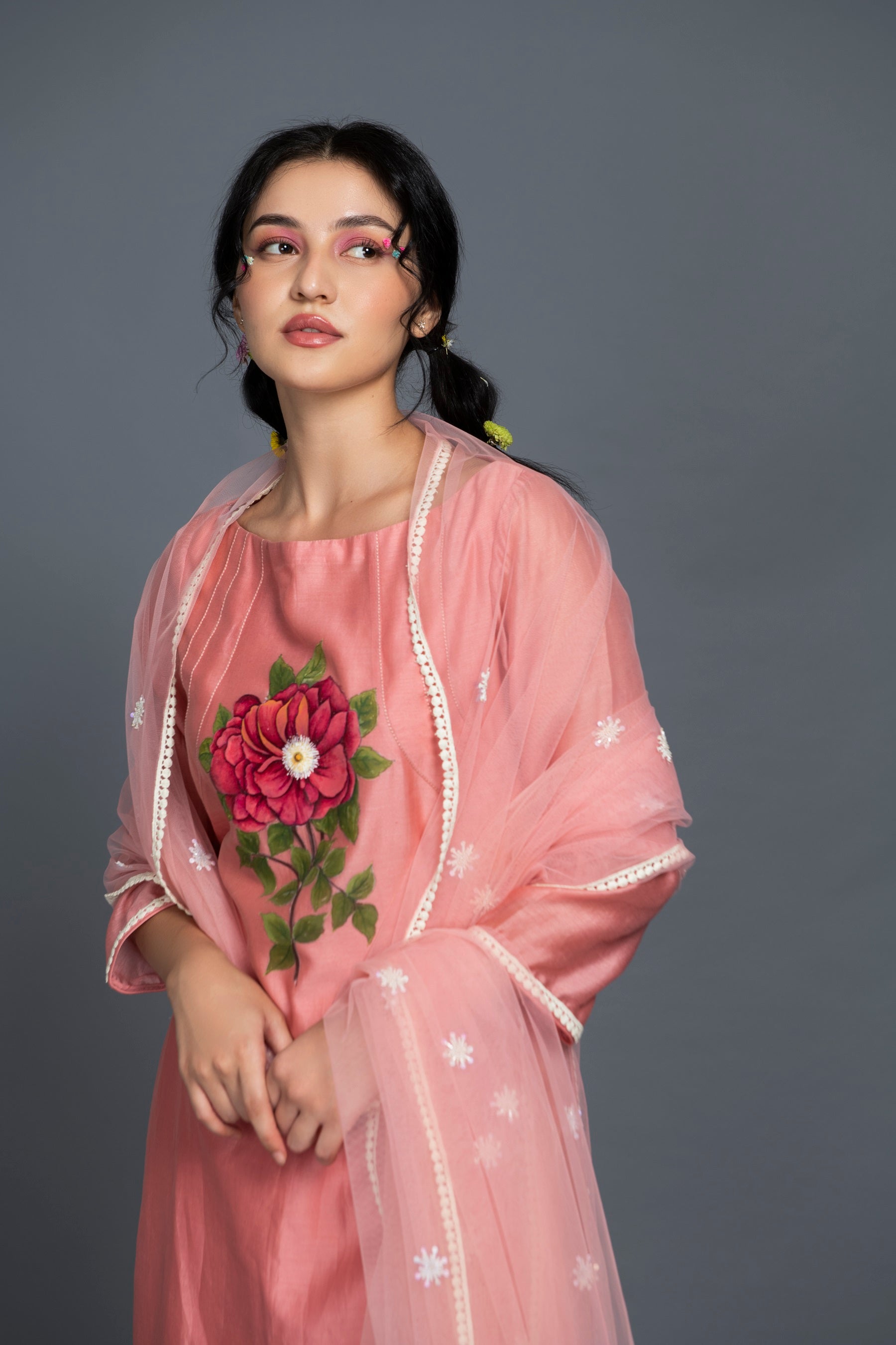 The Camellia Pink Suit Set has an elegant hand-painted kurta, adorned with camellia flowers, embodies timeless beauty. Complementing the kurta, the high waisted silk pants with box pleats on the sides and leather sequins highlight in the front and back panels boast intricate craftsmanship. The hand-embroidered net dupatta with sequins work adds a touch of sophistication and completes the look flawlessly.