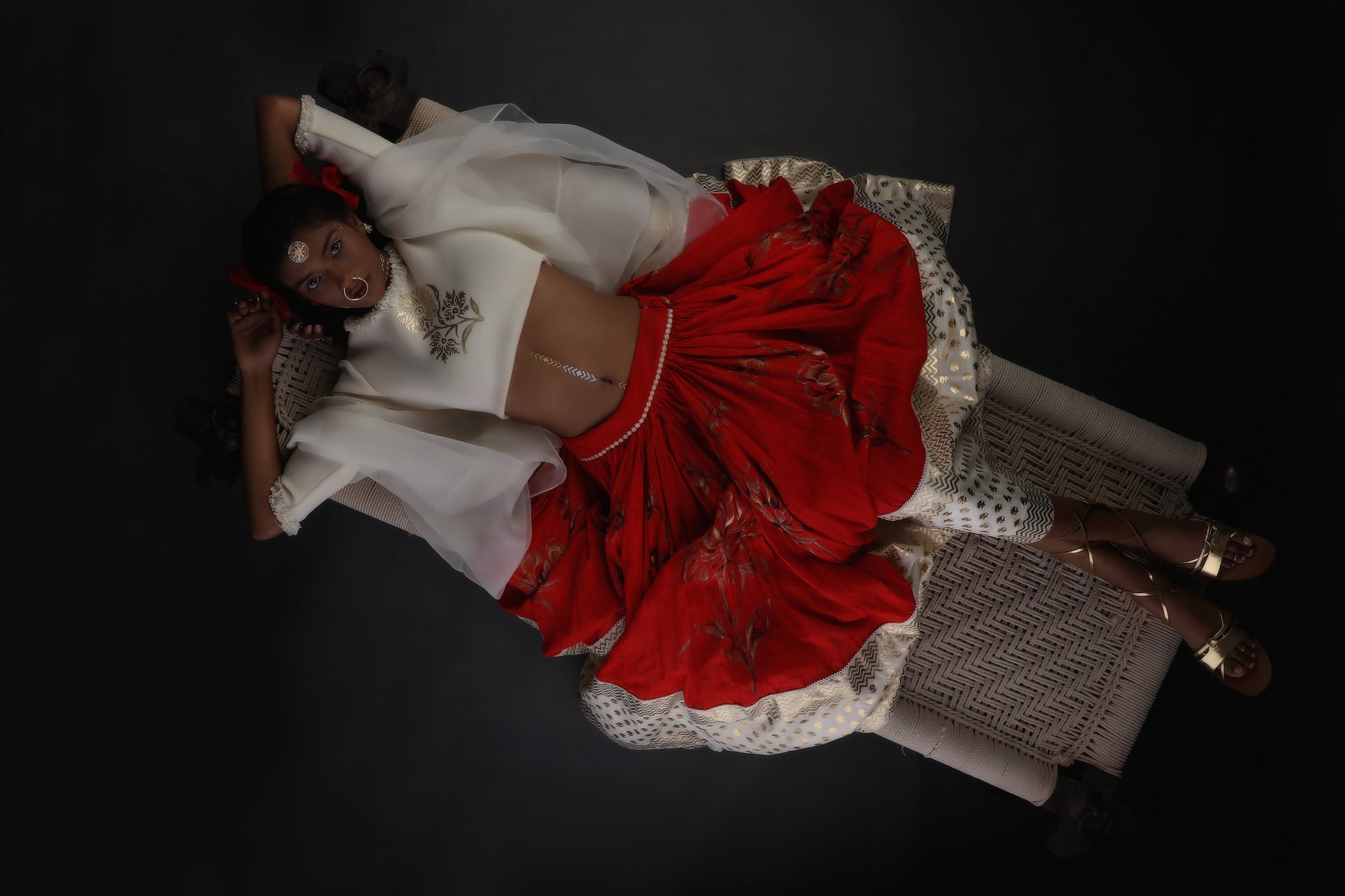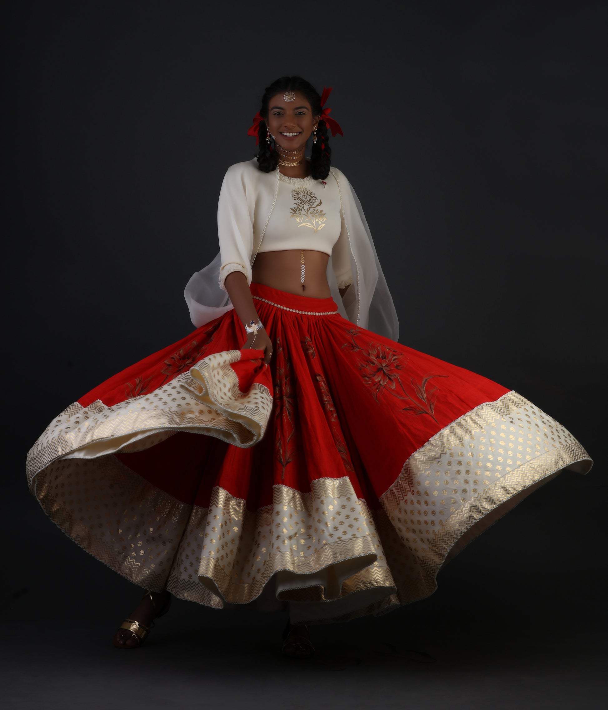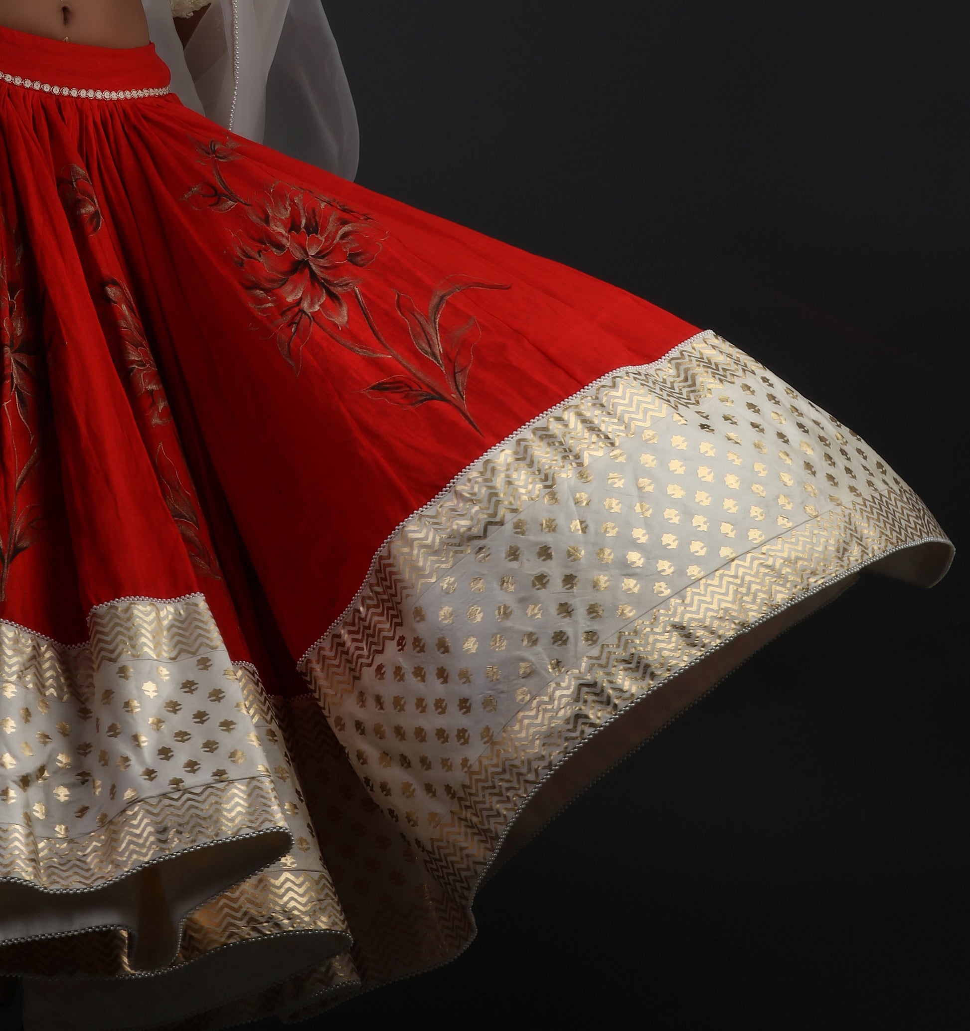 "Vintage cotton printed Ghagara (all motifs are highlighted with hand embroidery), paired with golden foil printed off-shoulder neoprene crop-top"