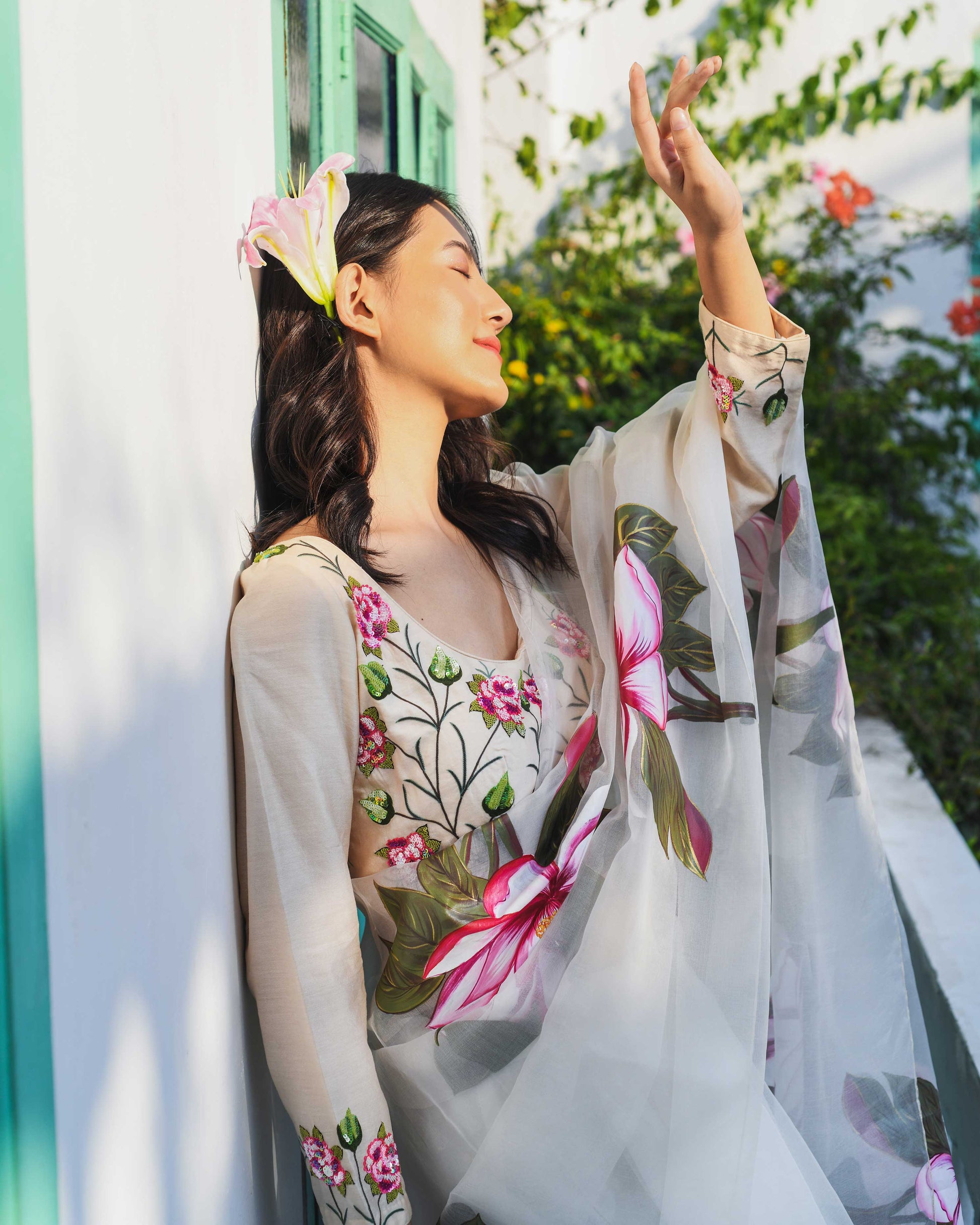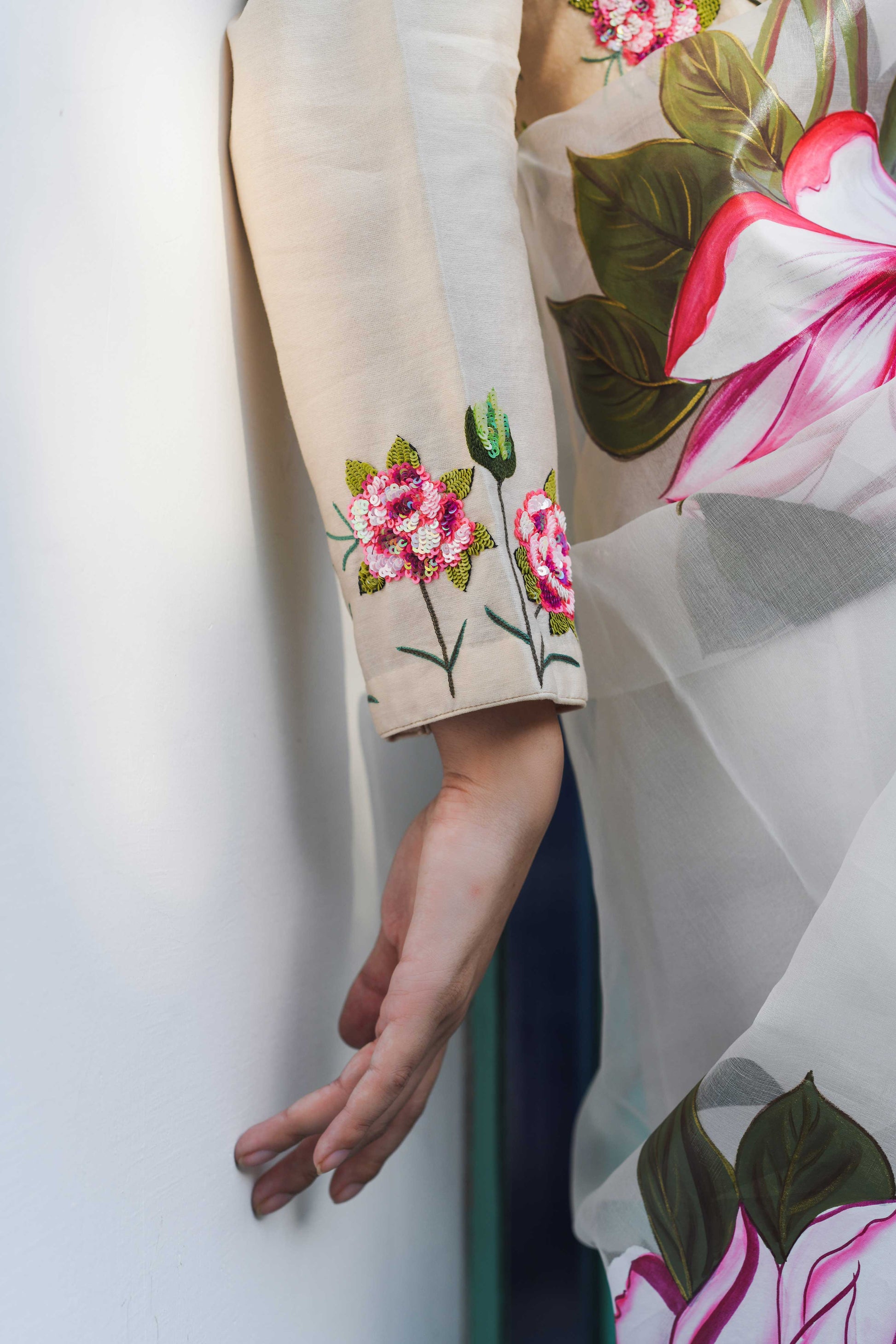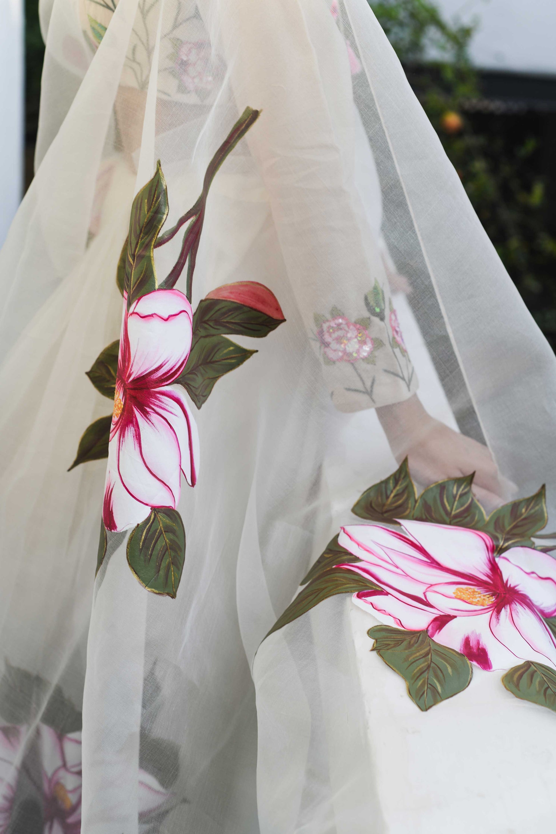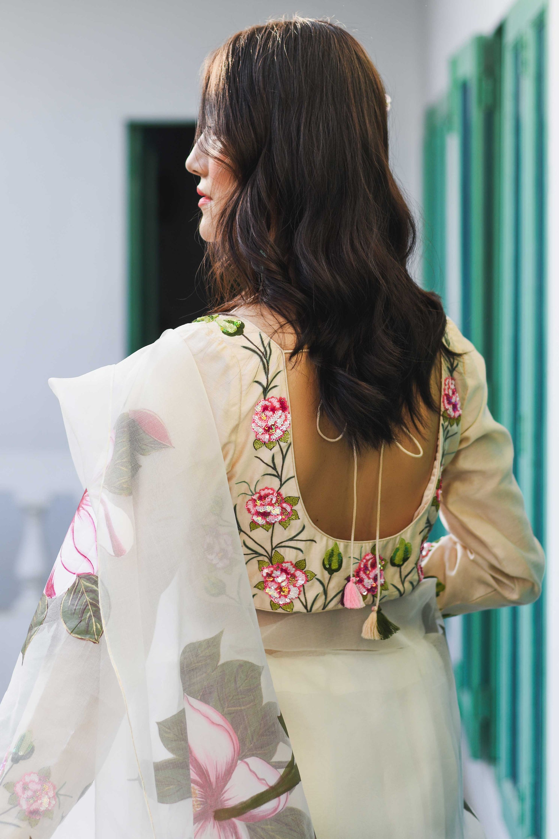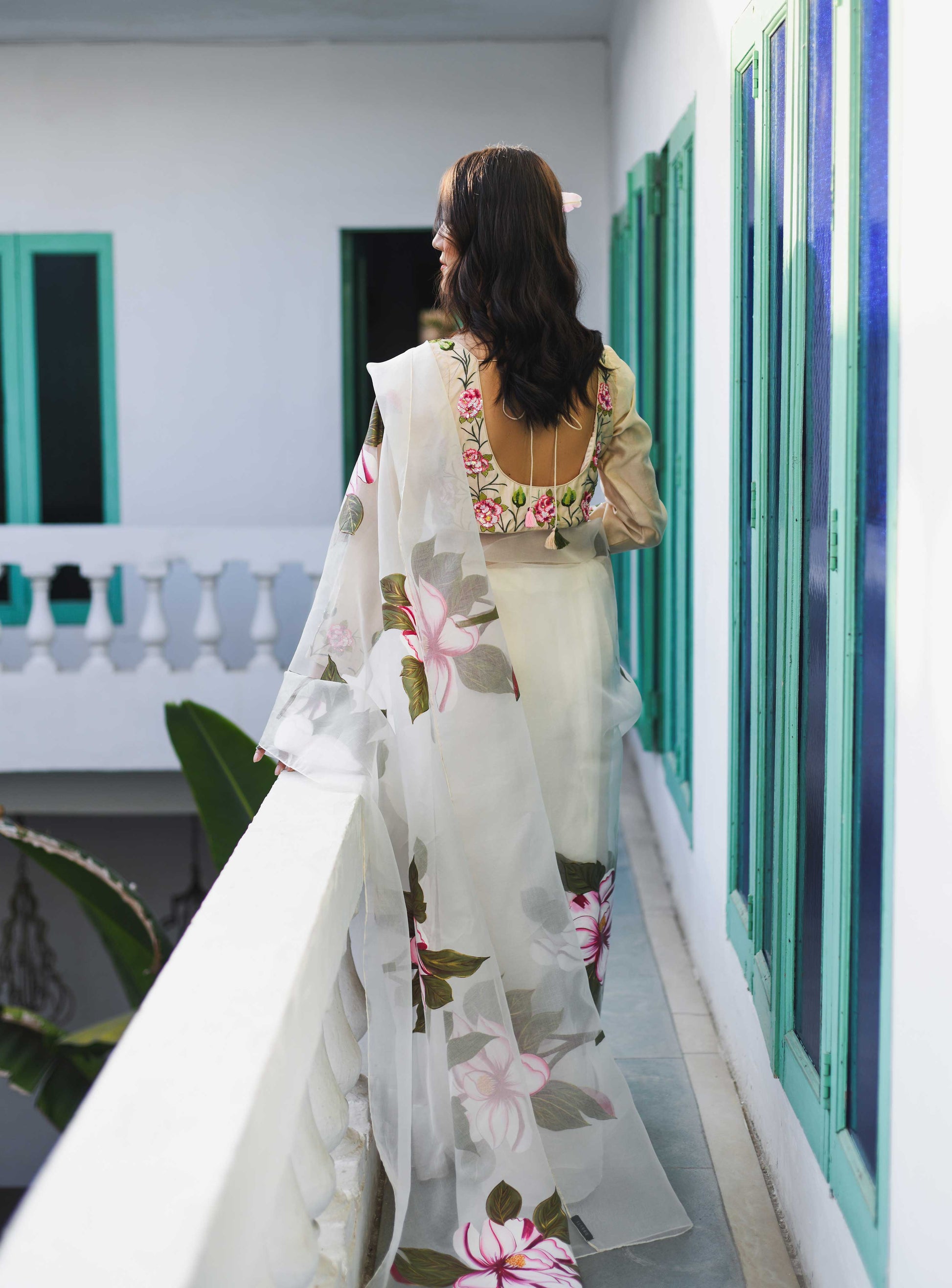White Hand painted organza saari with peonies paired with a matching hand embroidered chanderi blouse.