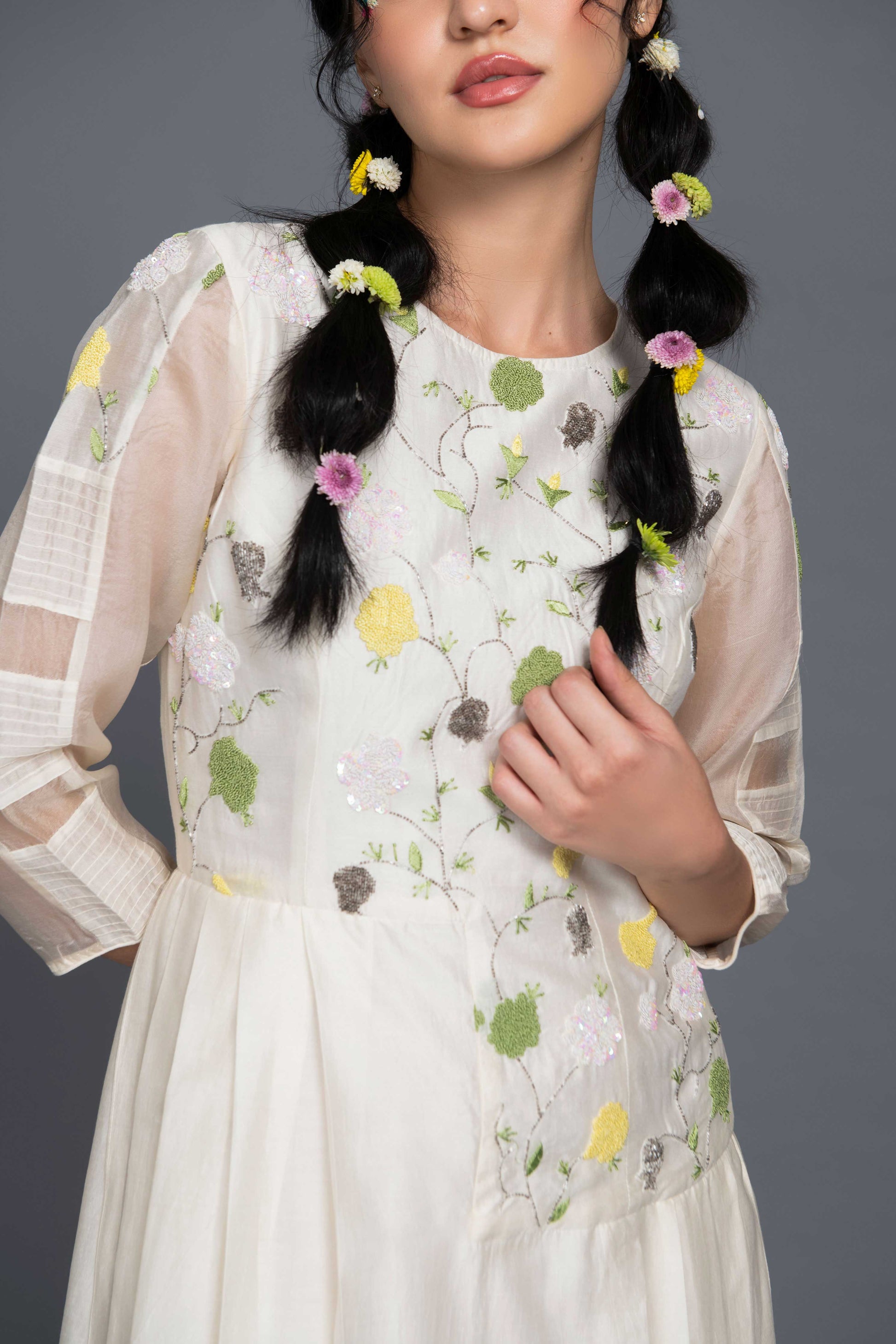 Our Embroidery wildflowers chanderi dress features exquisite hand-embroidery with wildflower floral motifs on chanderi white fabric. The dress is perfect for special occasions and cultural gatherings.