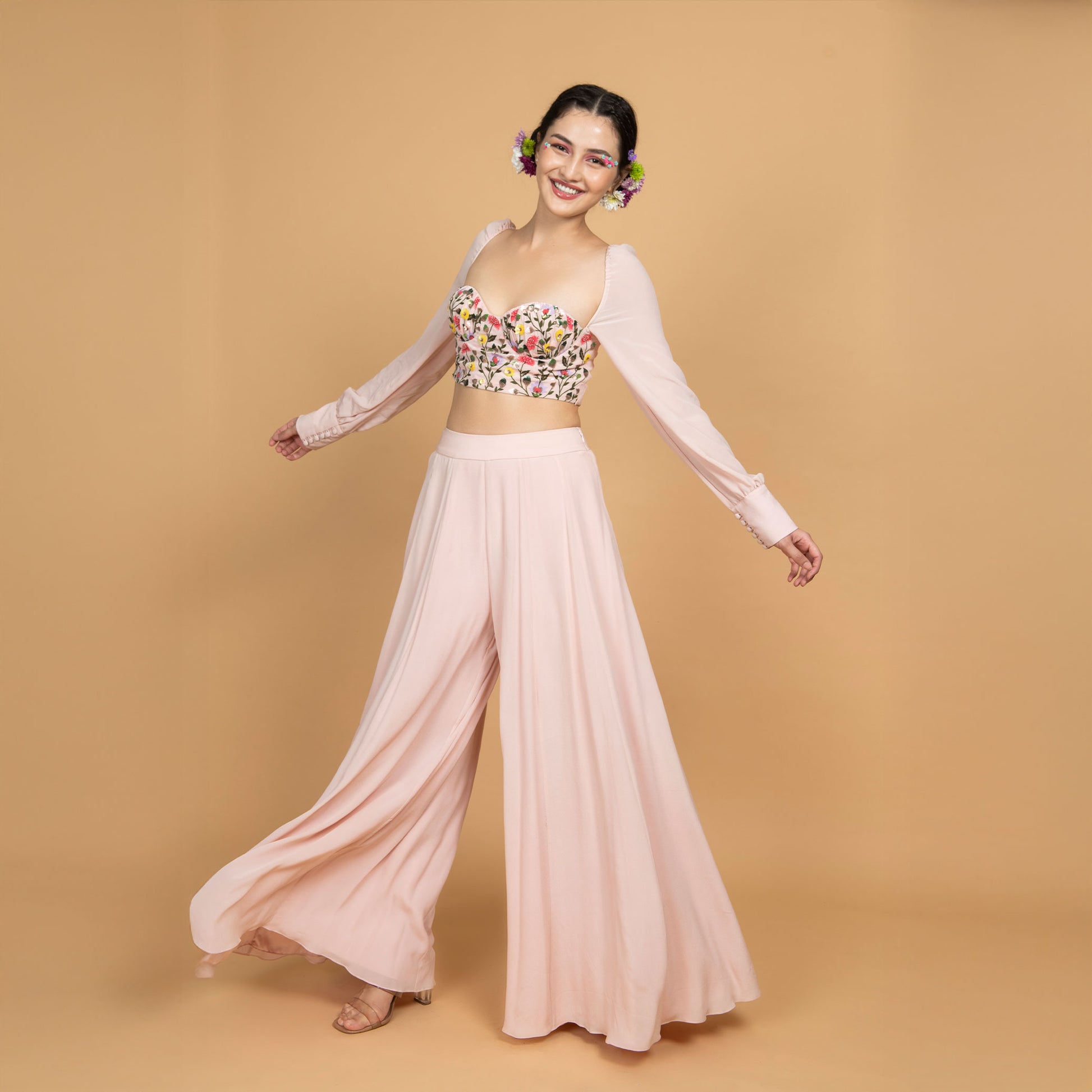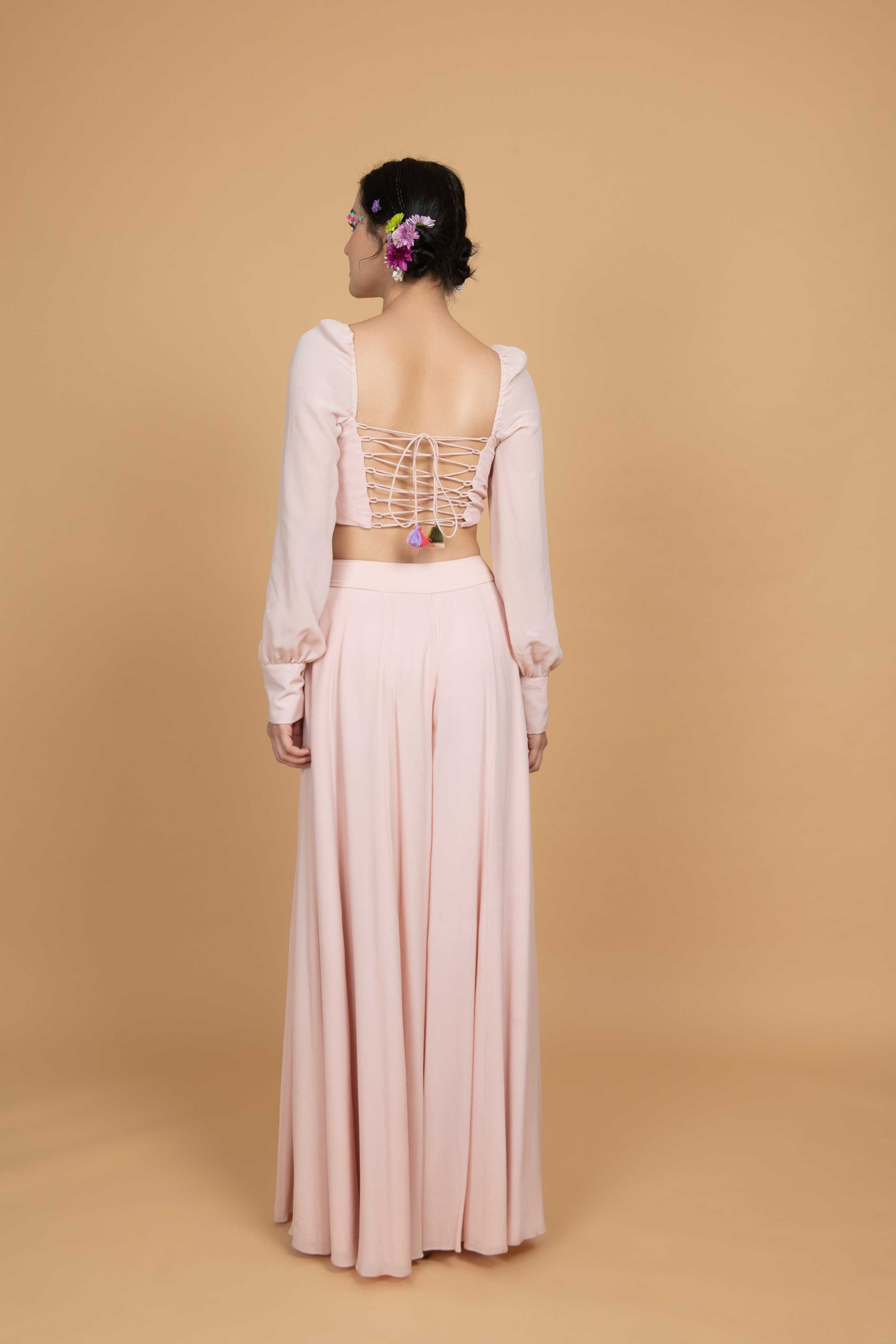 Feminine Flair Pink Co-Ord Set comes with crepe corset top, adorned with intricate hand-embroidered details, paired with flaired crepe pants allowing ease of movement with chic silhouette. It is a perfect blend of style, comfort and elegance.