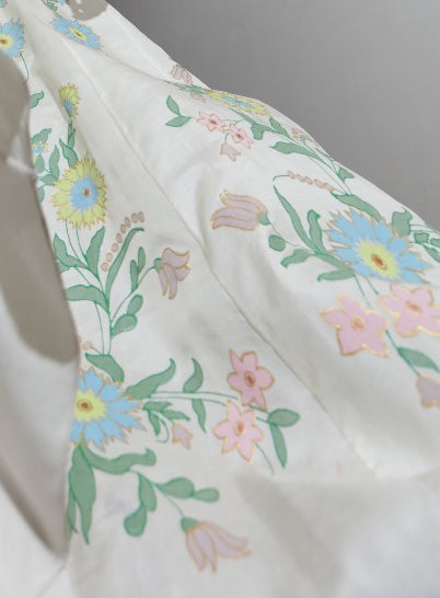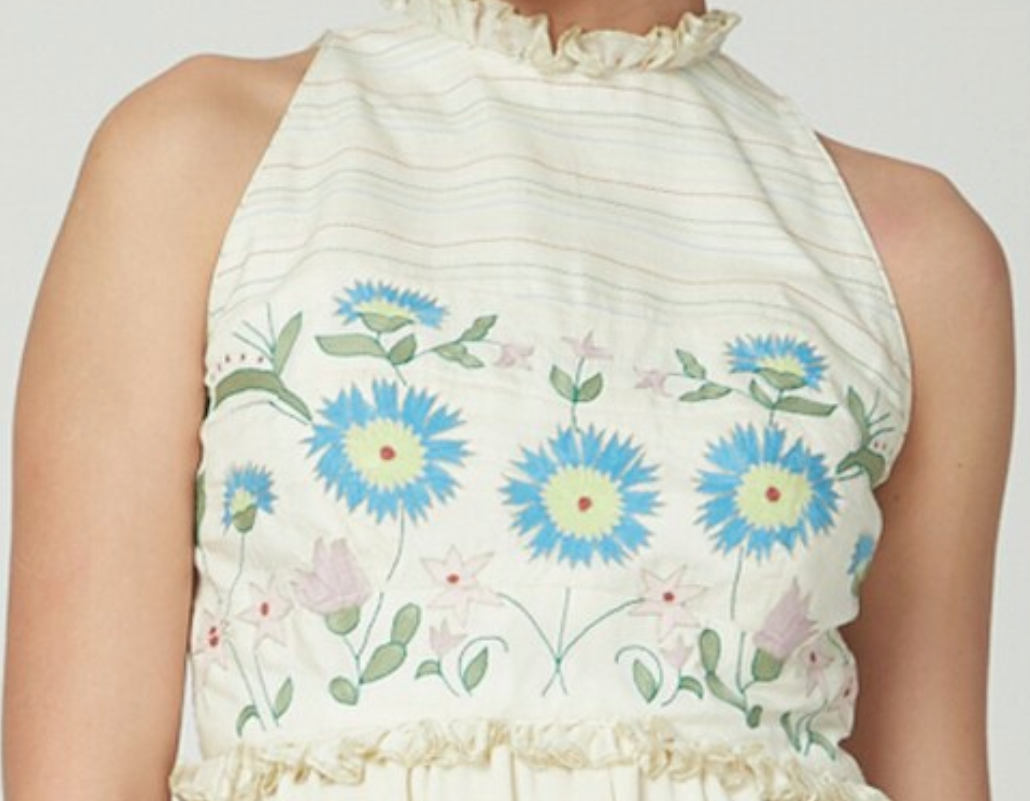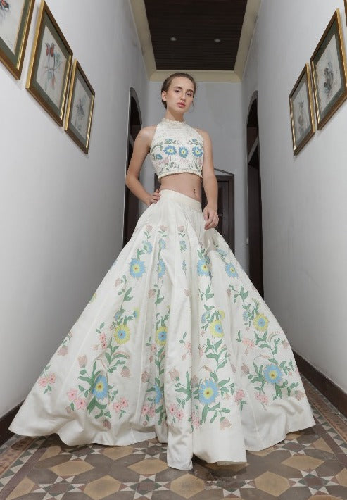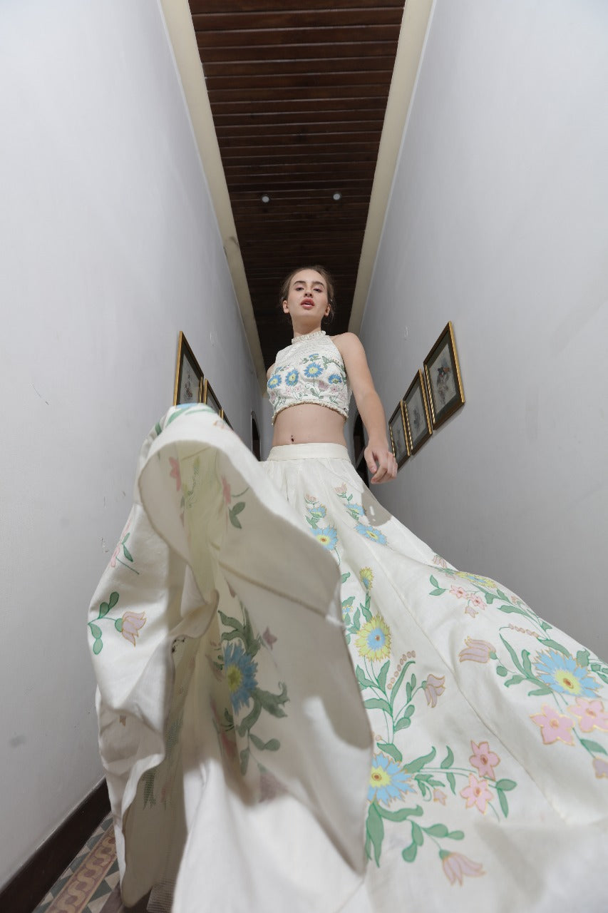 "Off-White chanderi skirt , hand-painted with light blue & pink "forget me not" flowers paired with an hand-embroidered thread work crop-top"