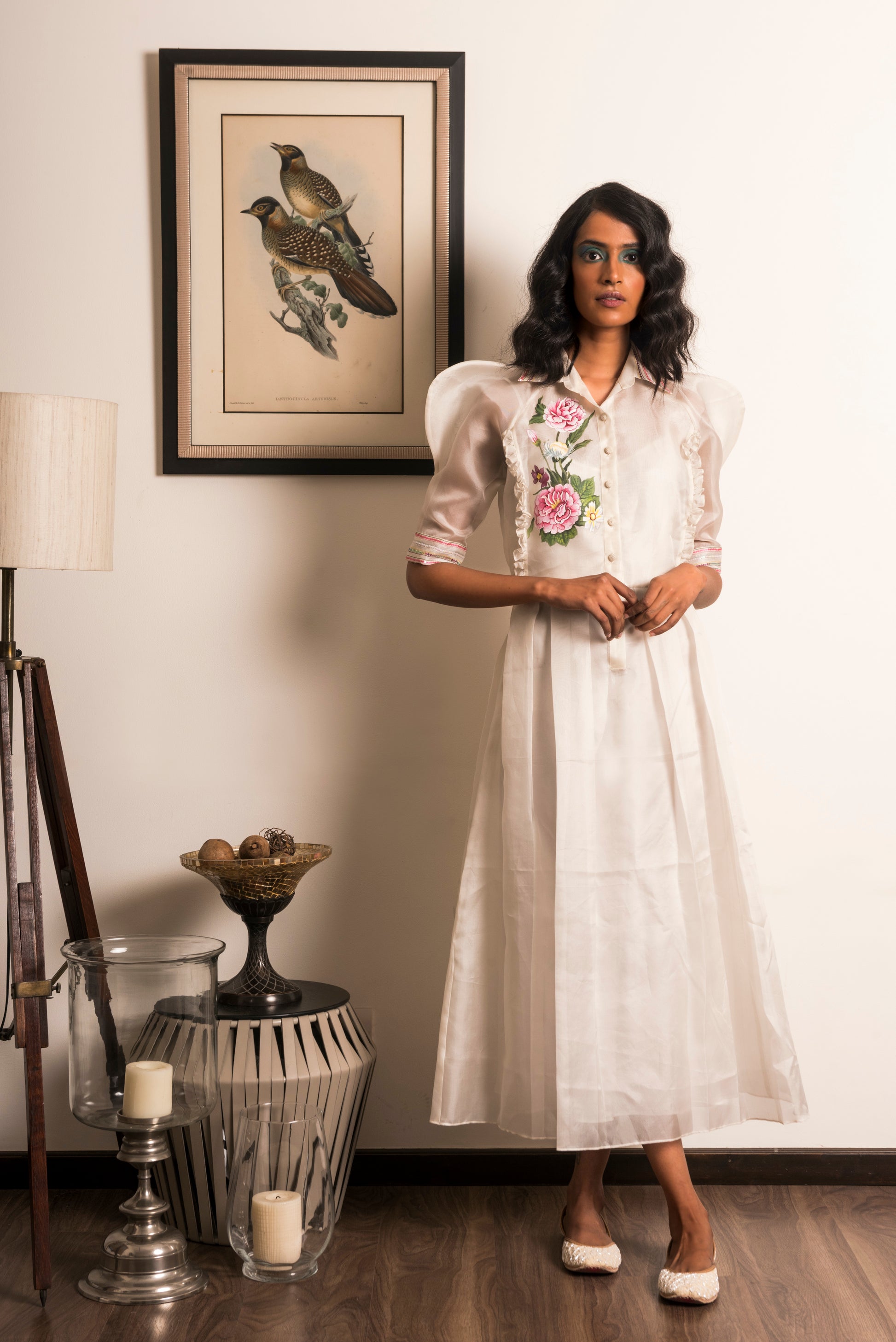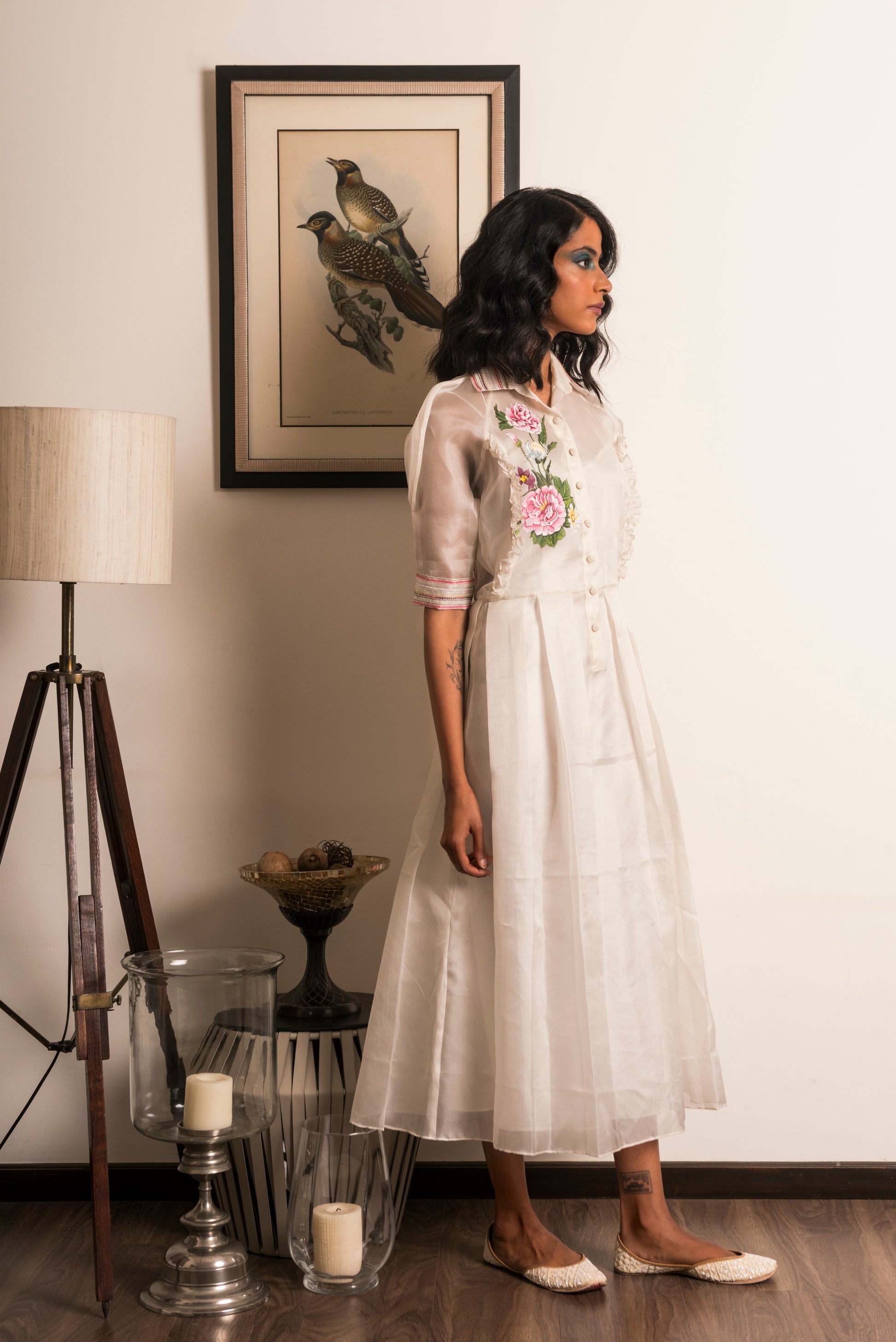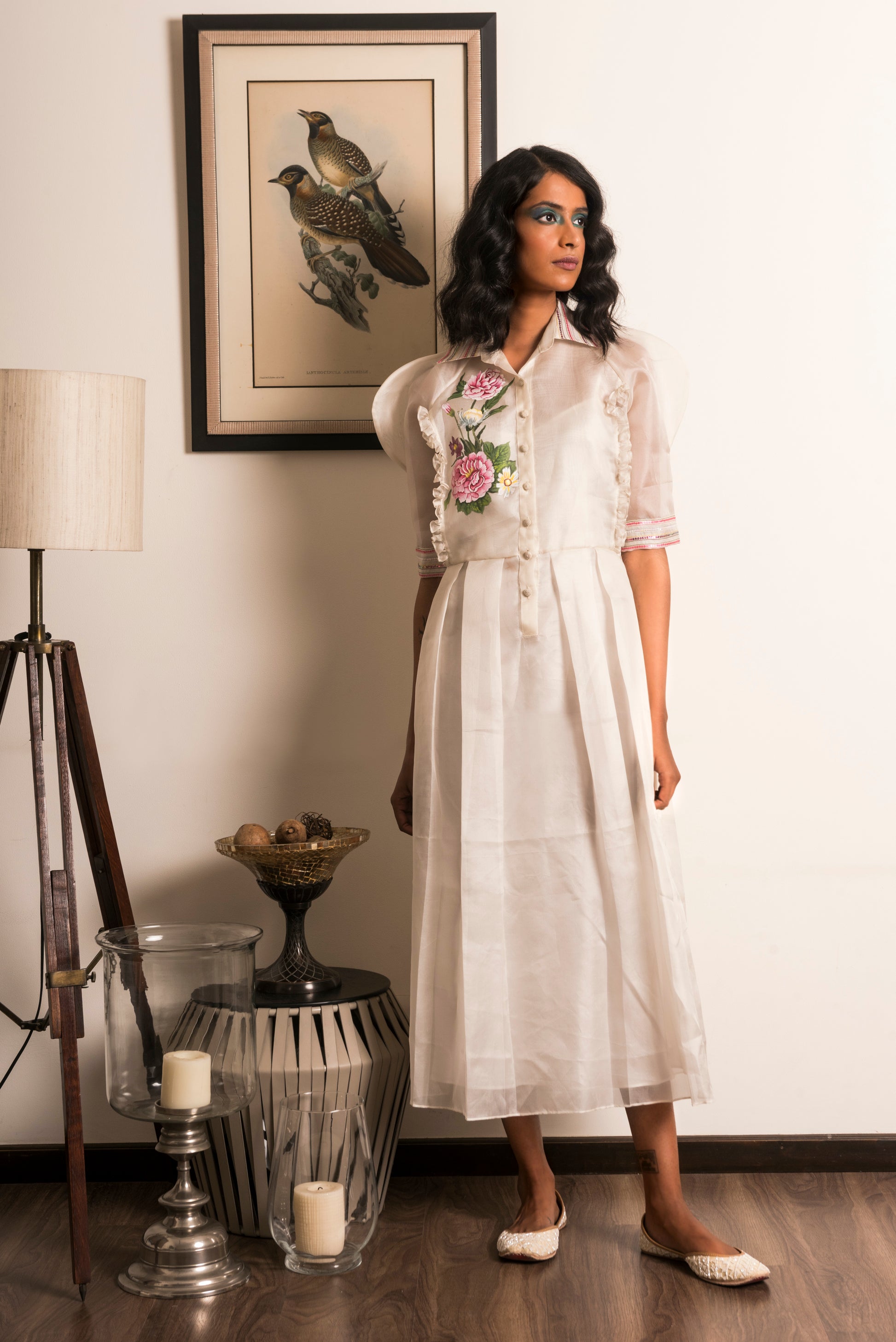 "Powder white box pleated Organza dress, hand-painted with pink Dahlias along with a matching camisole slip."
