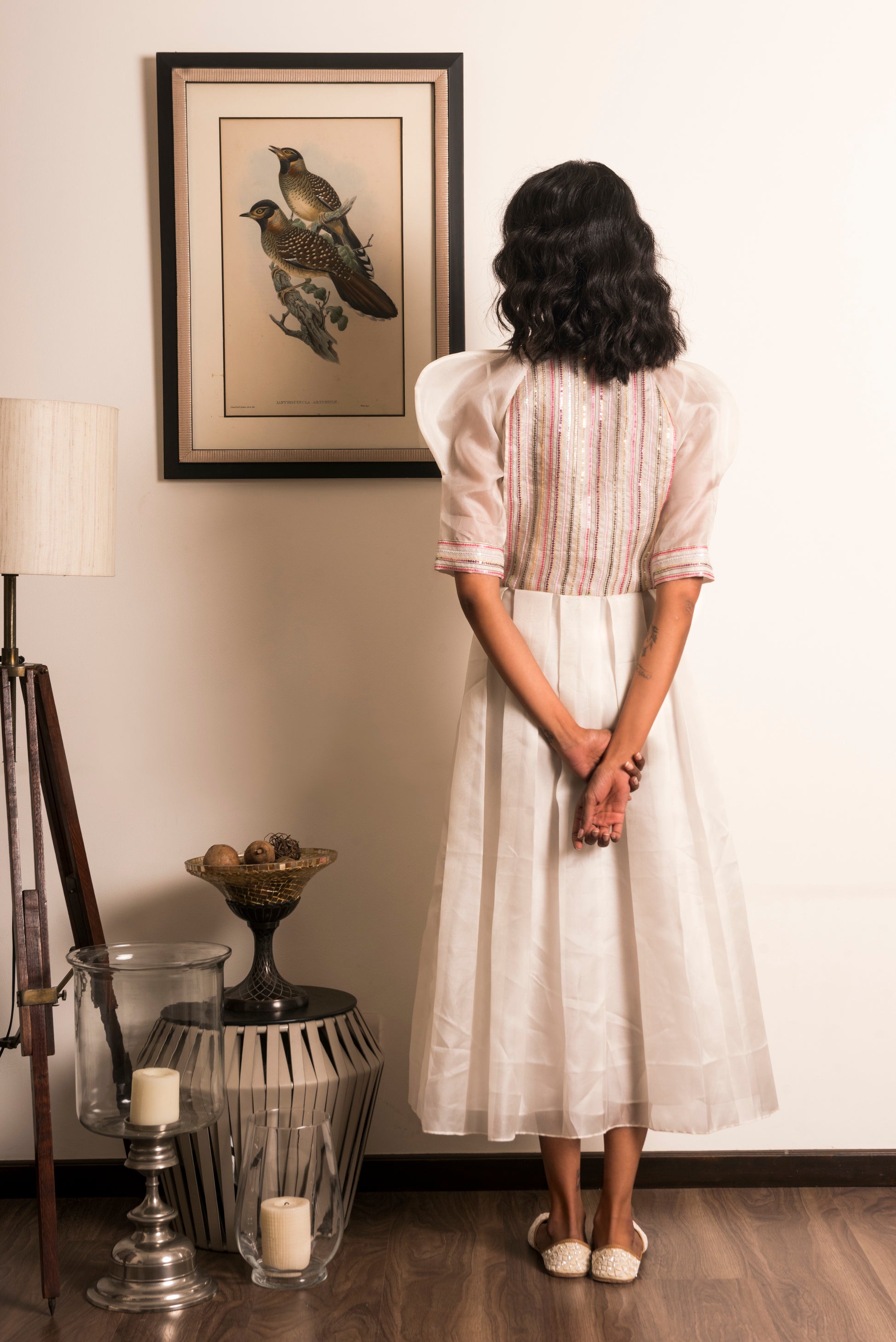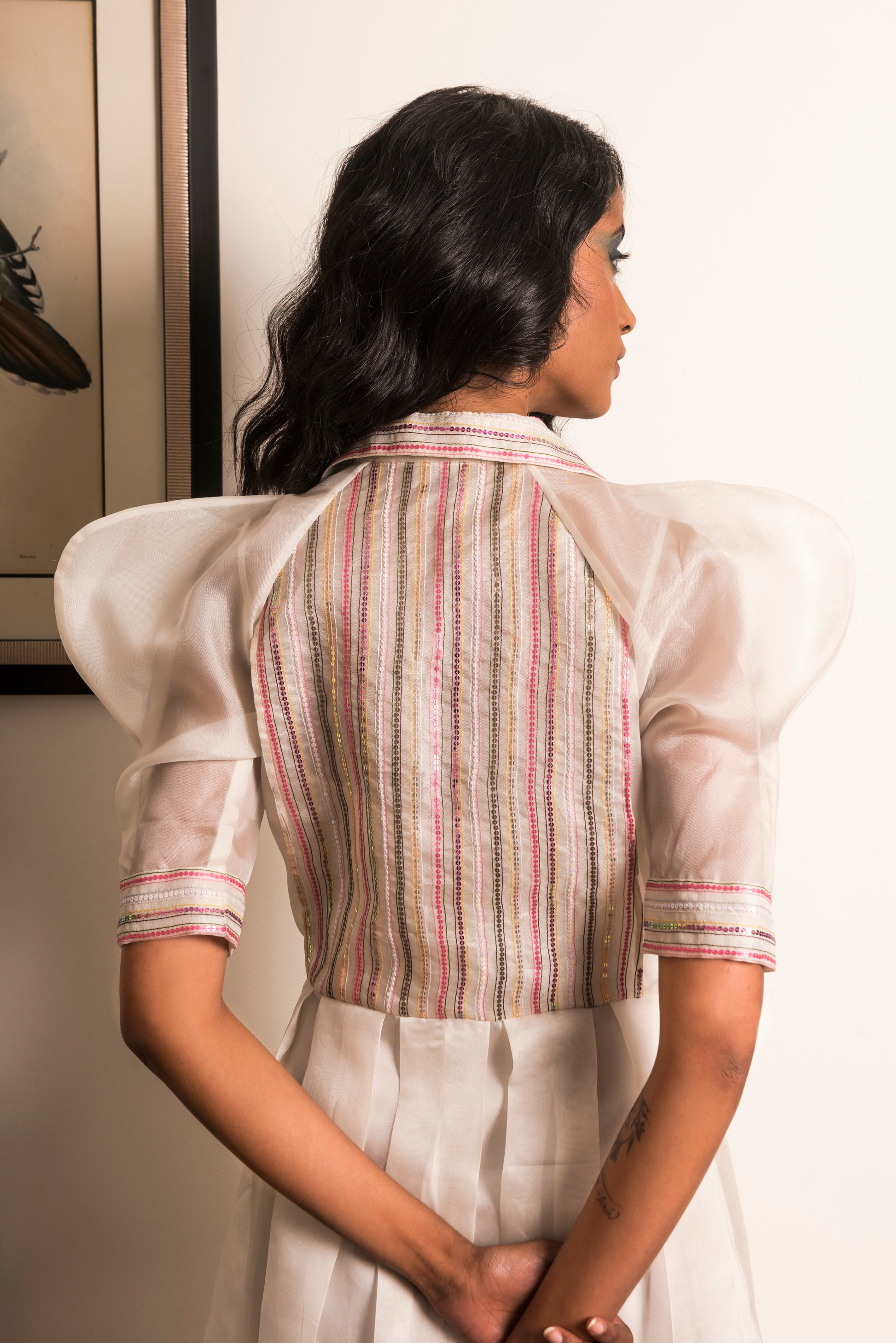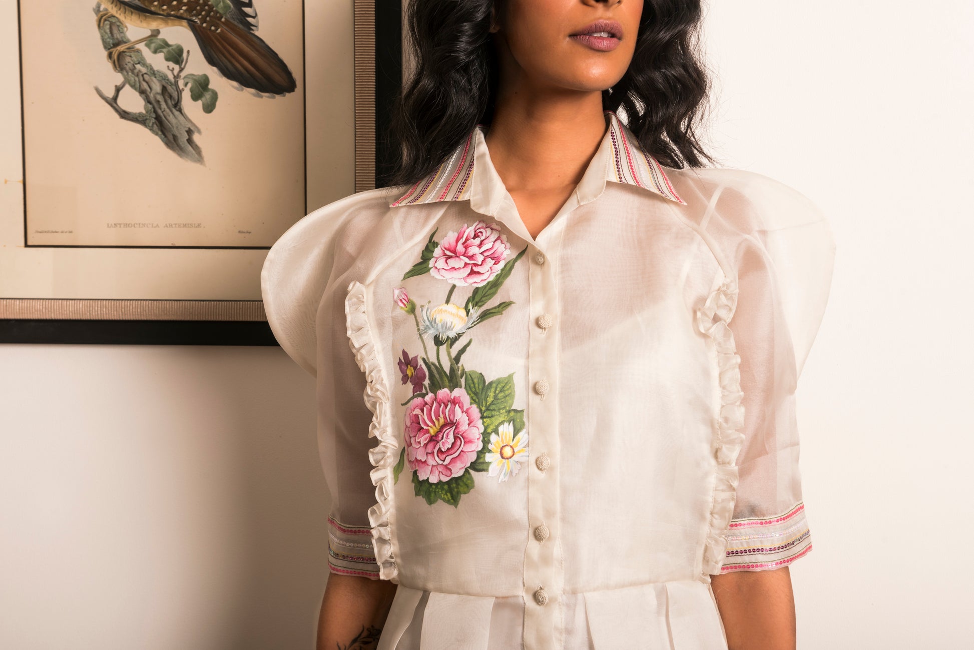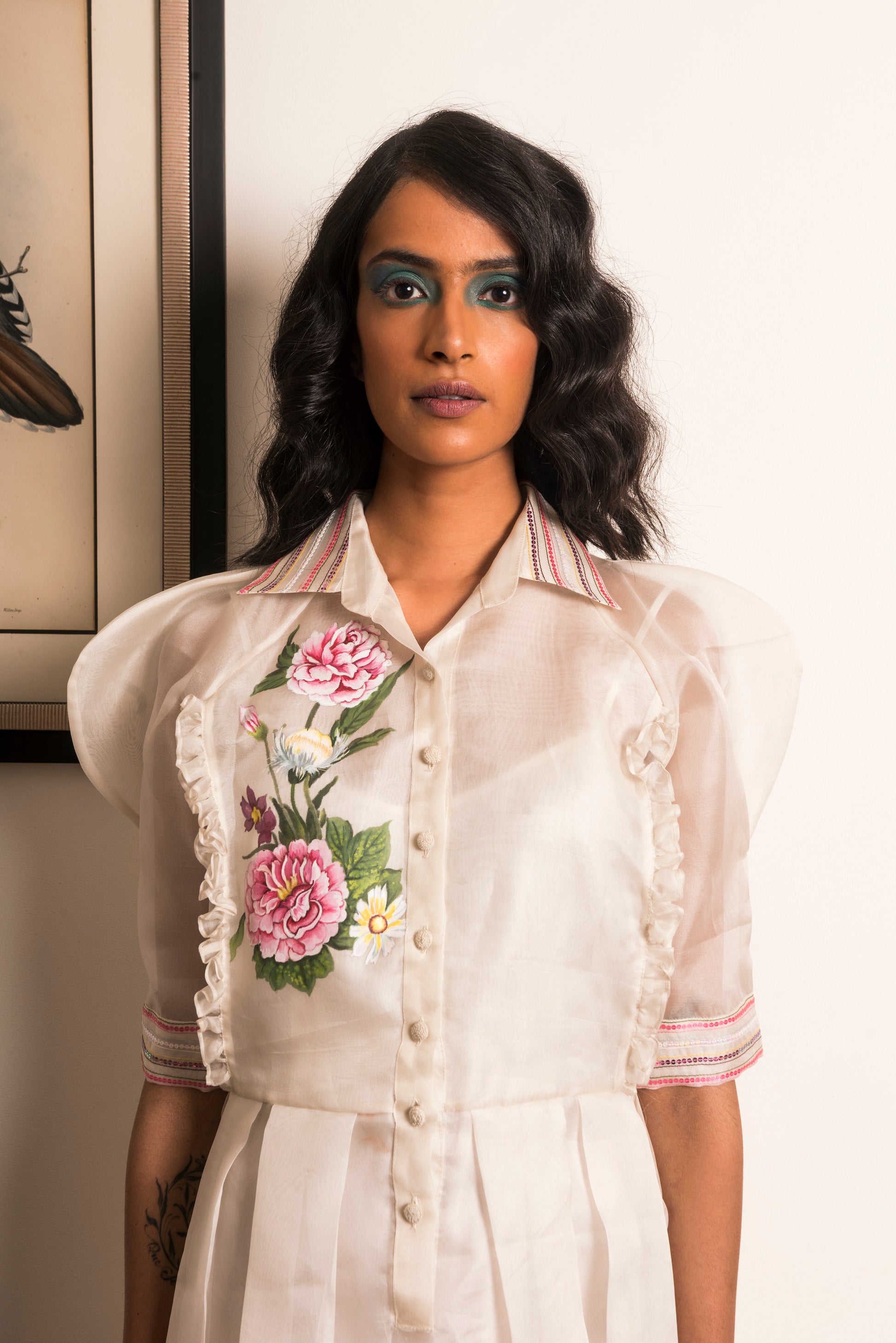 "Powder white box pleated Organza dress, hand-painted with pink Dahlias along with a matching camisole slip."