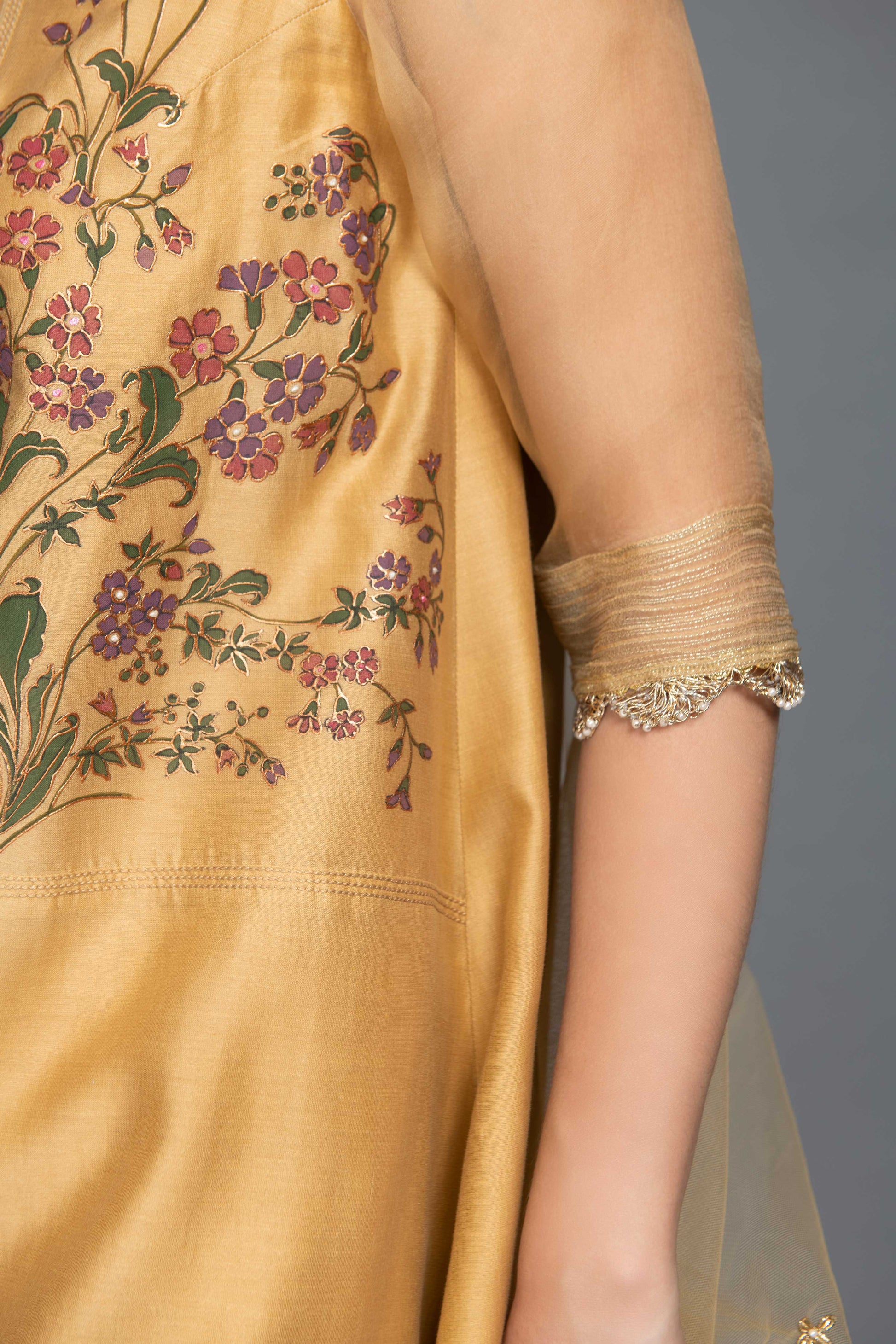 The Golden Garden Beige Suit Set is a masterpiece with intricate hand-painted floral panels and golden highlights in the kurta with thread detailing in the centre. The high waisted fitted pants showcases meticulous thread detailing for an elevated look, paired with hand-embroidered naksi zari dupatta that embraces your unique charm.