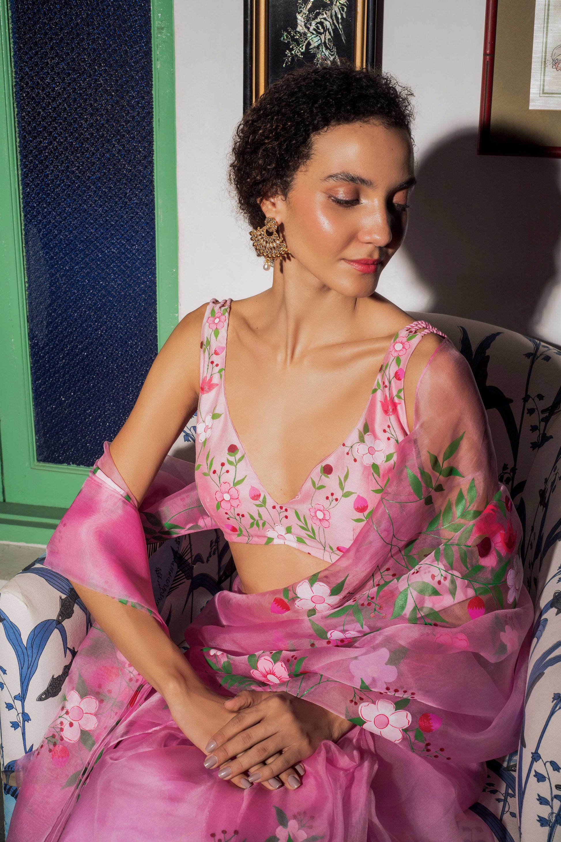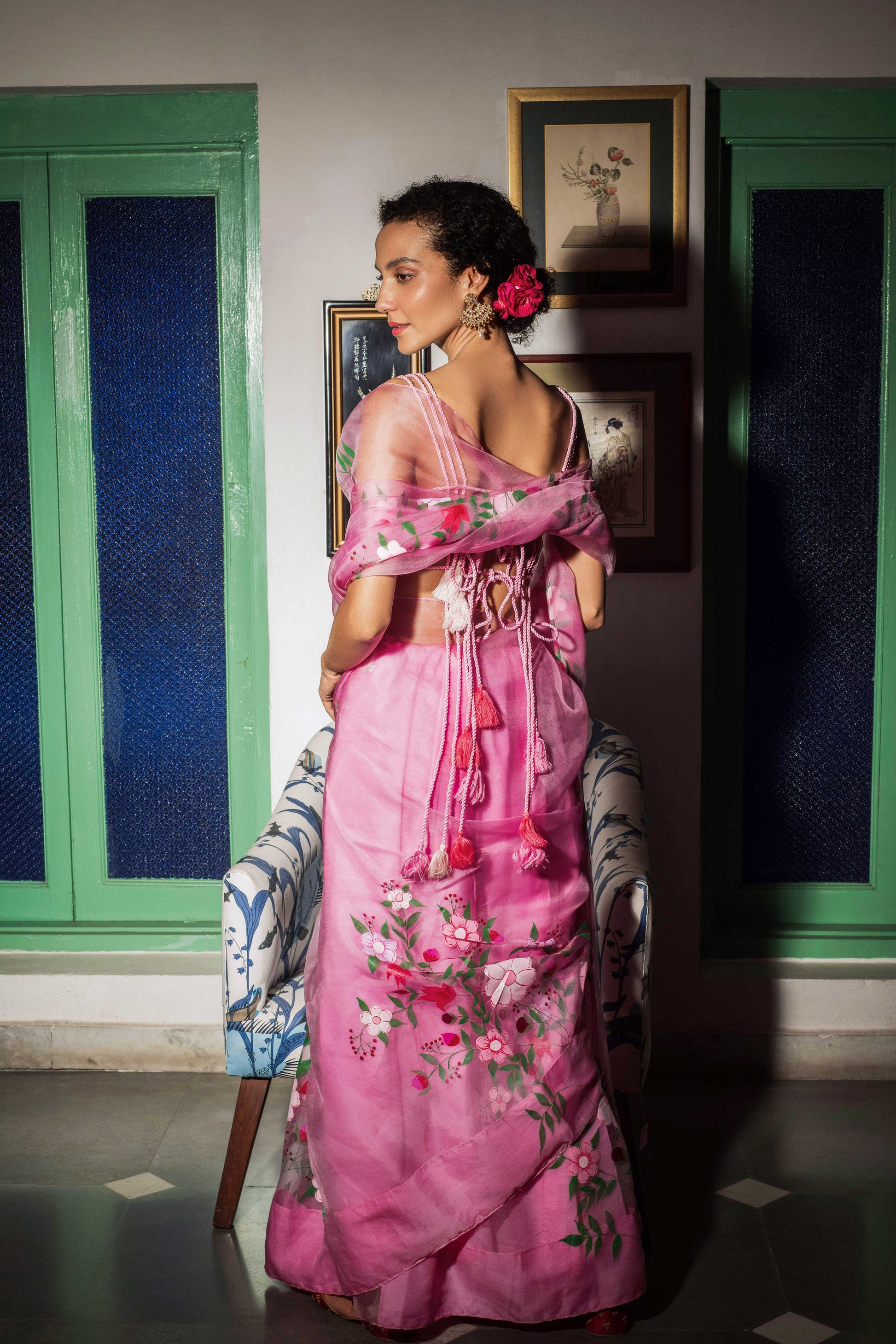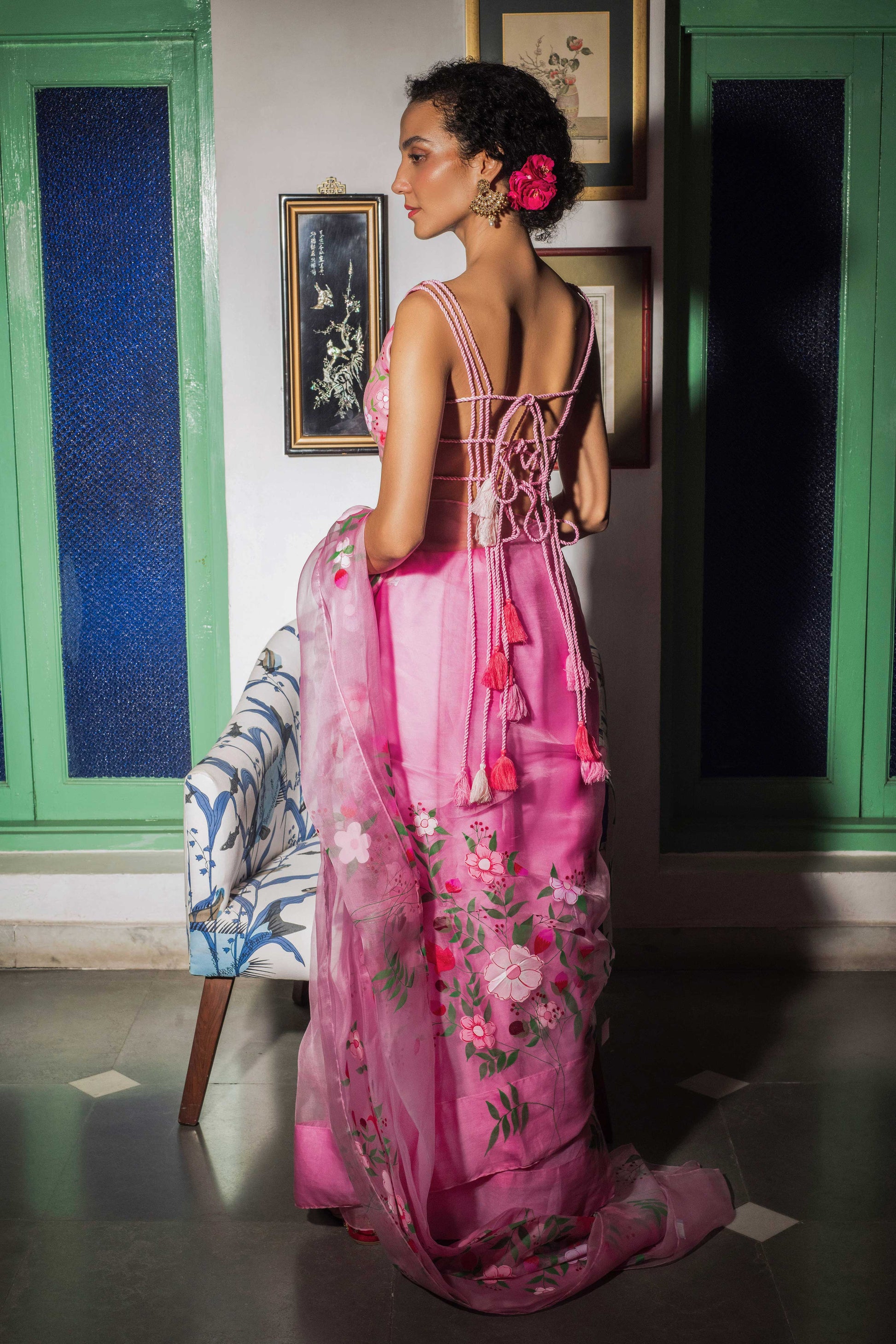 Pink organza hand painted saari paired with a matching hand painted backless Chanderi blouse with tassel detailing on the back.