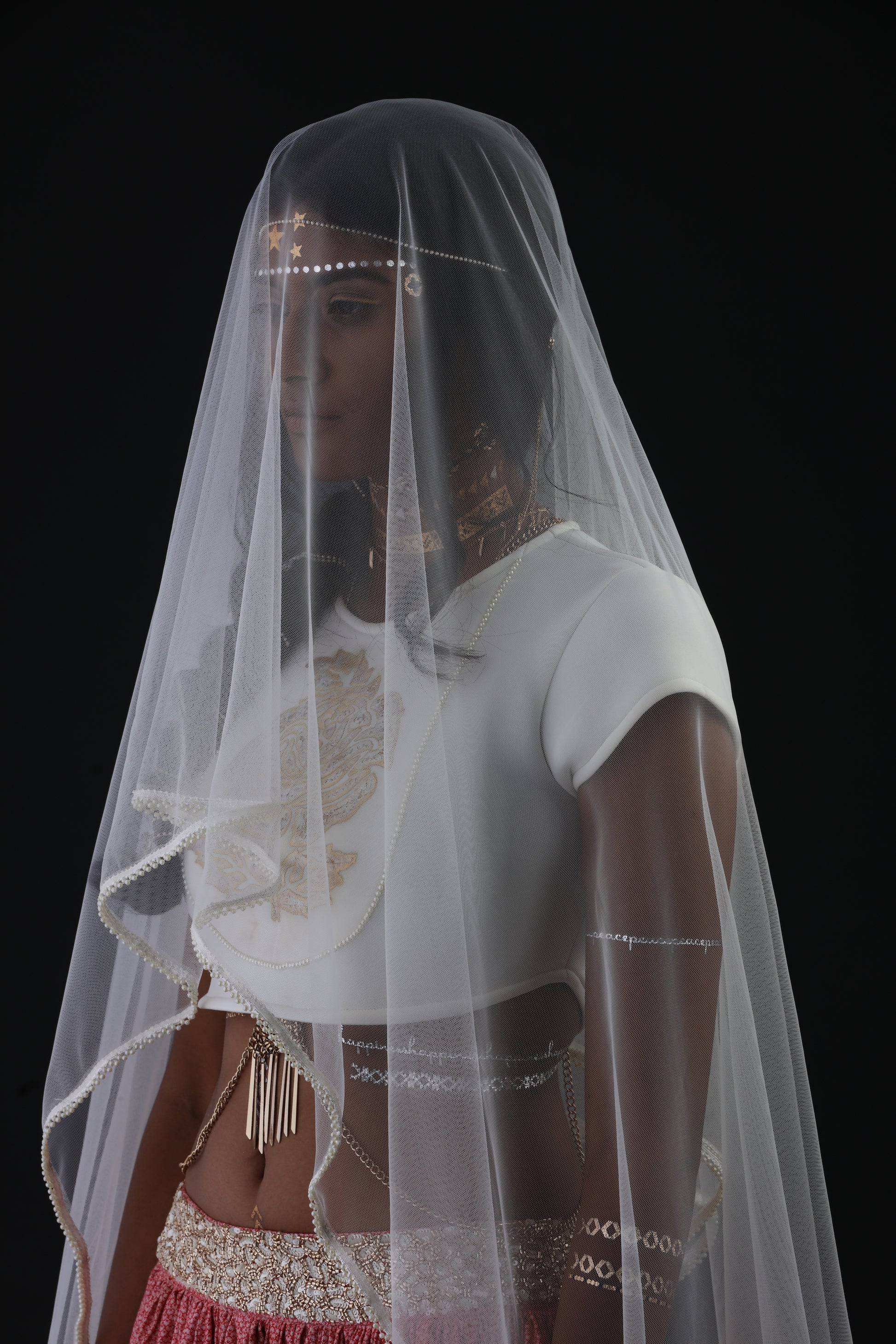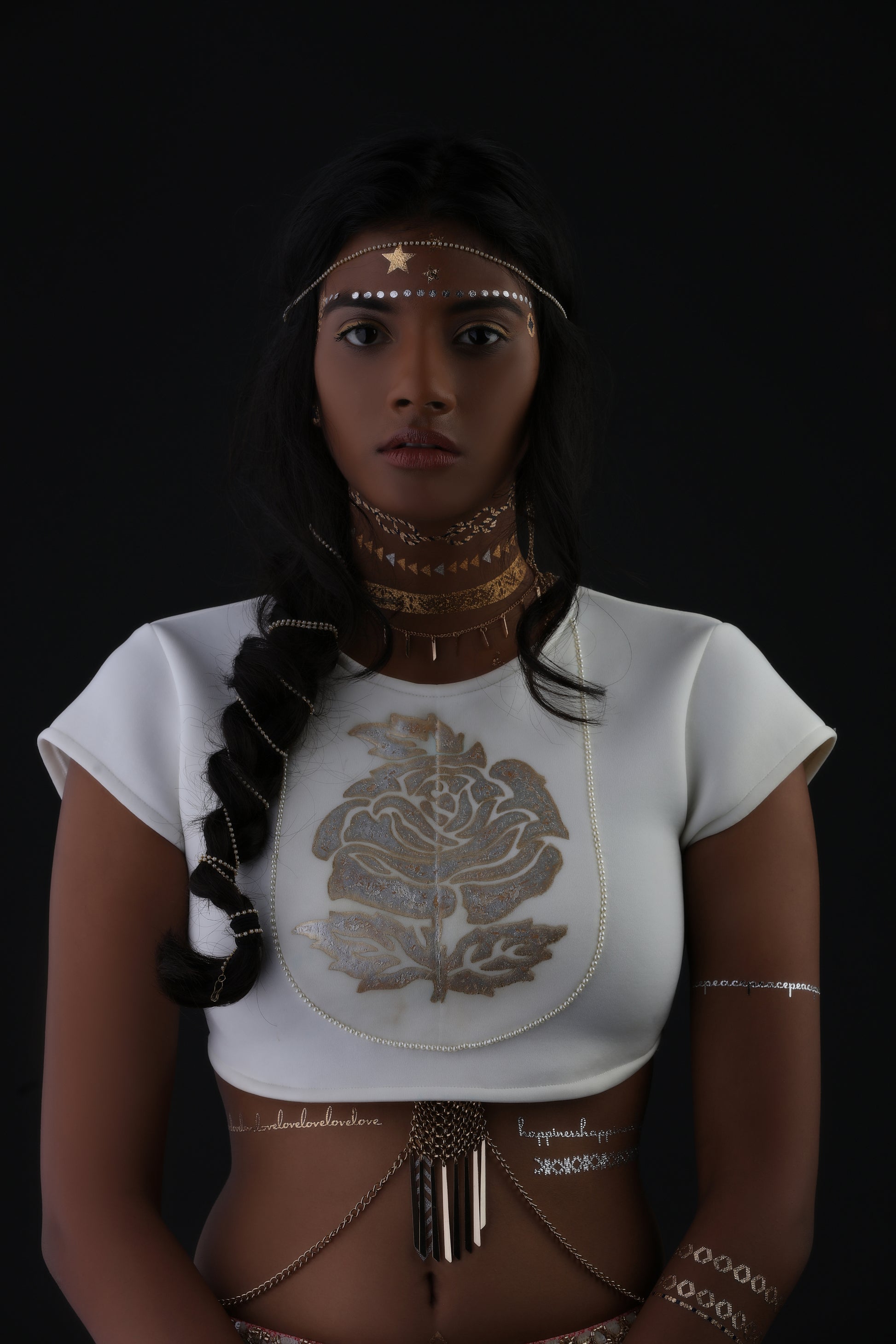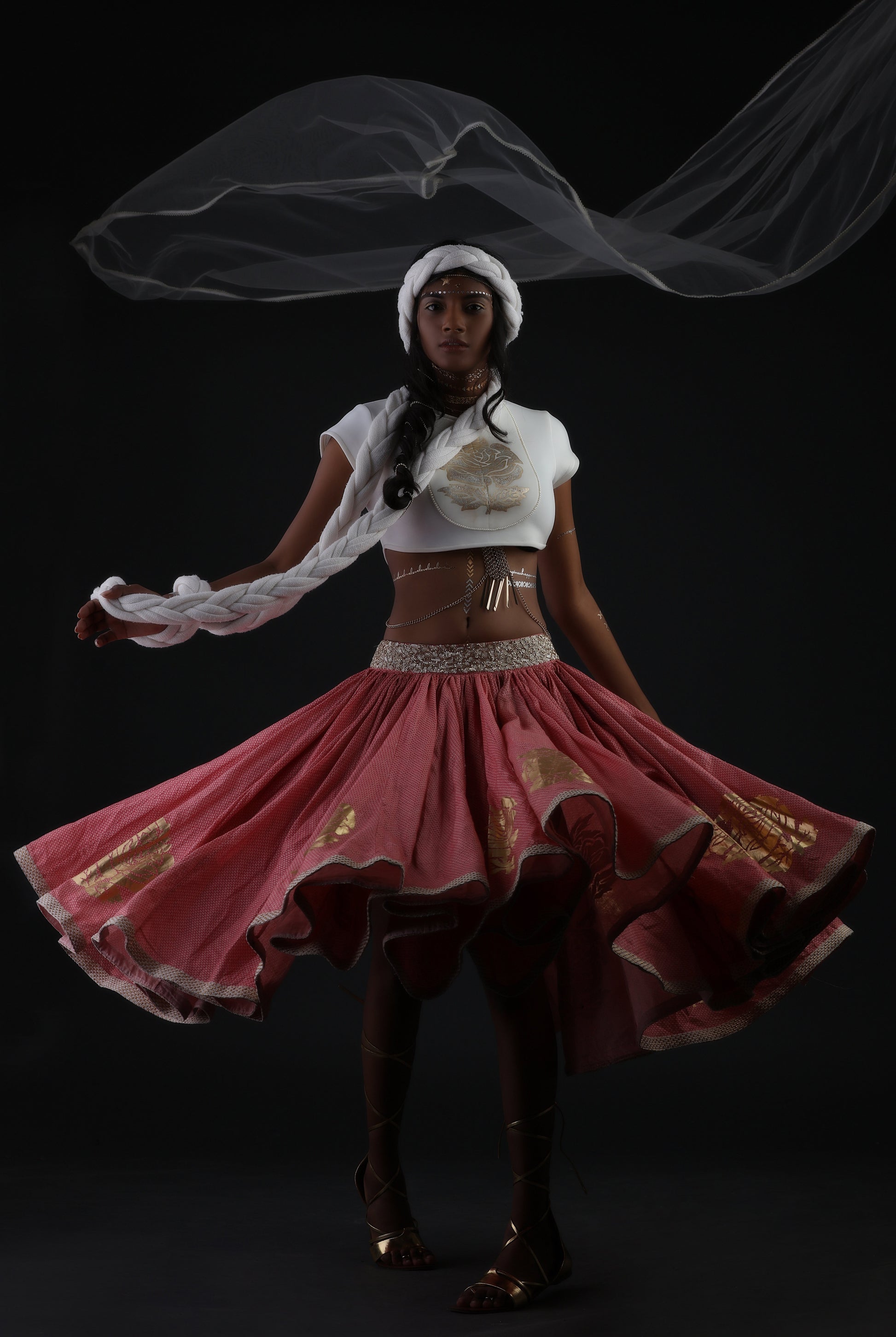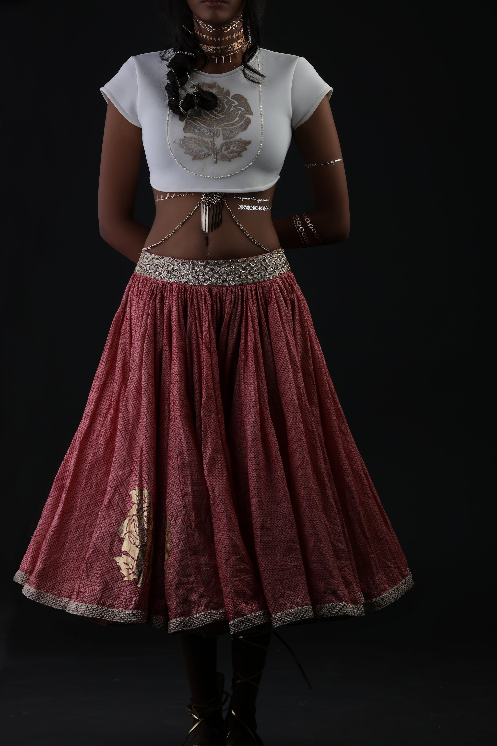"Vintage cotton block printed ghagara , paired with golden foil printed Rose neoprene crop top along with net duppatta."