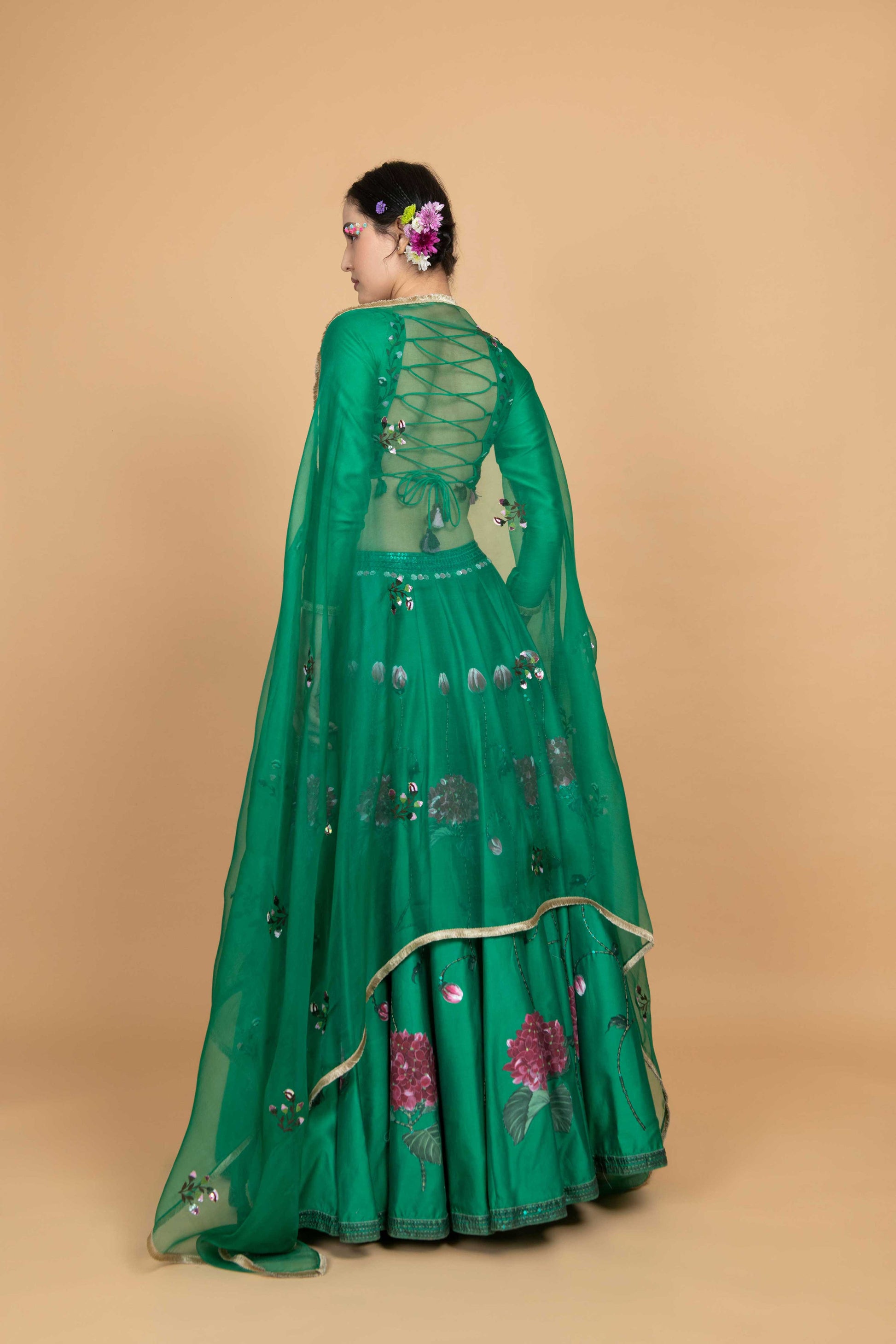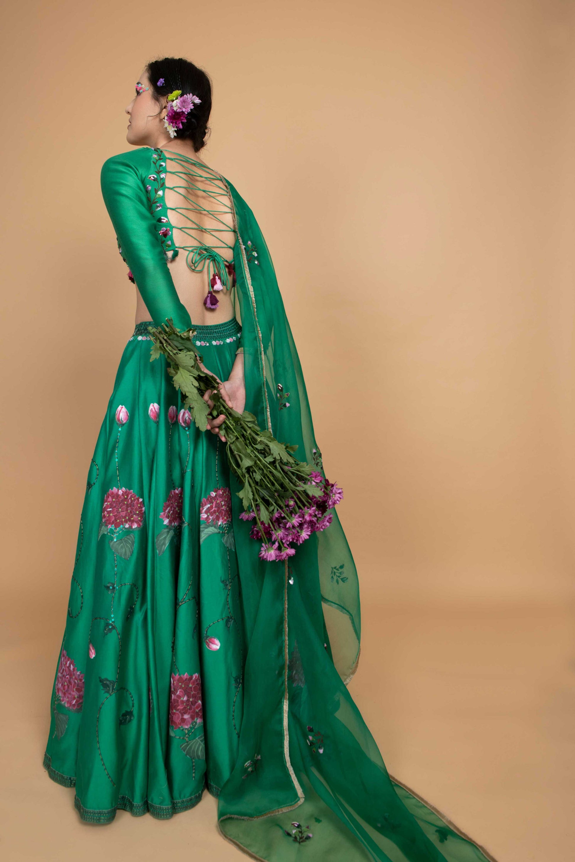 Hydrangea Skirt Set comes with hand painted details in the Green skirt inspired by bright hydrangeas highlighted with sequins and a detailed waistband. The top is Green in colour highlighted with subtle hand-embroidery done with sequins and threads, along with an organza dupatta that completes this enchanting ensemble.