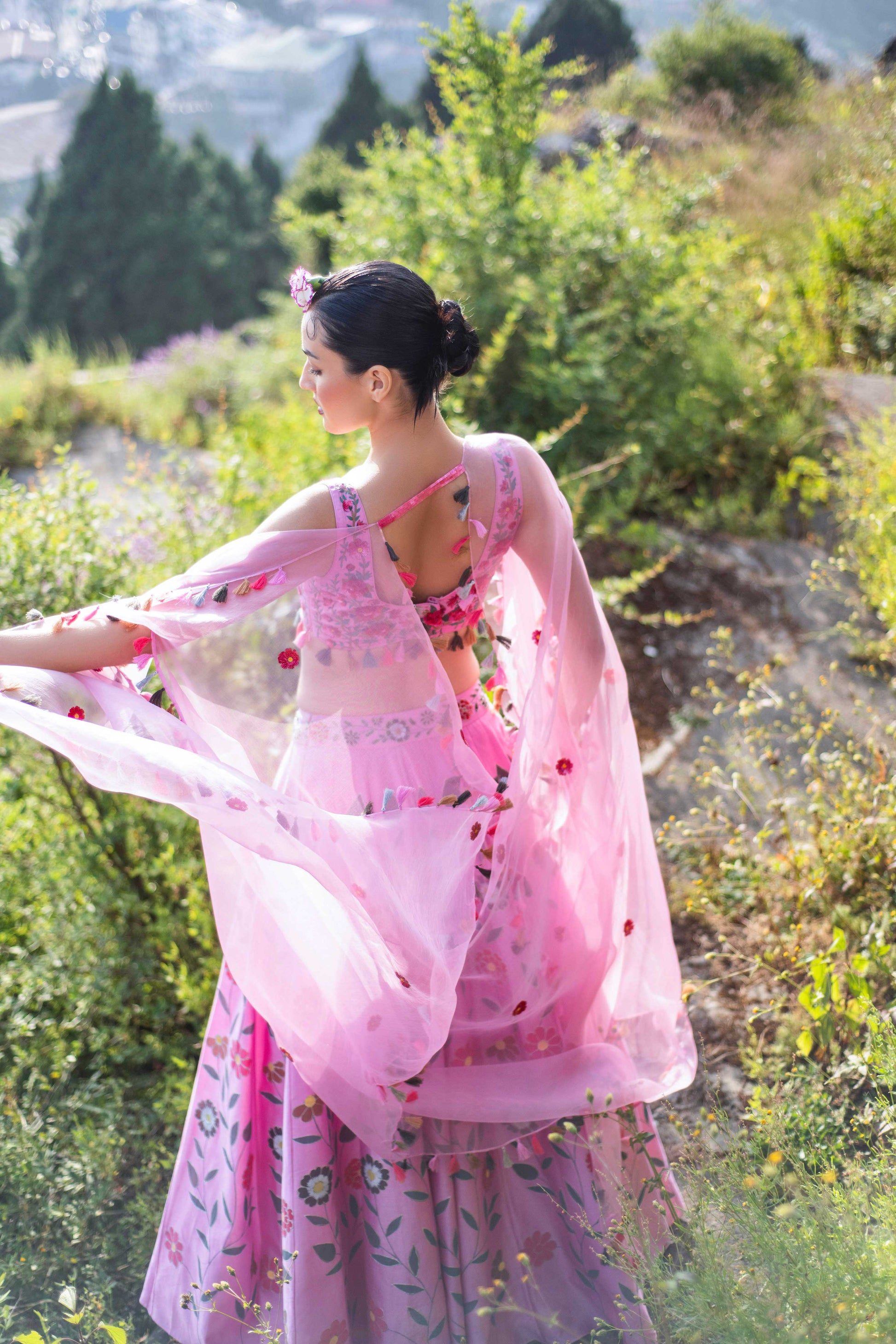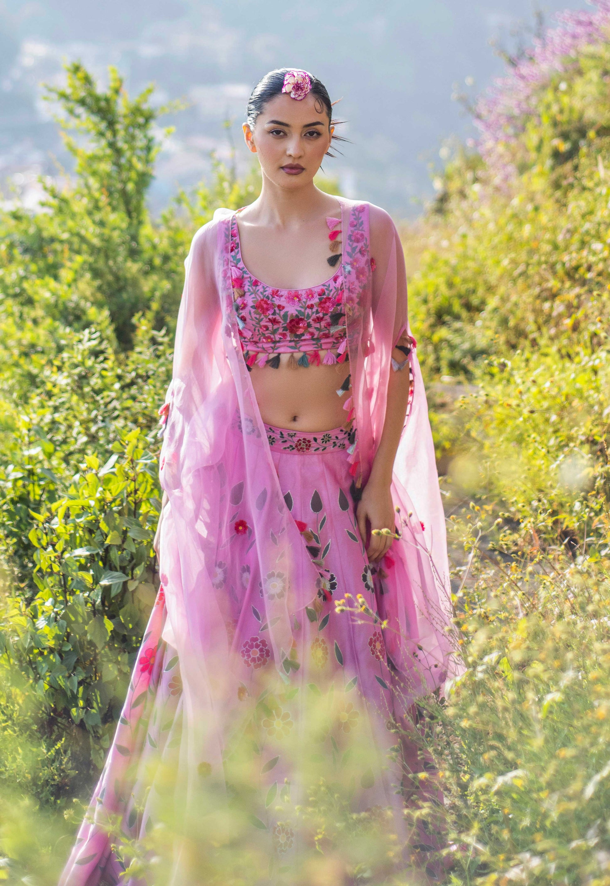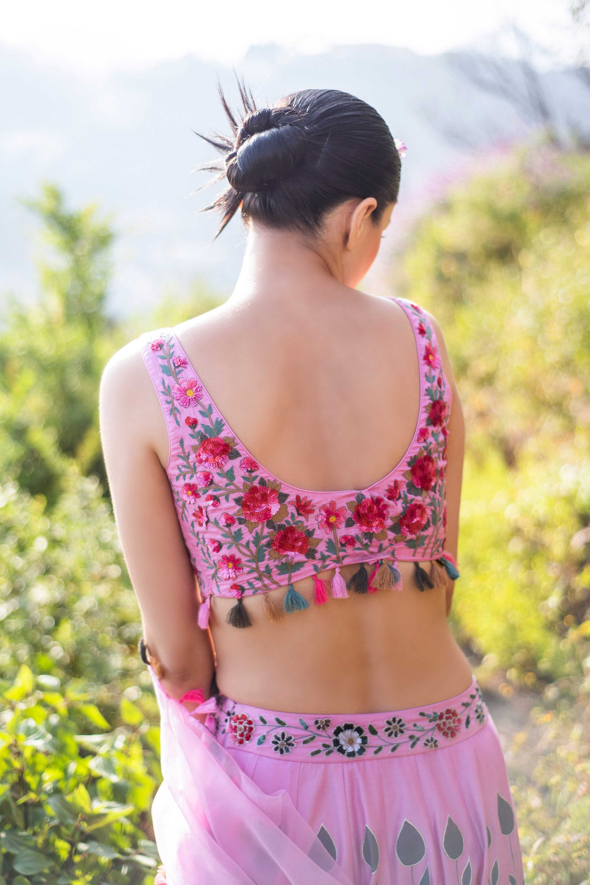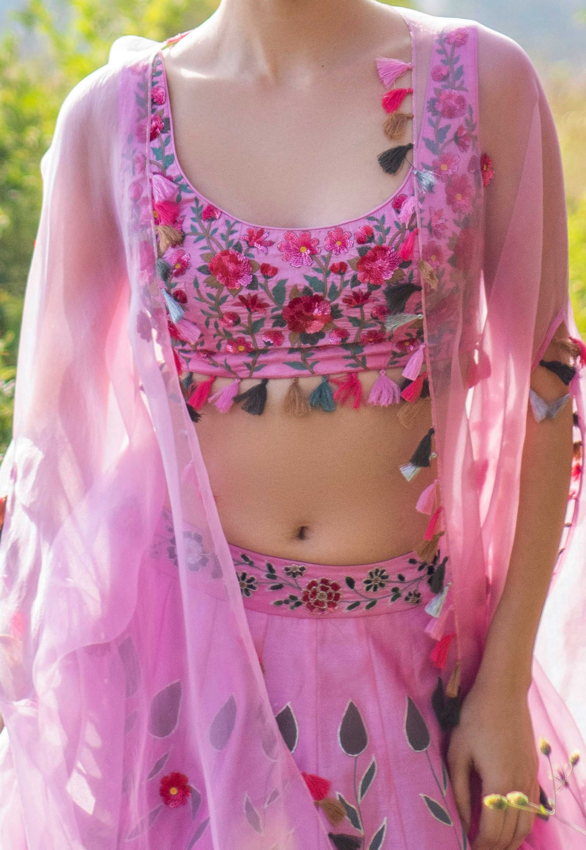 Hand-painted skirt with blooming flowers and embroidered waist band, paired with hand-embroidered blouse with tassel detailing on the hemline and a hand-embroidered delicate dreamy cape with sequins and tassel detailing.