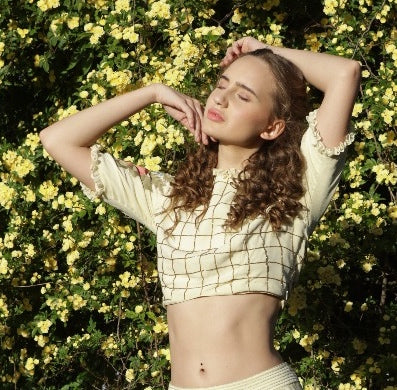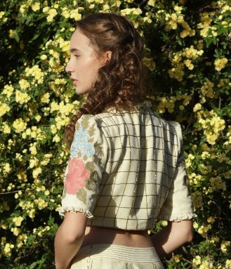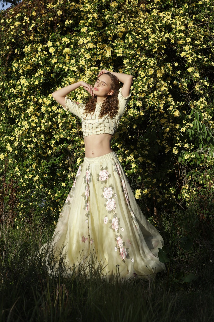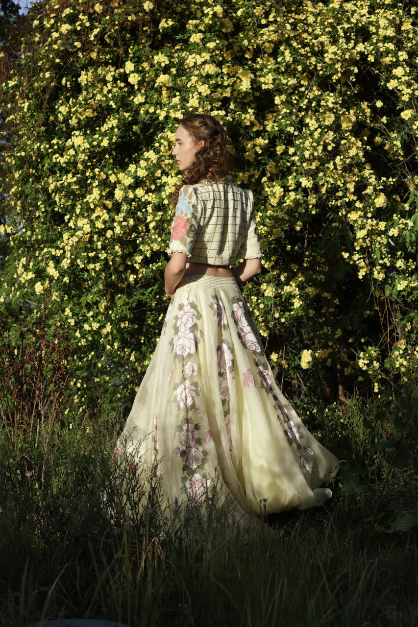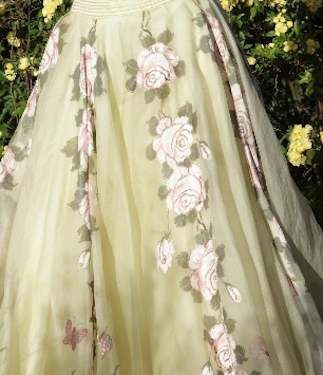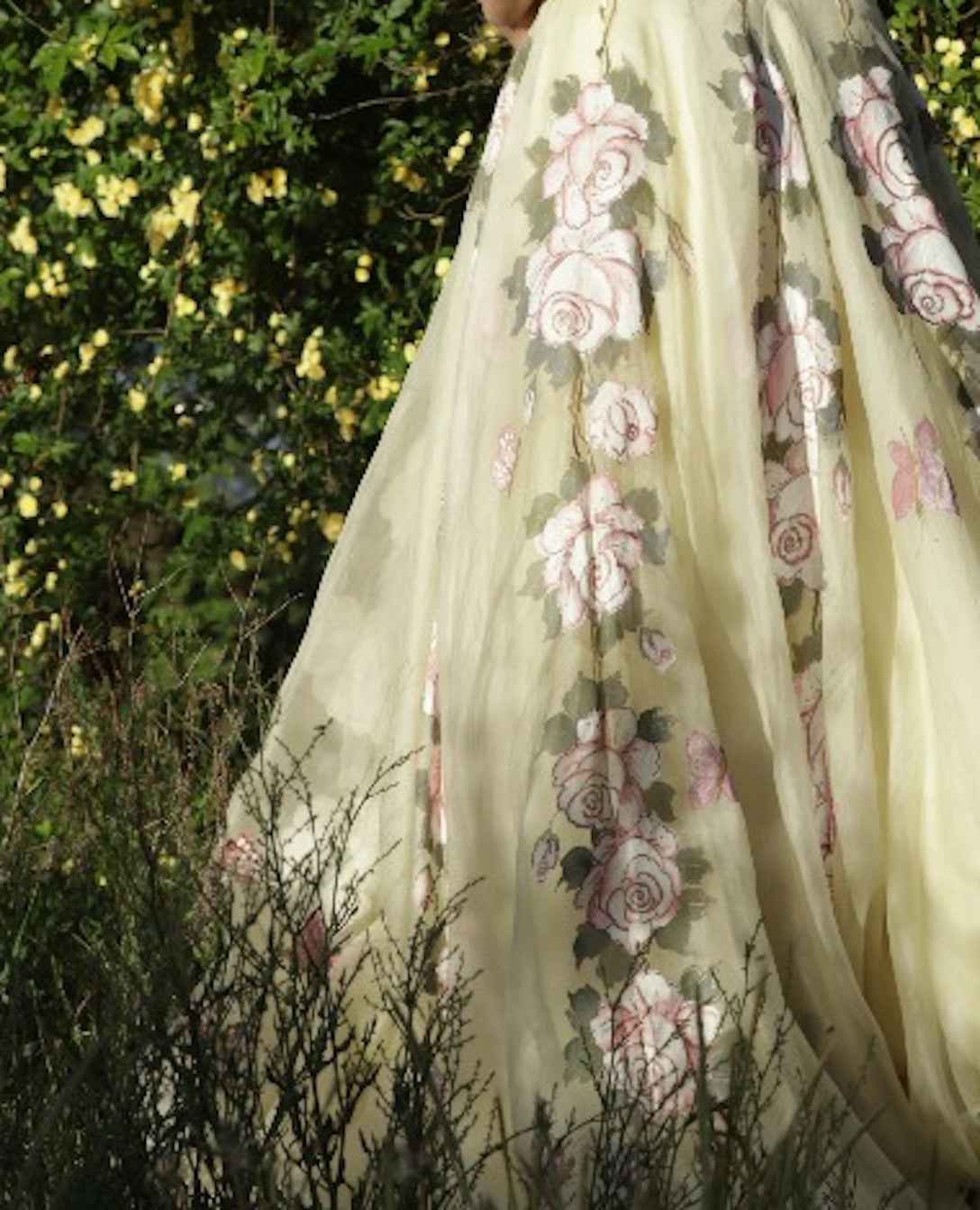 "Light yellow Organza skirt , hand-painted with white rose creepers paired with an hand-embroidered georgette top"