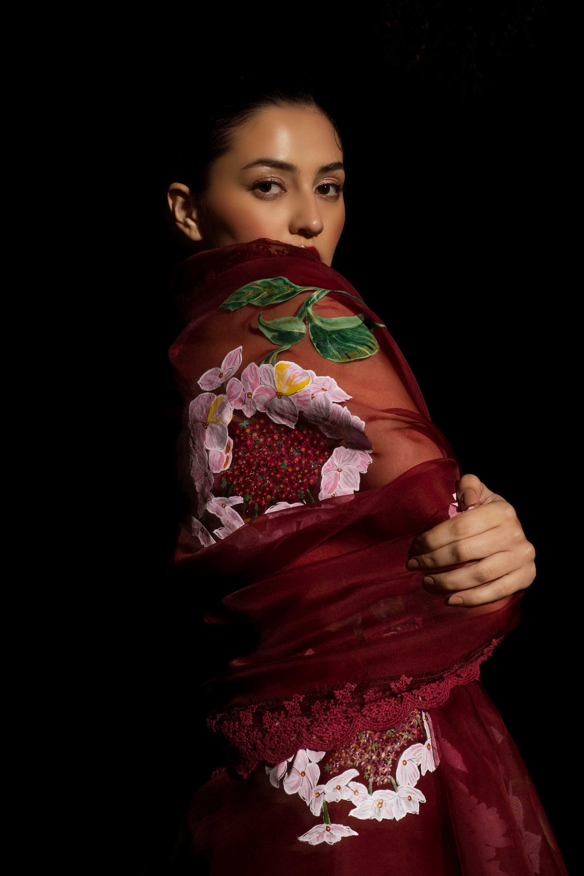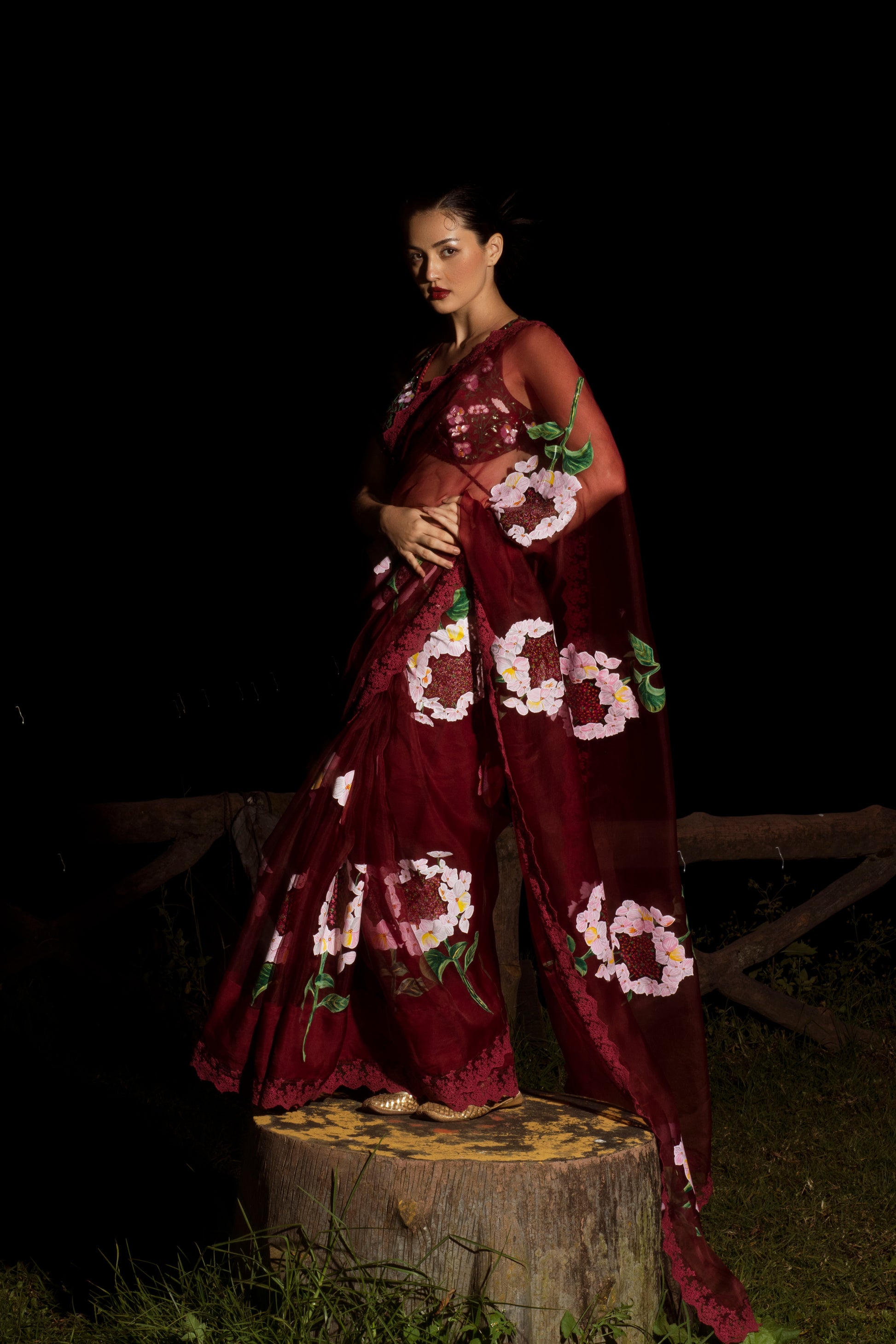 Hand-painted organza saari with Tokyo delight motif finished with delicate floral lace paired with hand embroidered sequins work Chanderi blouse.