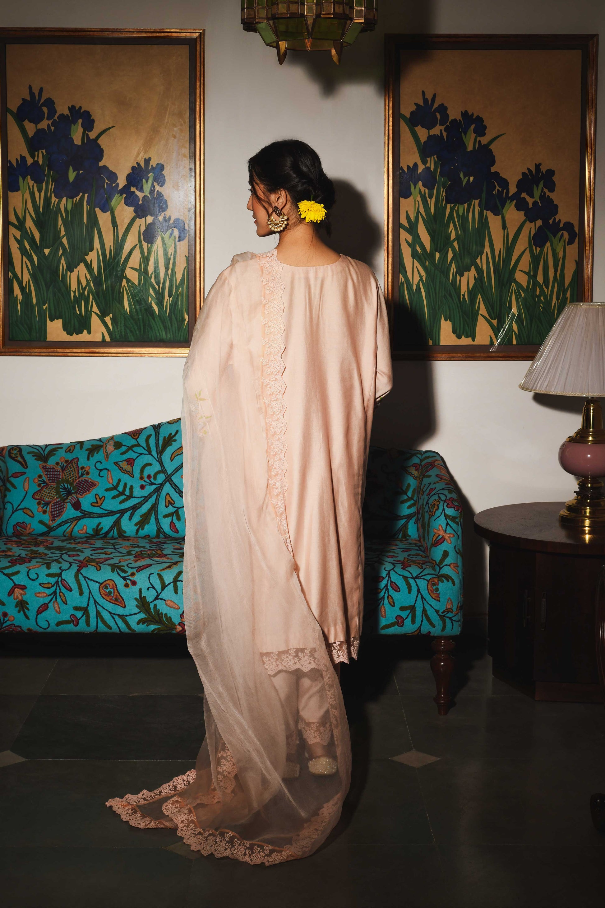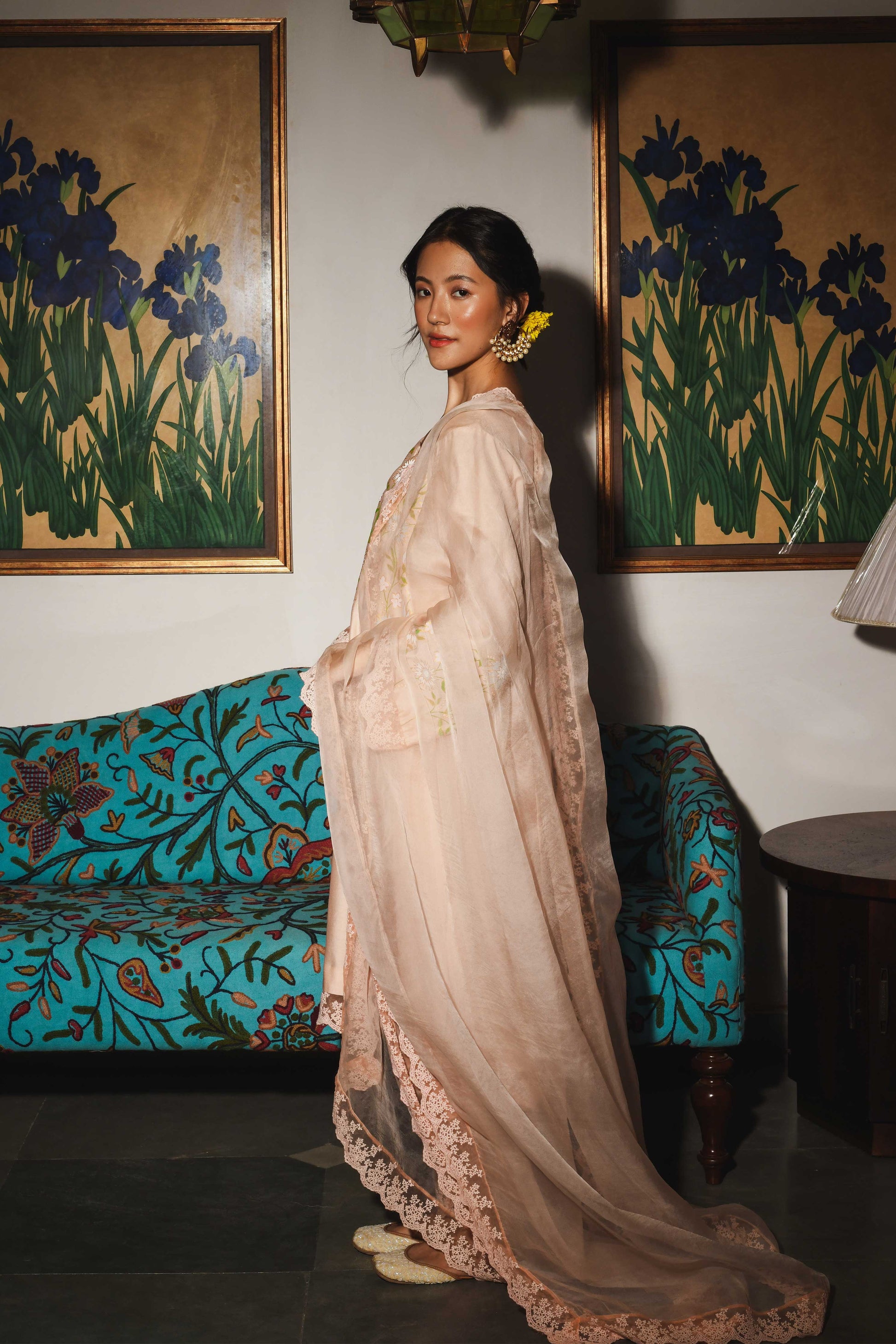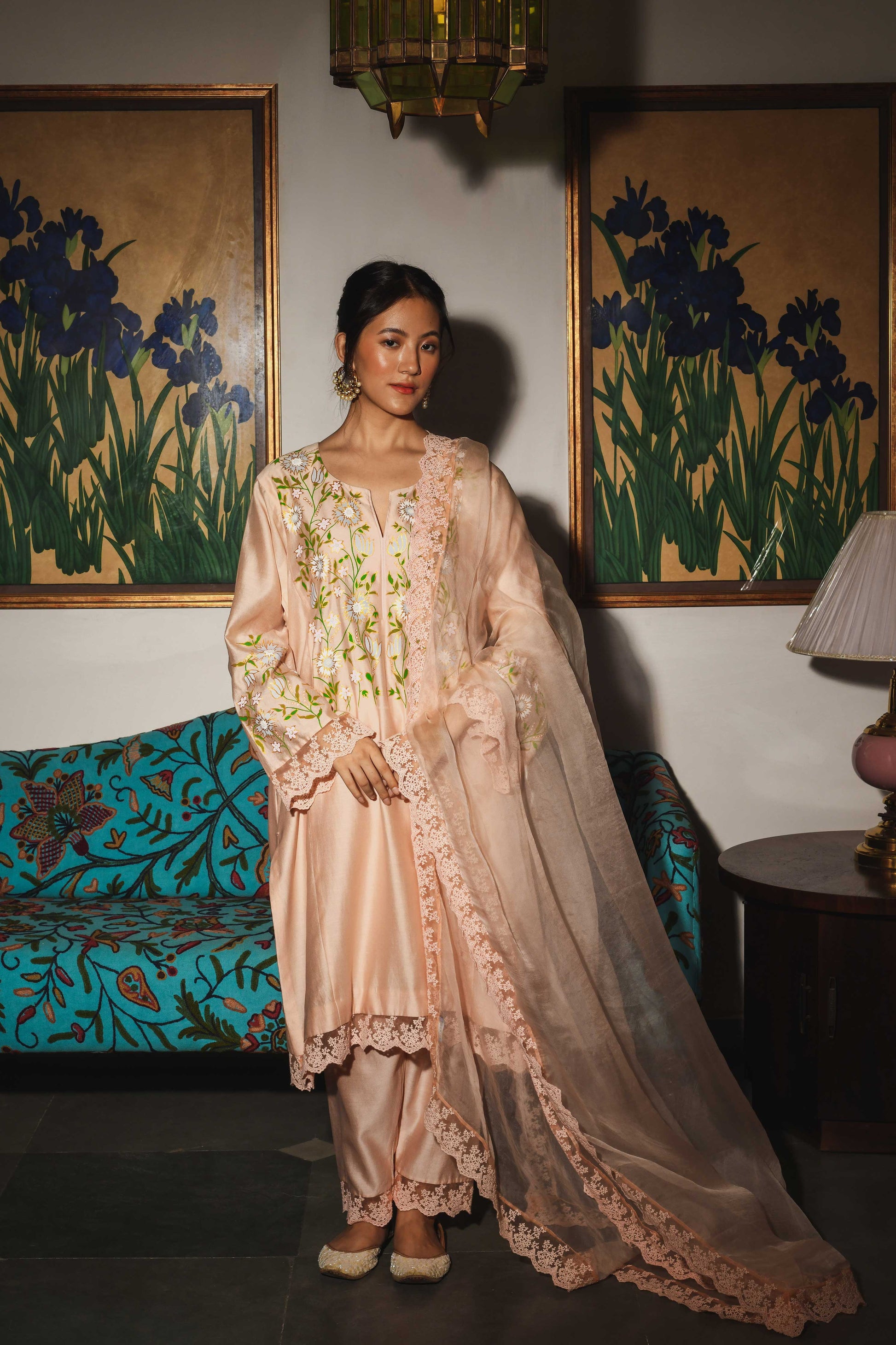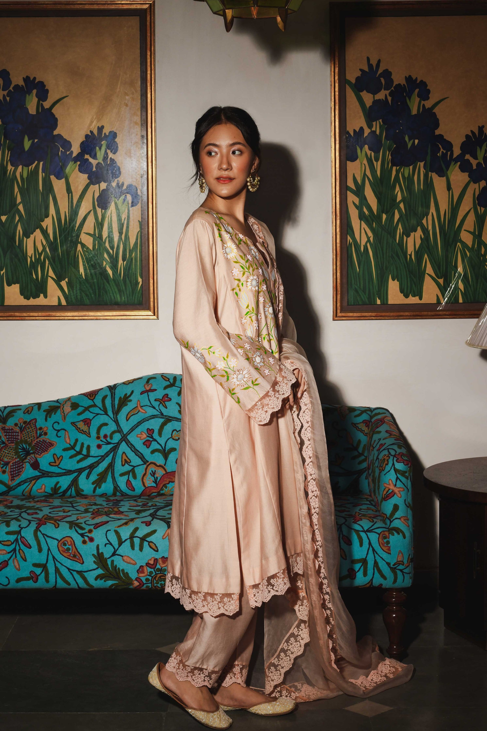 Chanderi beige suit set with hand painted floral art work and embroidery highlight, finished with floral lace on the hemline of the suit and sleeves. Paired with salwar pants with organza lace detailing on the hemline and matching organza duppatta, finished with a floral lace.