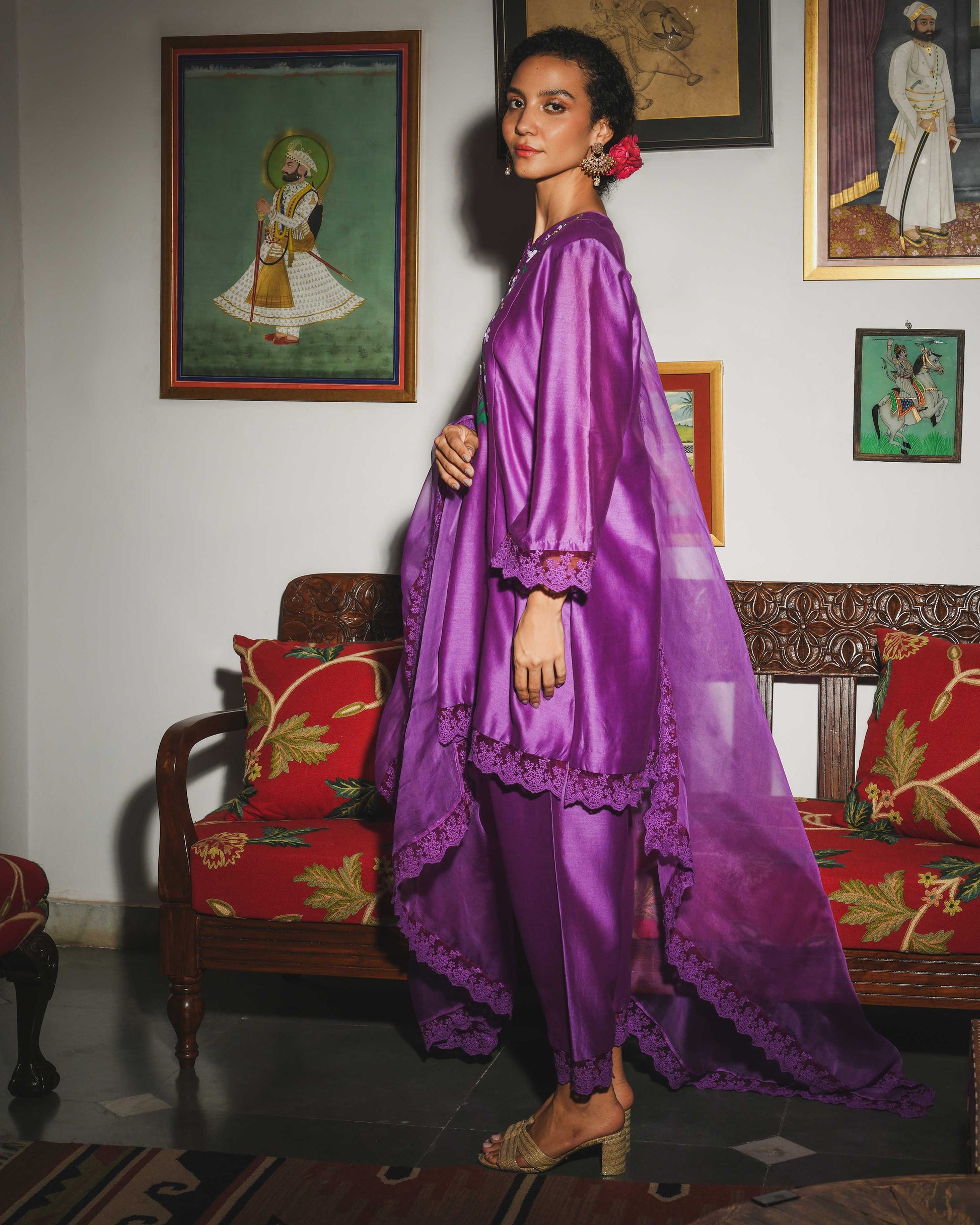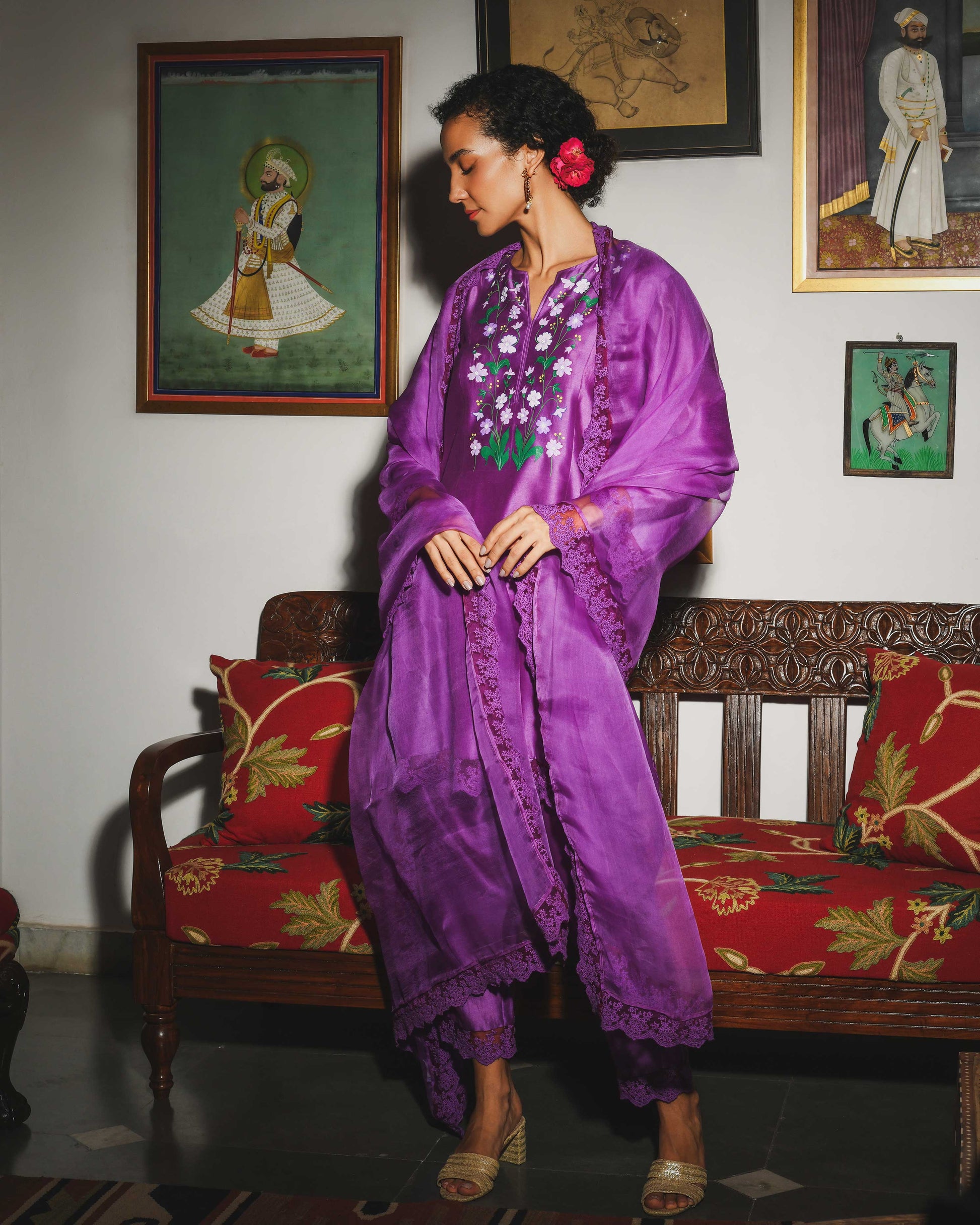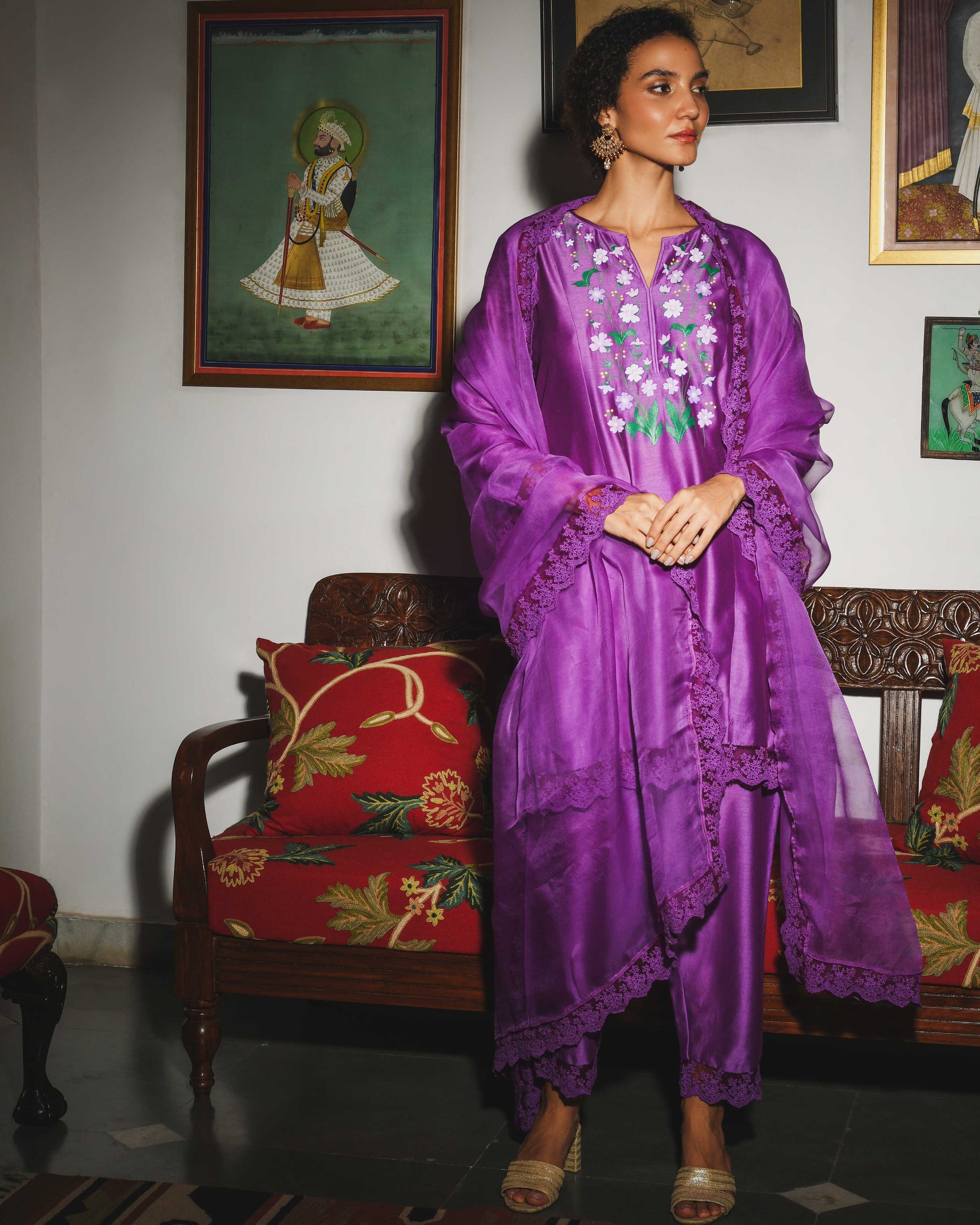 Details: Hand painted kurta with hand embroidery highlight lace finishing on the hemlines and duppatta