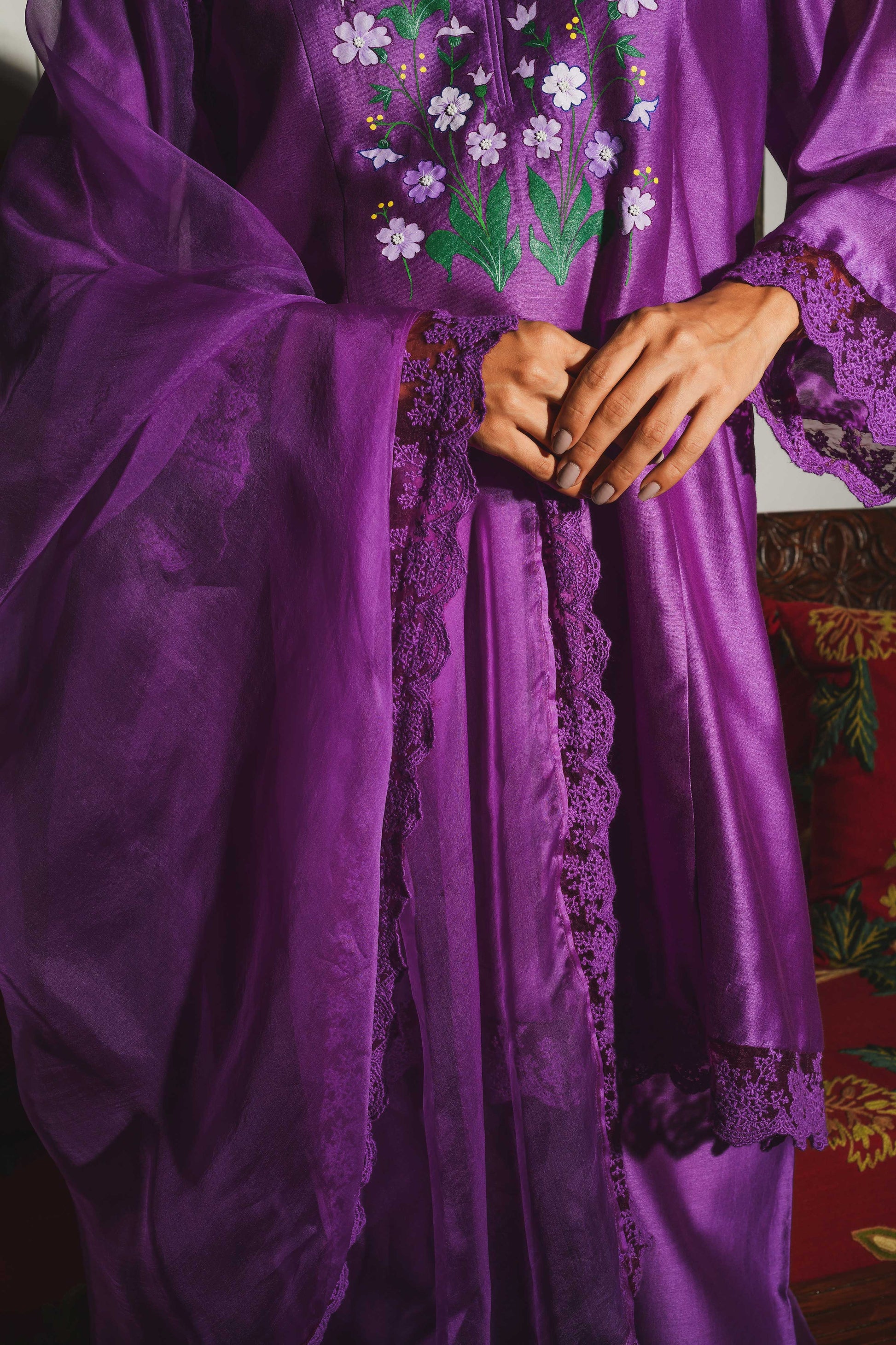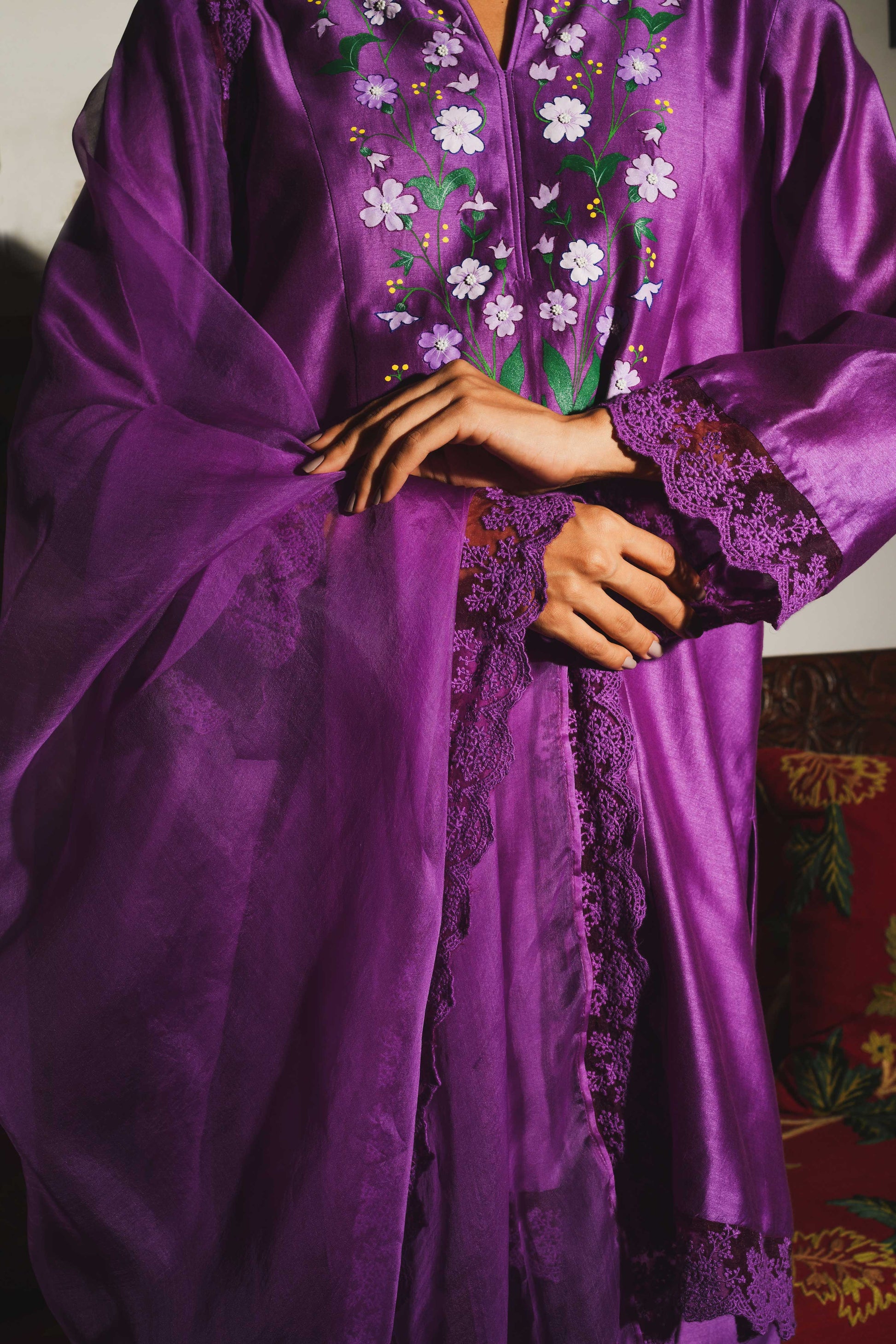 Hand painted detailed floral artwork on the yoke highlighted with hand embroidery, finished with a matching organza embroidered lace on the hemlines, paired with a matching duppatta which is also finished with lace.