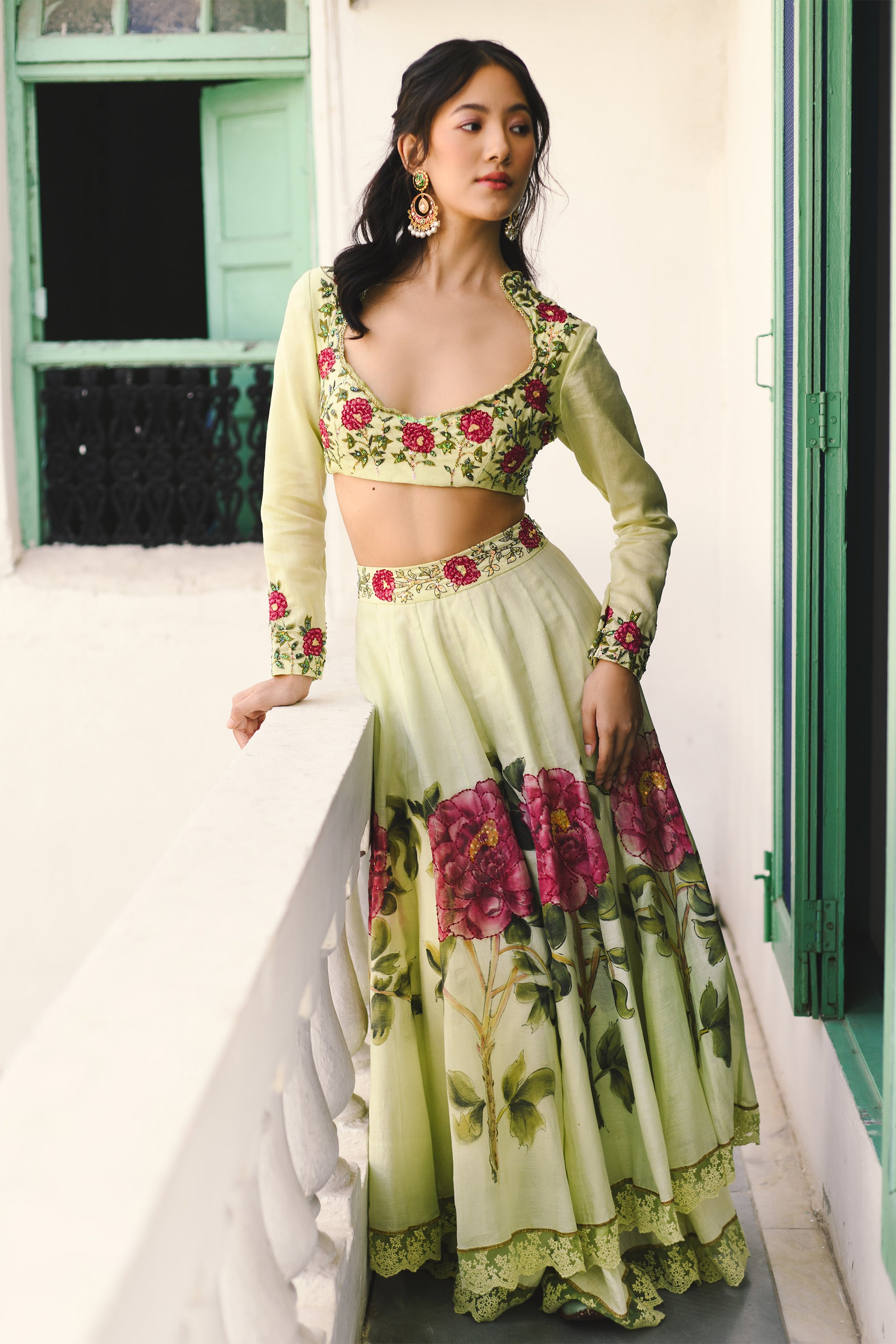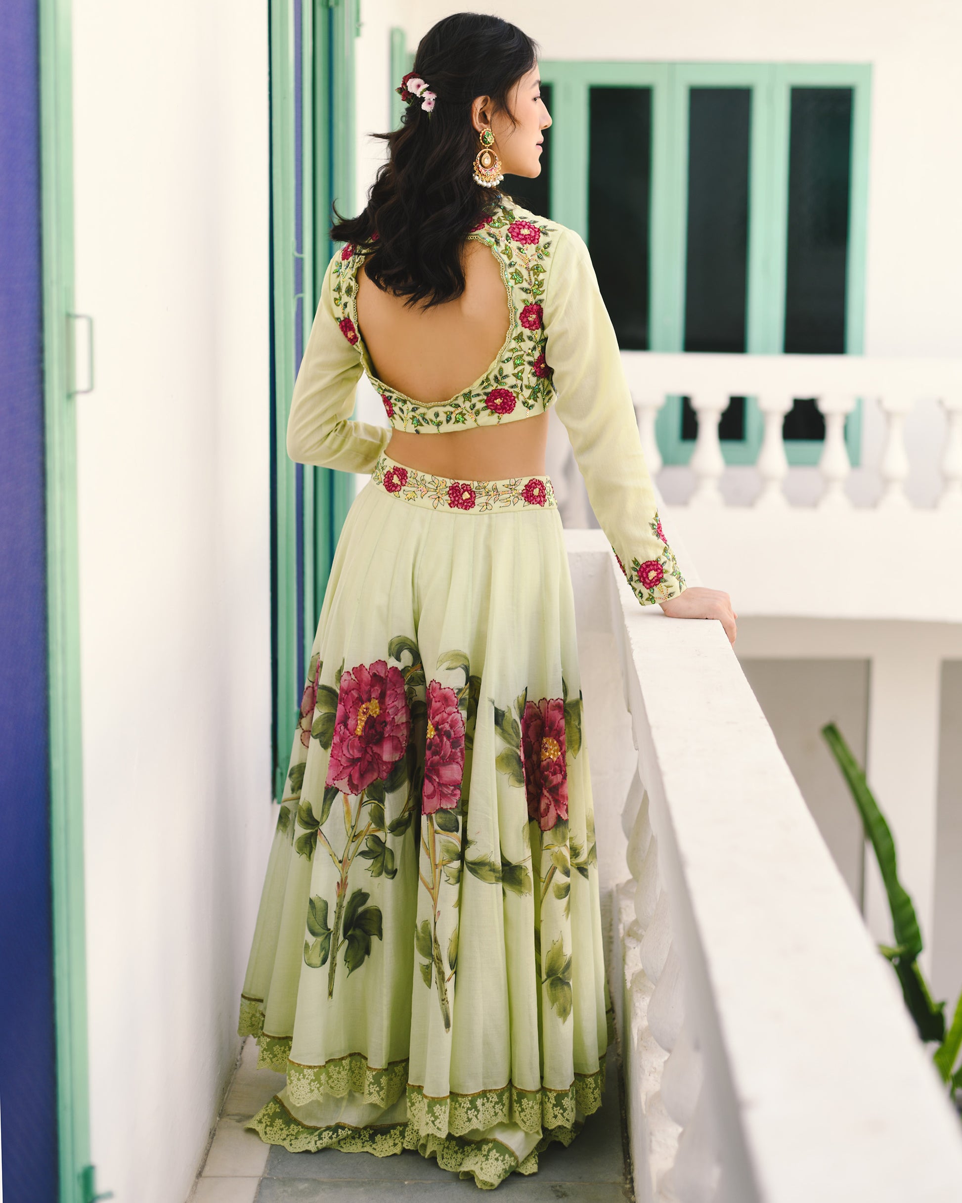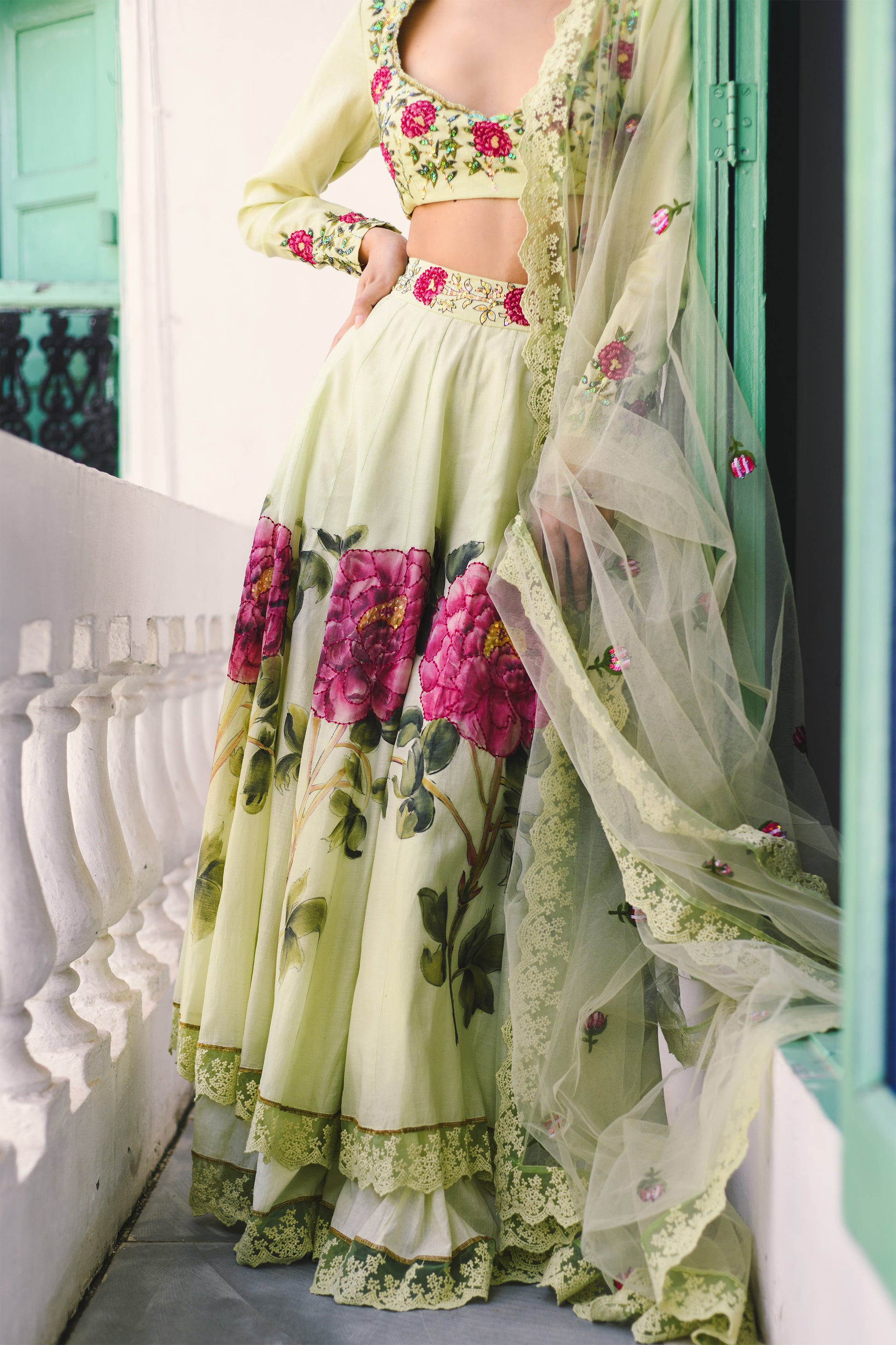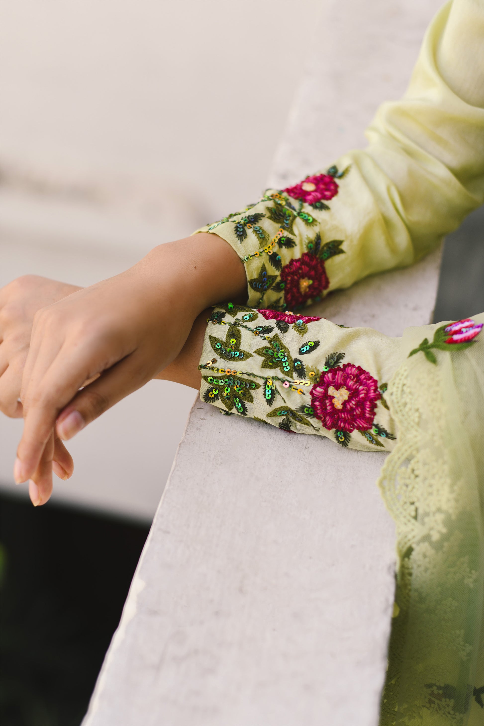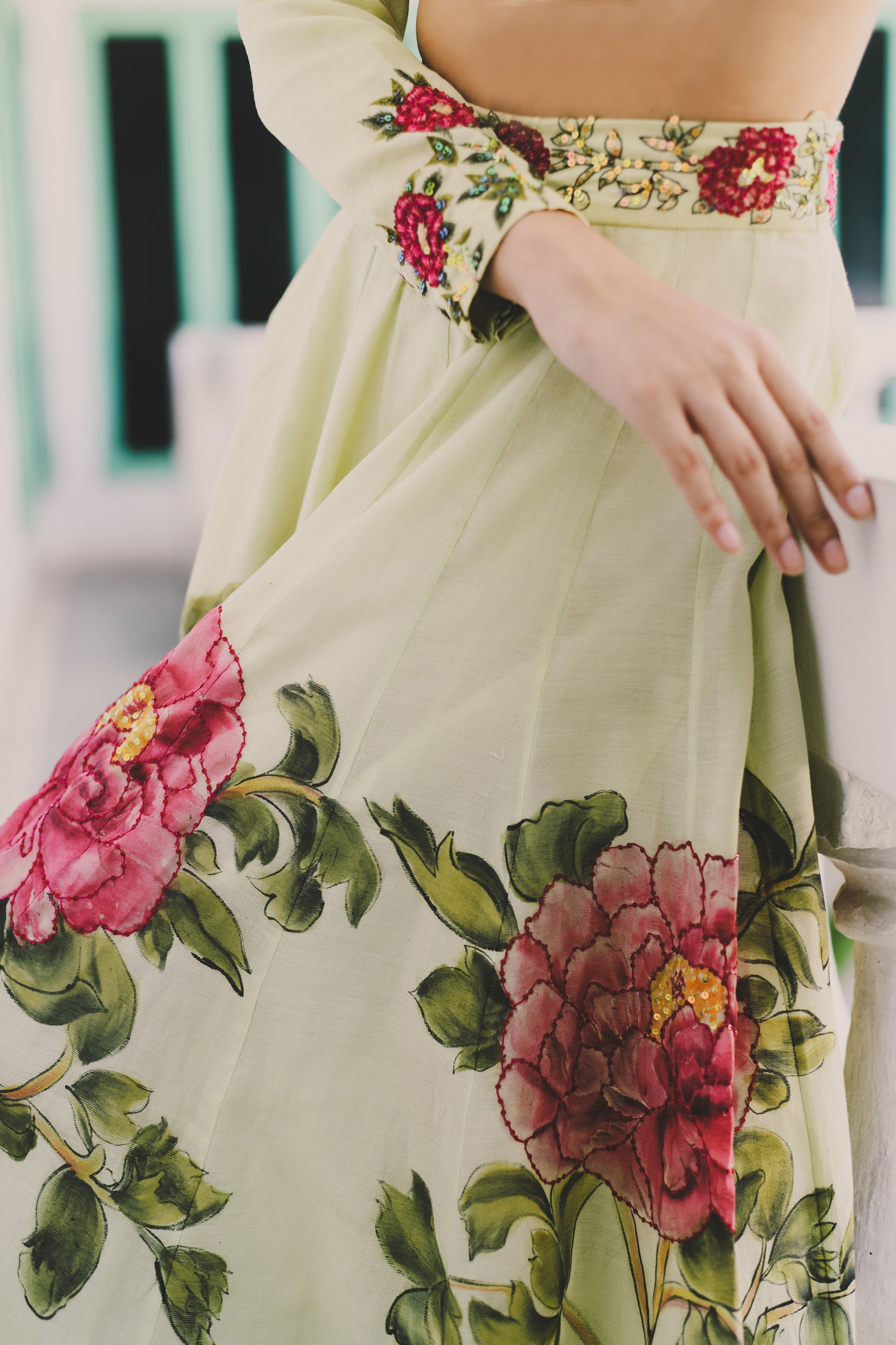 This sharara set in pastel pistachio-green chanderi is a canvas of delicate craftsmanship. The Sharara Bottom is hand-painted with peonies in rich rose and blush hues that bloom across the flowing silhouette, their petals highlighted with subtle sequin embroidery that lends a gentle shimmer. The Blouse has a contemporary cut, intricately hand-embroidered with smaller peonies in matching shades, echoing the artistry of the sharara while adding fine detail and texture. A sheer net dupatta, embroidered with scattered floral motifs, framed with lace edging, and designed to drape lightly, completing the ensemble with elegance.