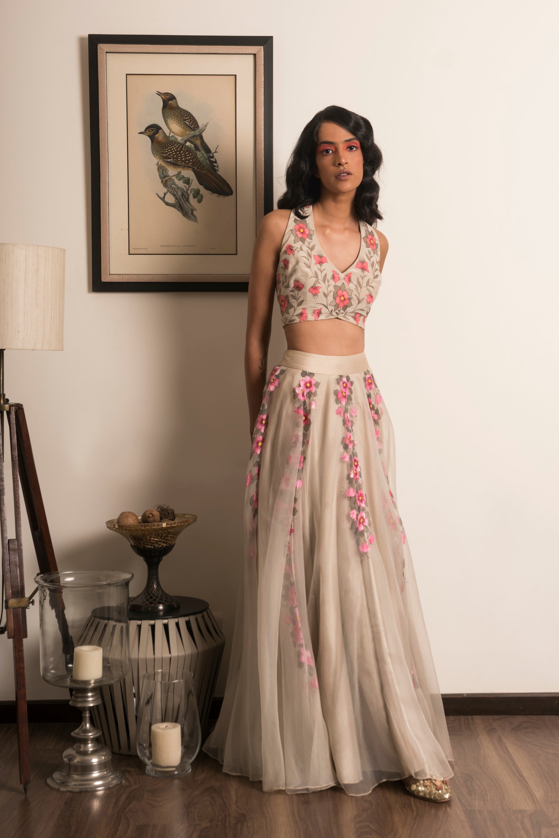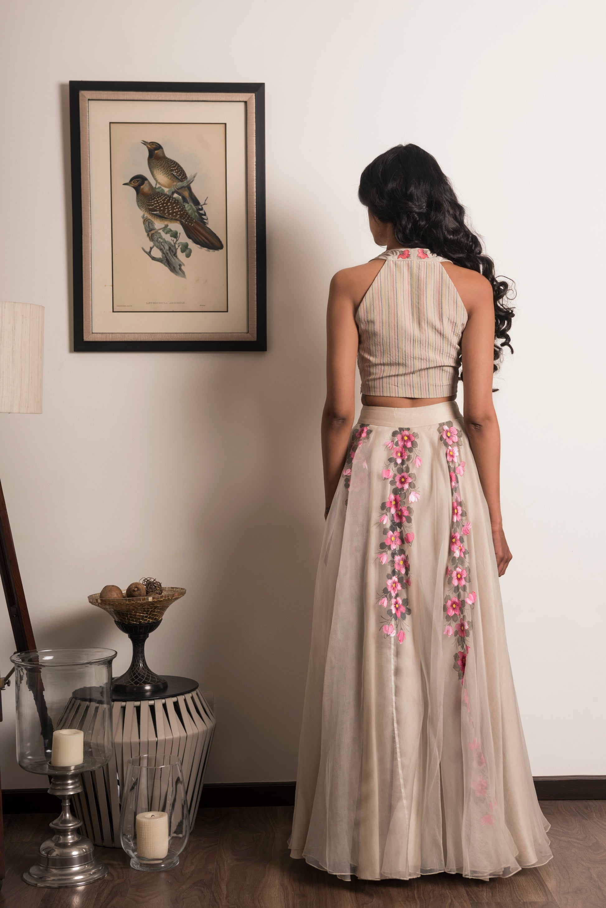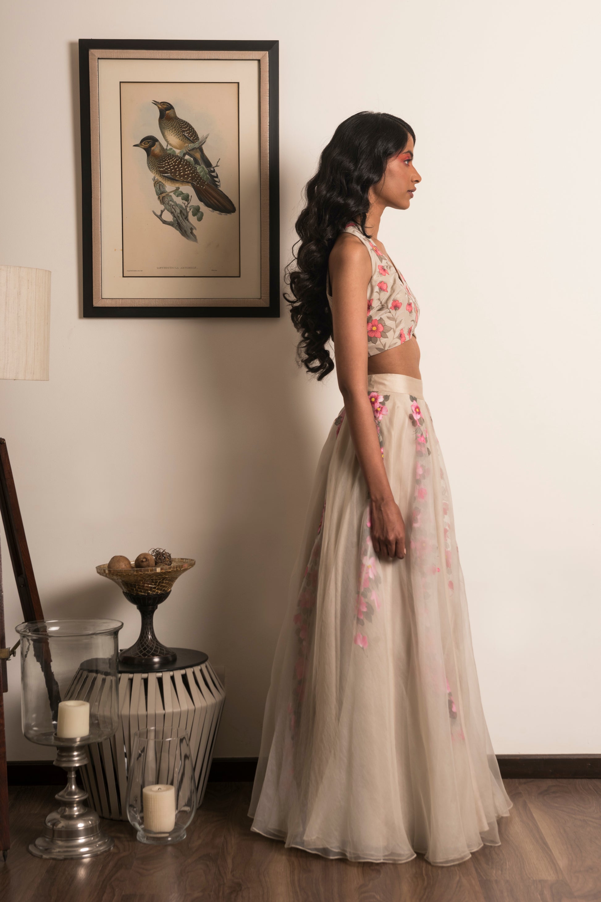 "Pearl grey skirt, hand-painted with pink rain lily paired with hand-embroidered sleeveless top with a detailed back."