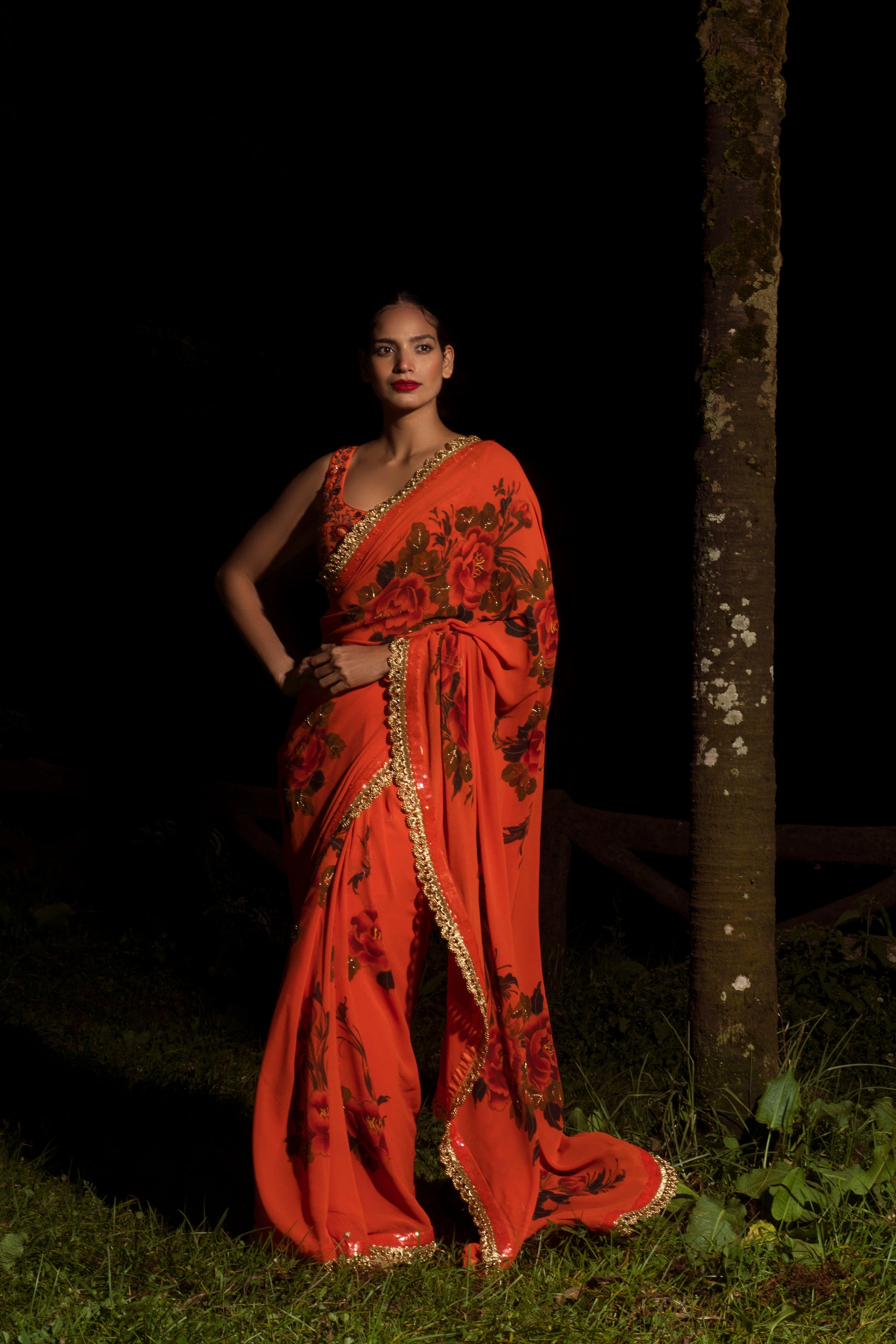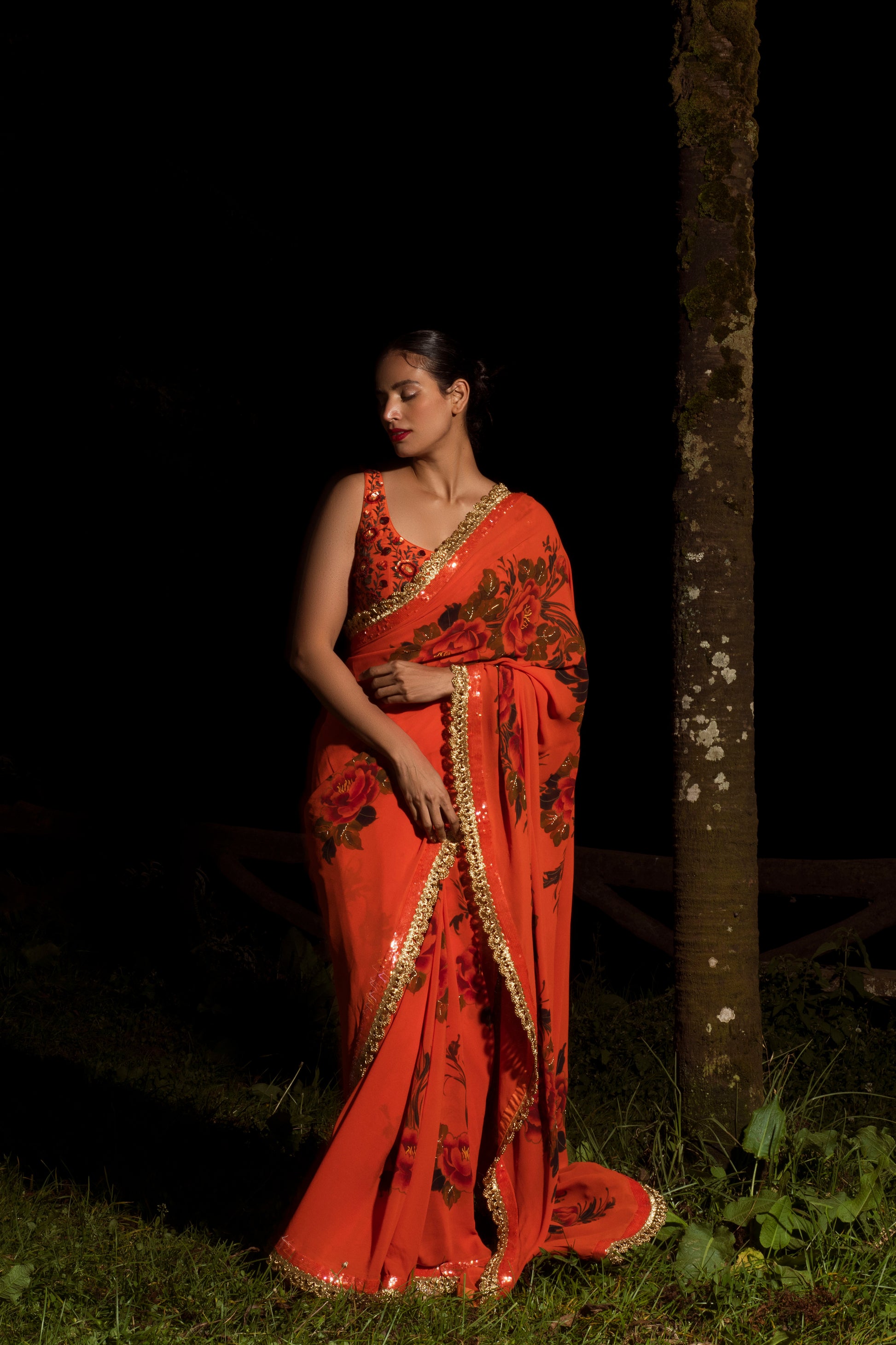Includes: Saari with fall pico, Basic Blouse & Petticoat. (The blouse featured in the image is available for separate purchase, while the saari includes a complementary basic blouse.)