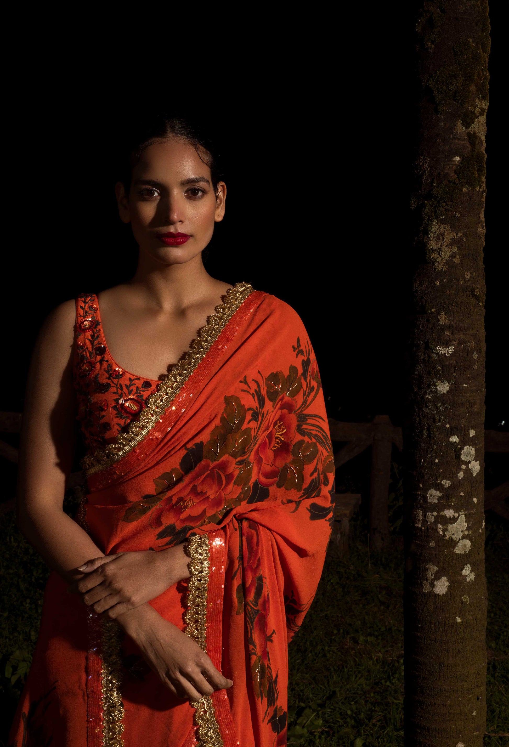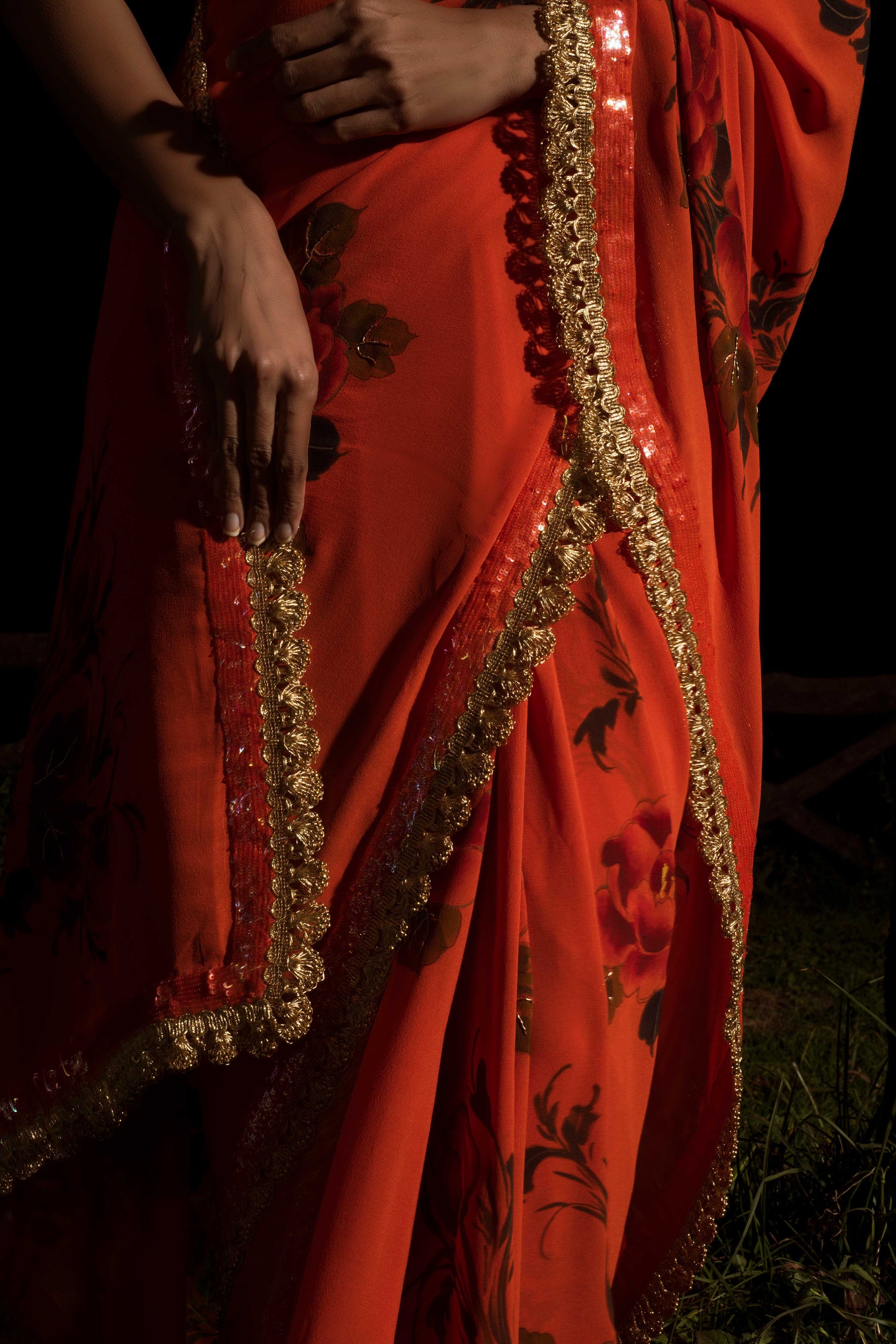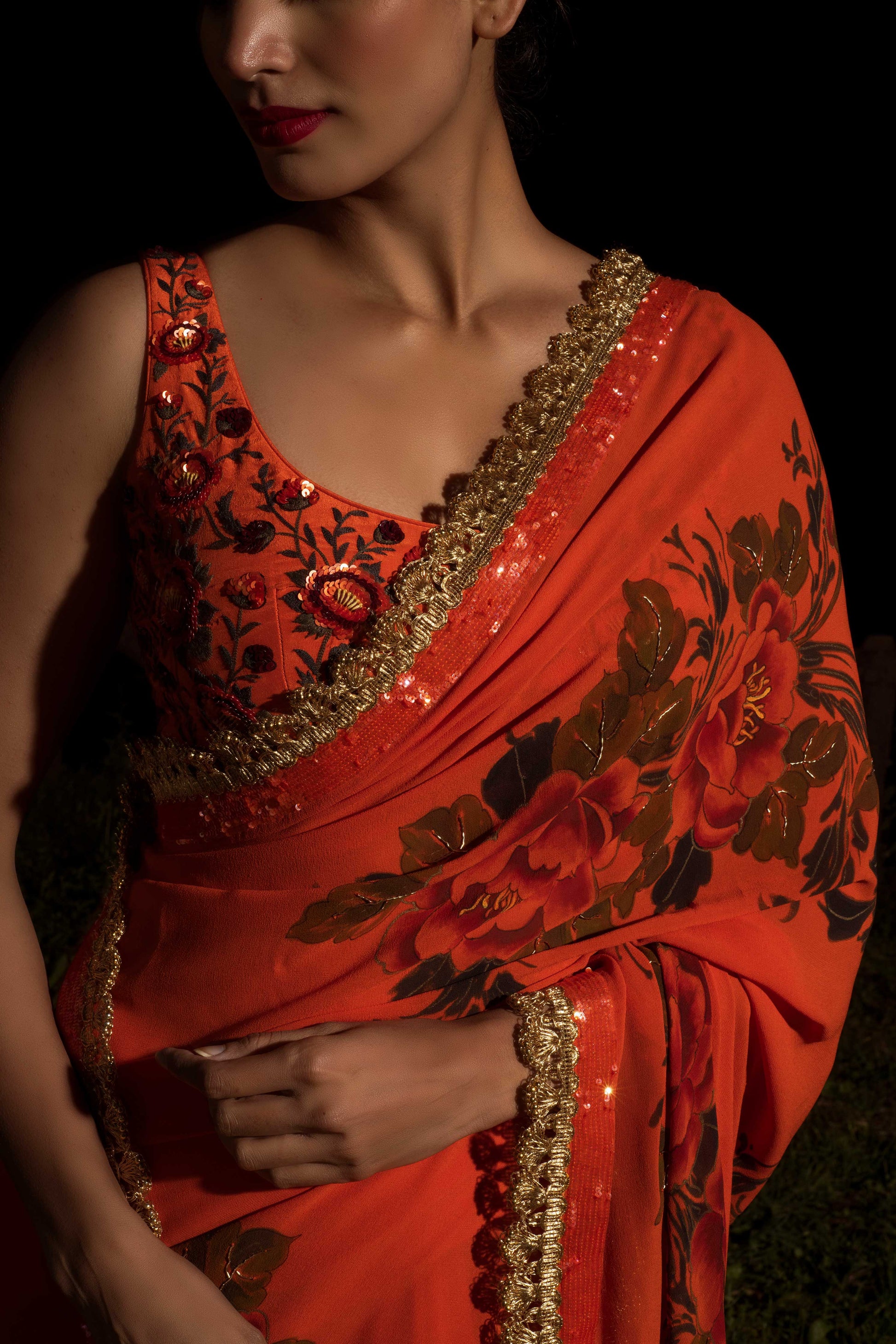 Pure Georgette hand painted hand embroidered saari with hand sequins work border finished with a golden lace paired with hand embroidered crepe blouse.