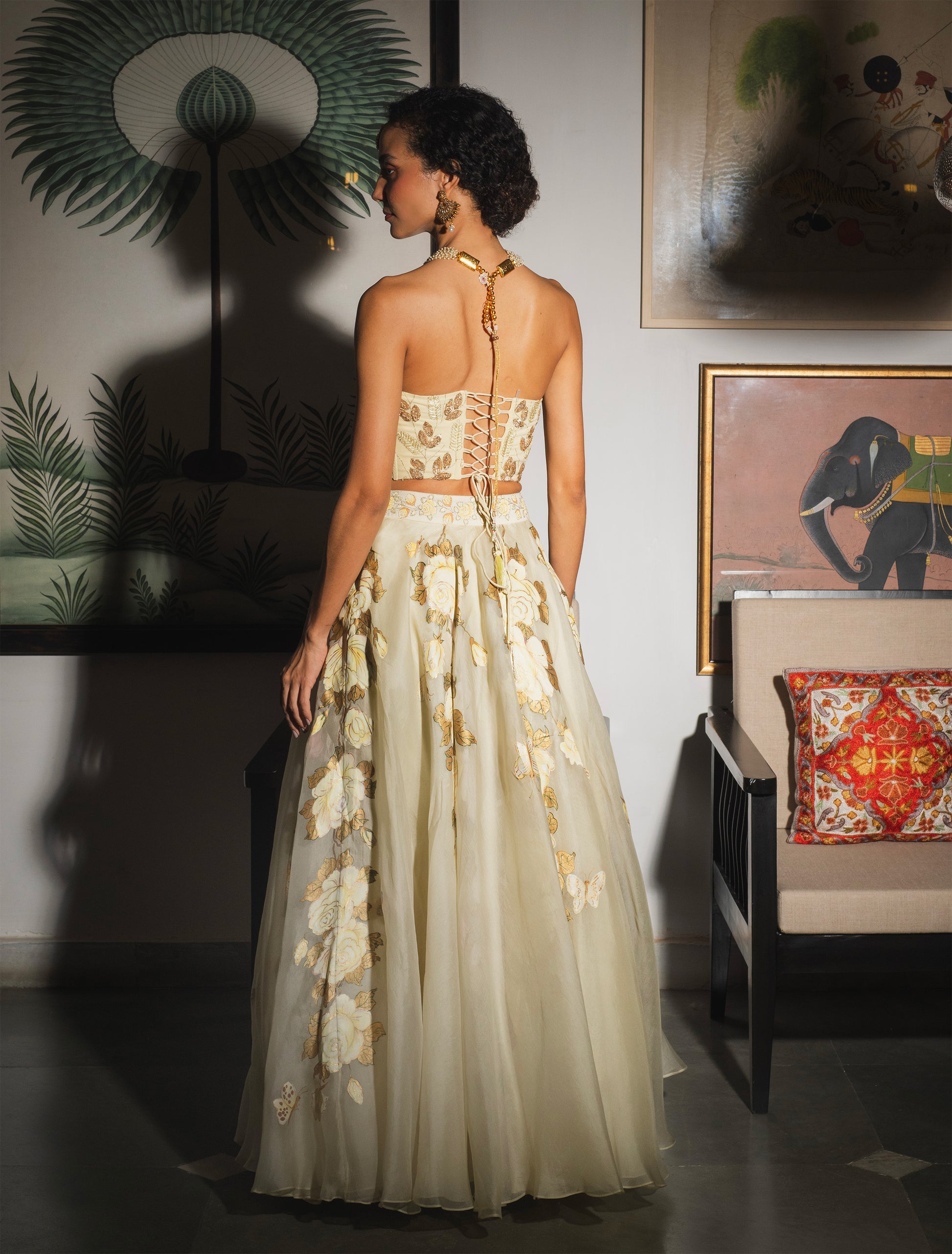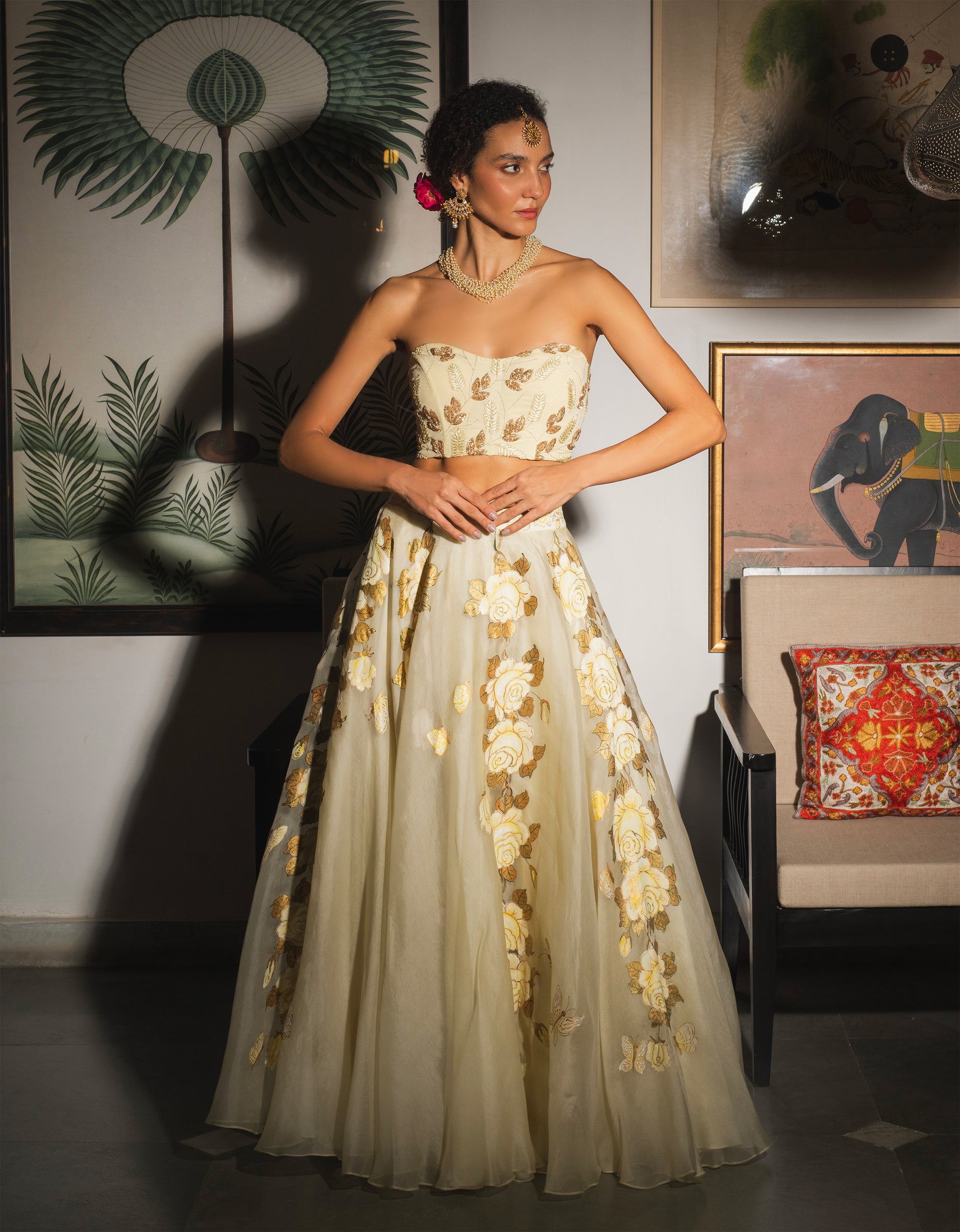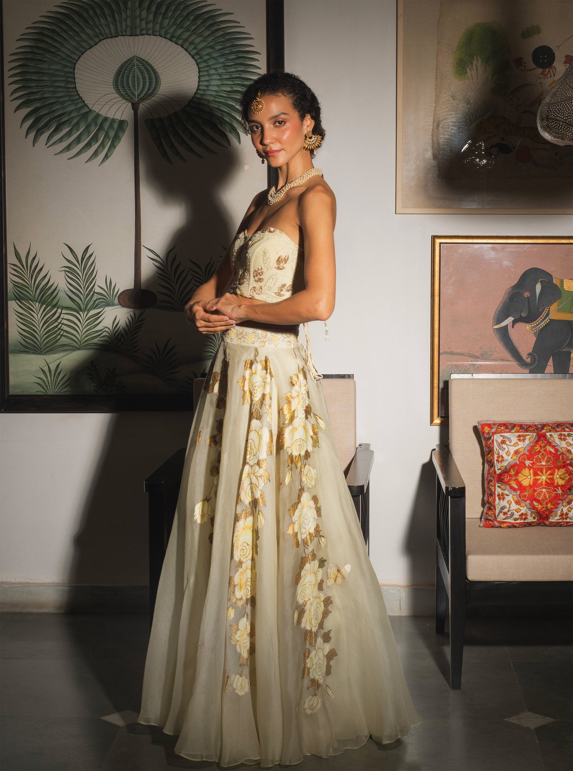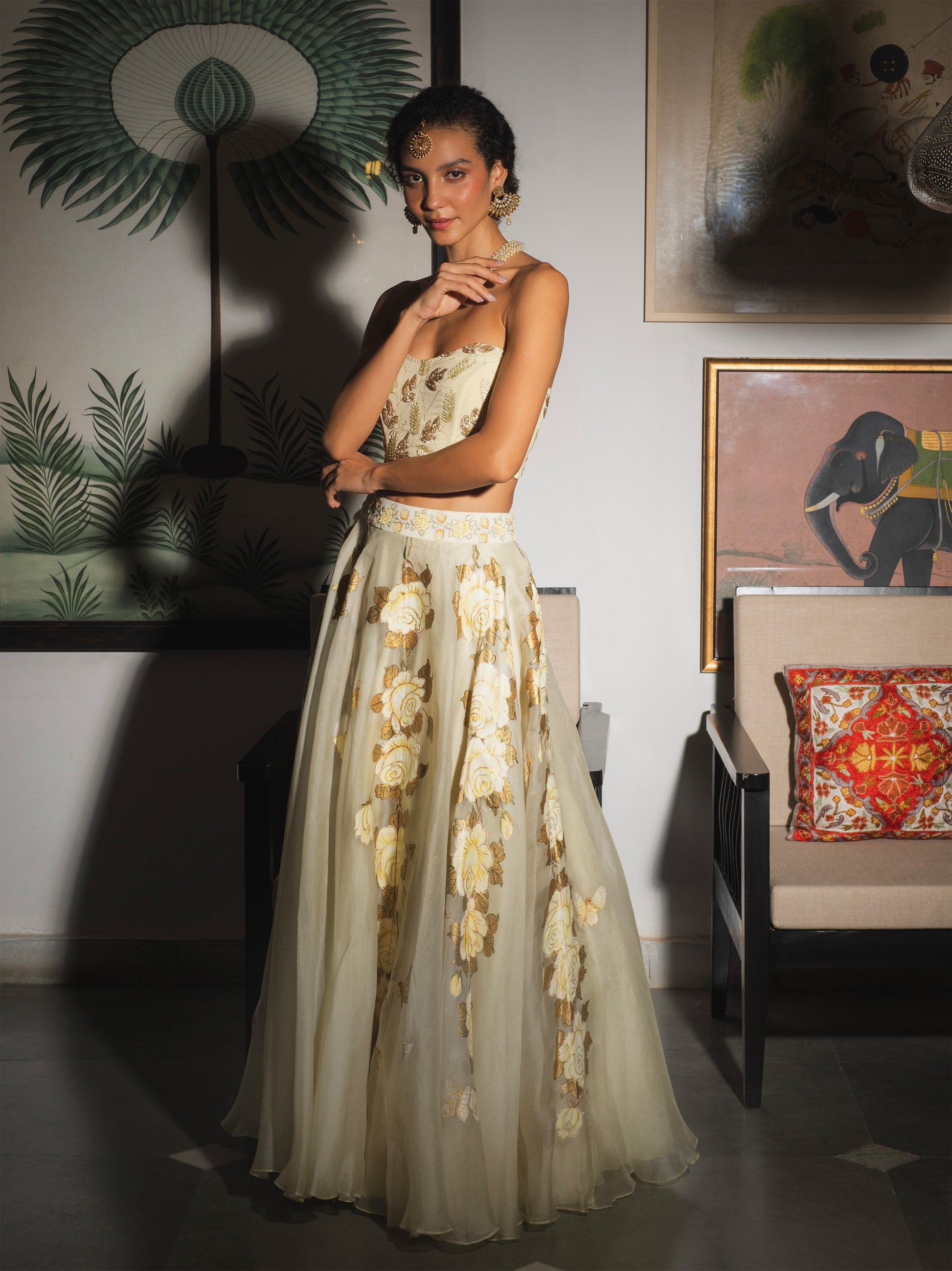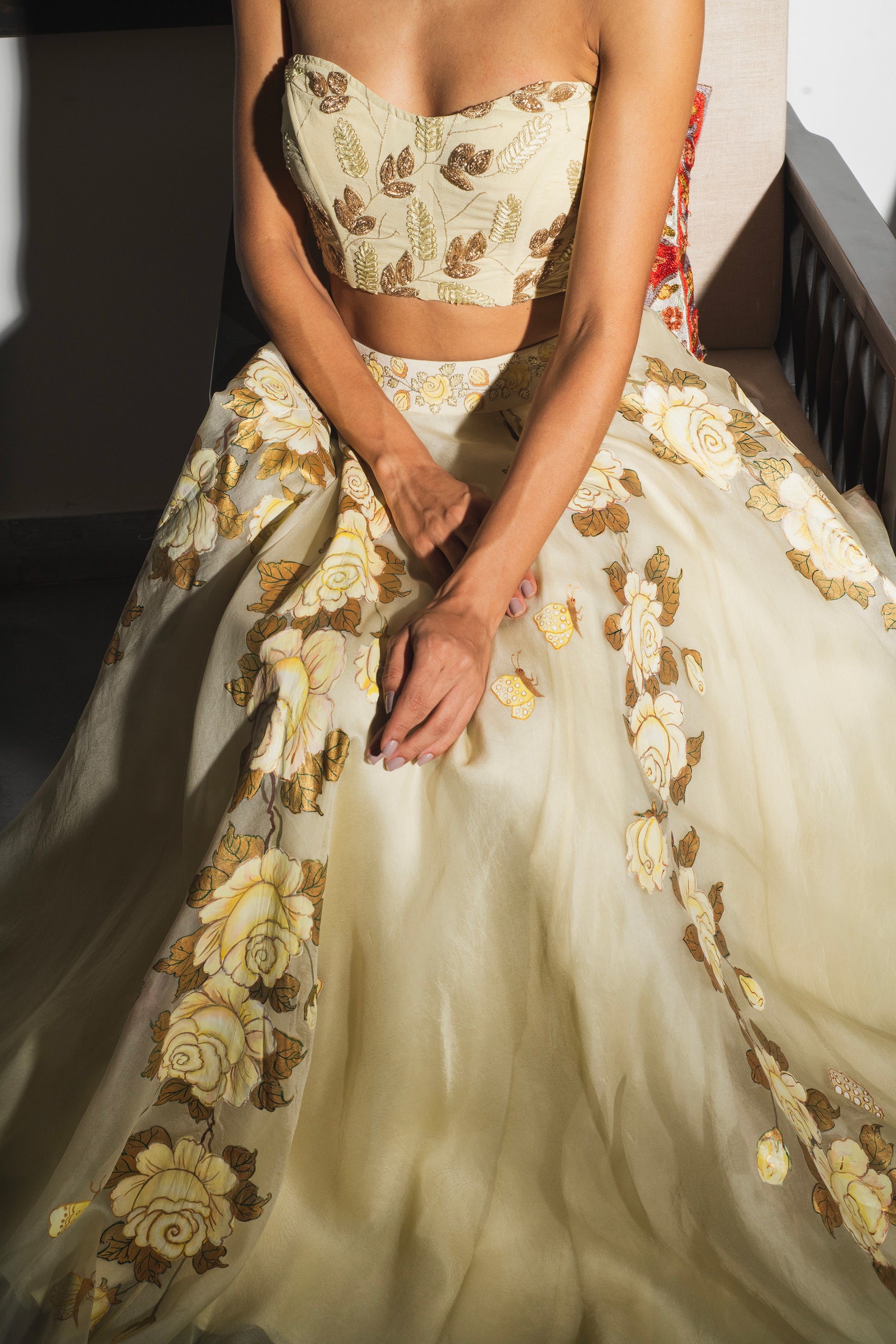 A graceful lehenga skirt set featuring a structured corset blouse in pure crepe with intricate hand embroidery in fine thread-work. The blouse pairs beautifully with a flowing organza skirt in soft golden and the lightest yellow tones inspired by fresh morning roses. (Please Note: Dupatta can be customized if needed).