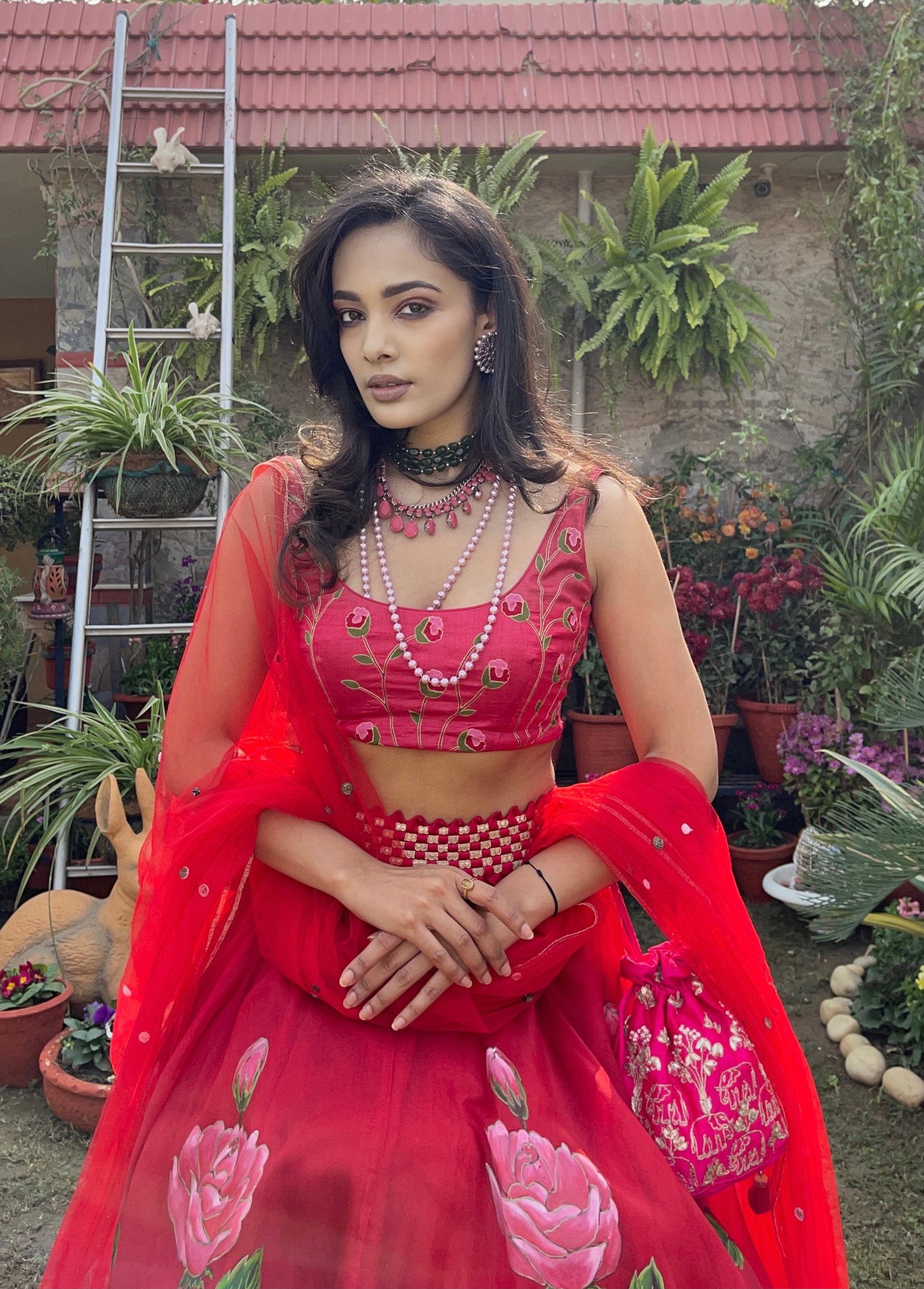"Scarlet Red skirt, hand-painted with flirtatious pink roses paired with an hand-embroidered top & net duppatta."
