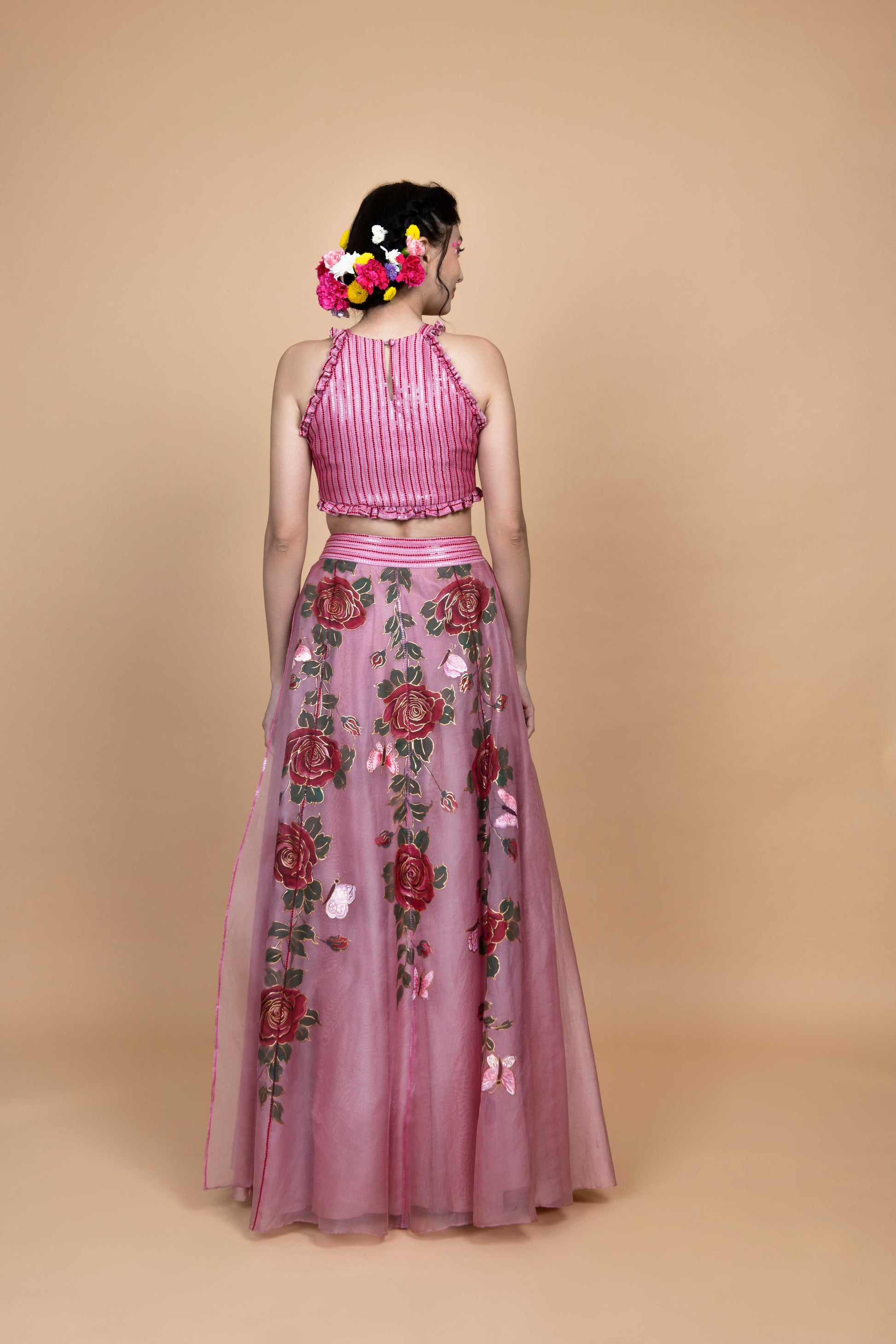 Rosie Skirt set comes with hand painted details in skirt inspired by Roses on Organza with sequin detailing on the waist band paired with a sequin based top with a hand painted rose in the center.