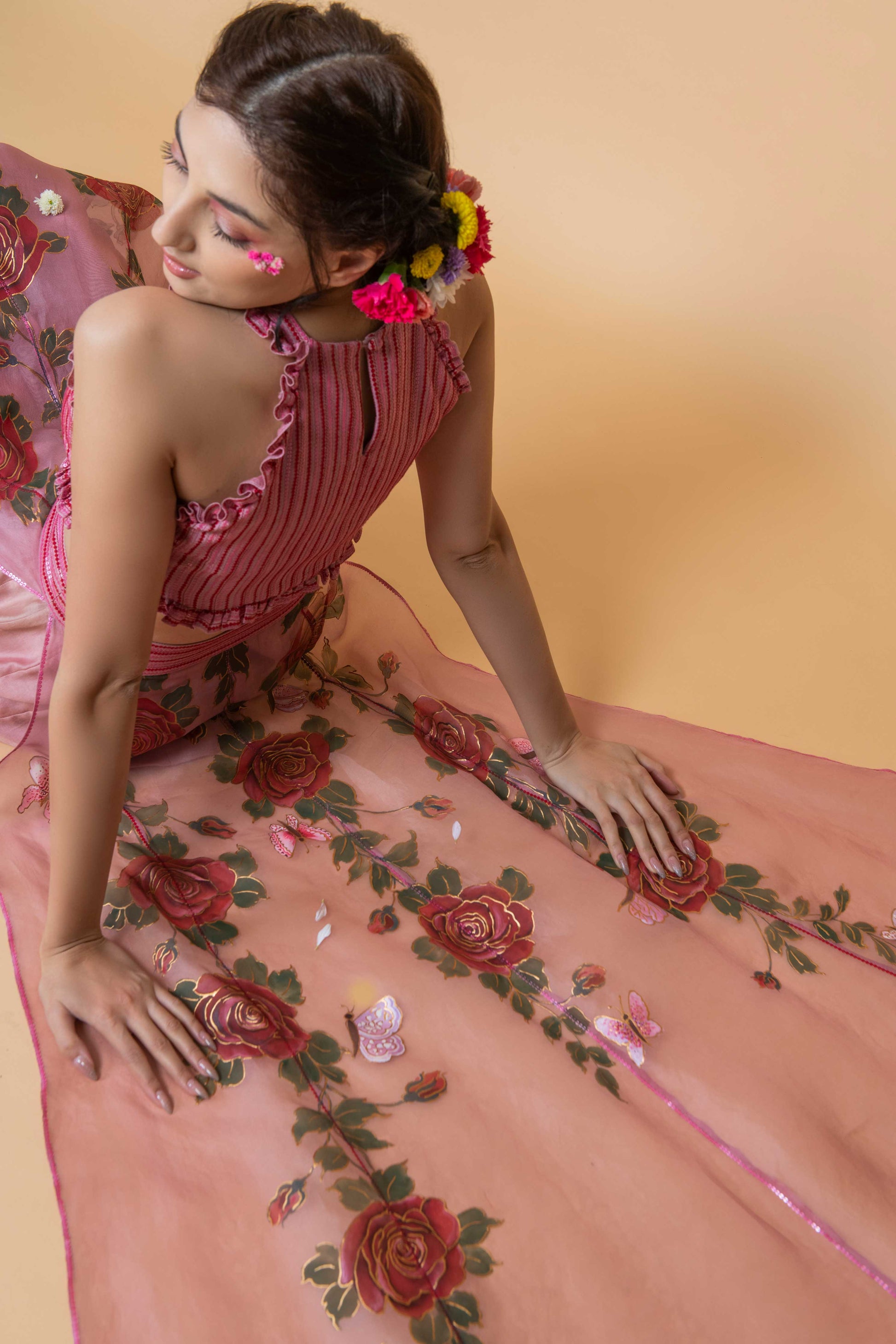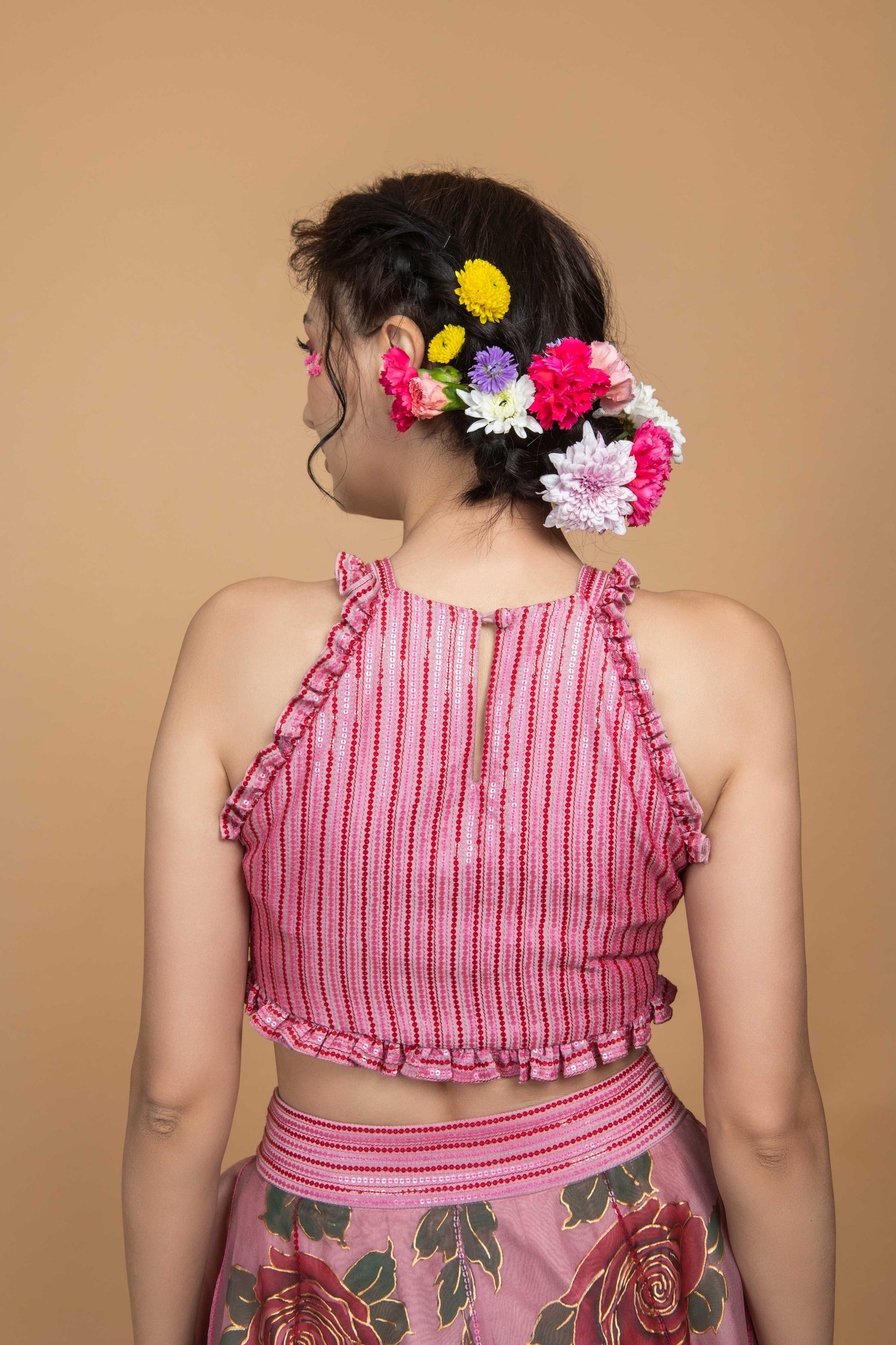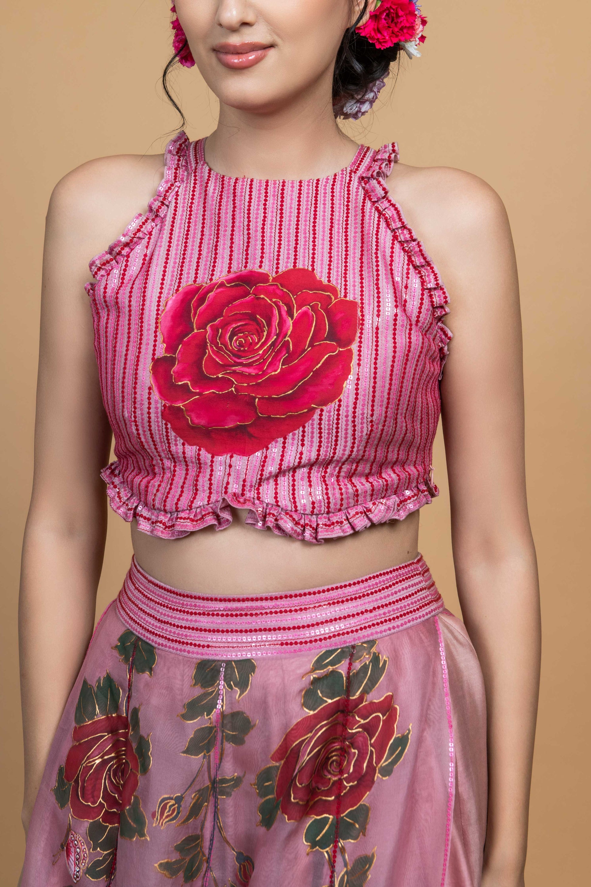 Details: Sequin base chanderi top with hand painted rose in the center with ruffle detailing, paired with hand painted organza skirt with sequin highlighted waist band.