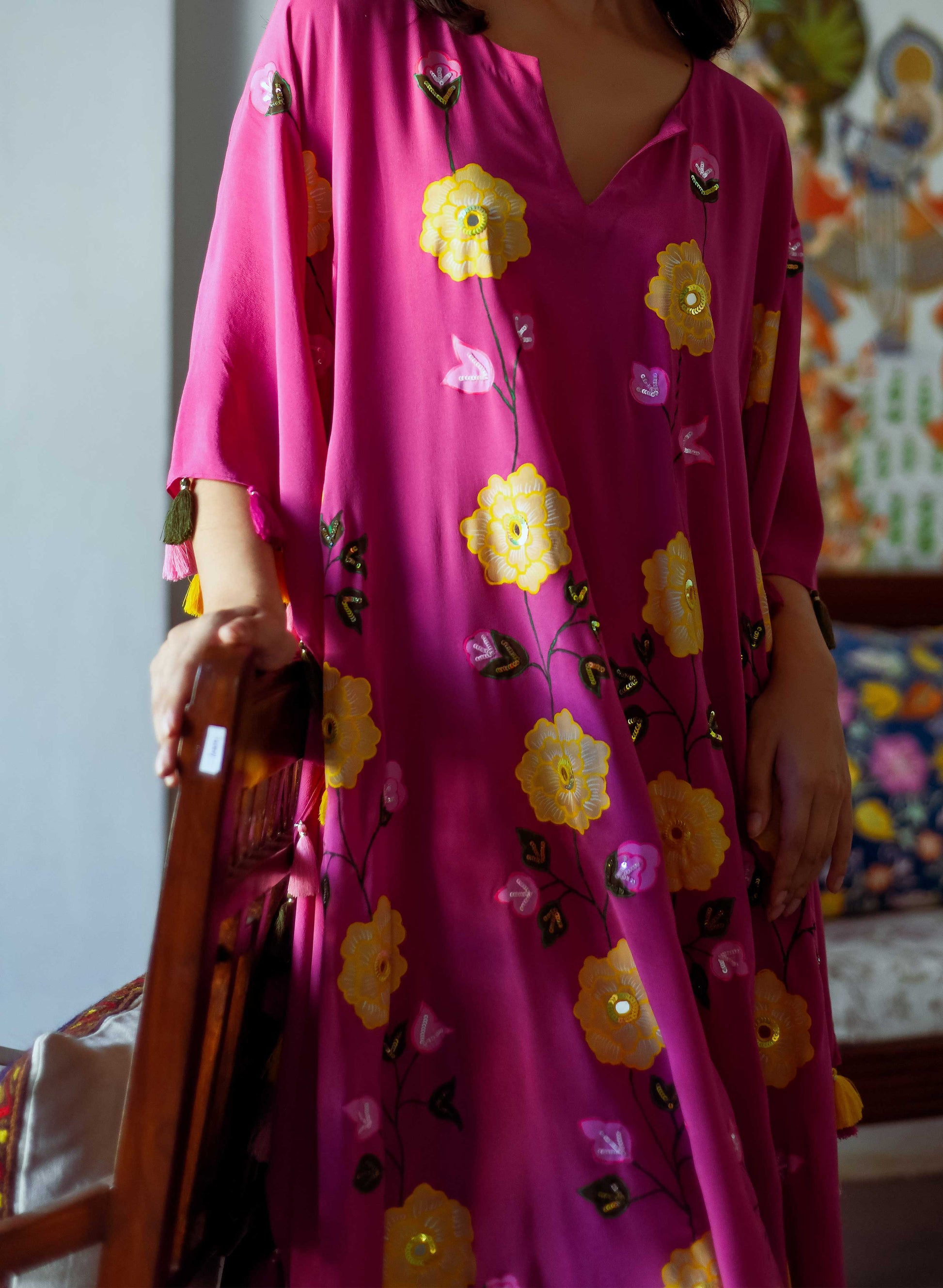The front of the Kaftan features hand-painted floral artwork with tassel detailing and mirror work, highlighted by sequins. It is paired with matching loose-fit pants.