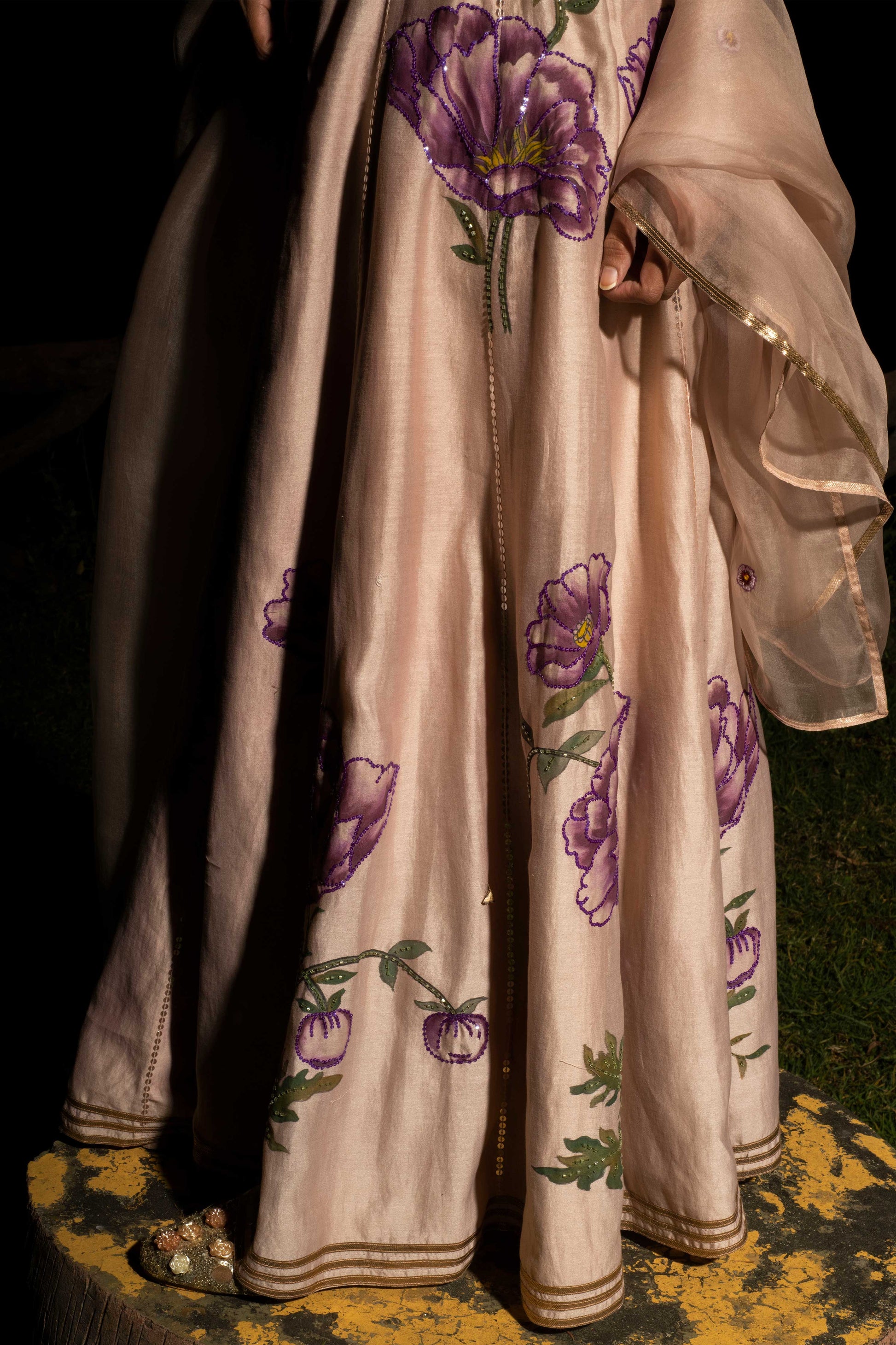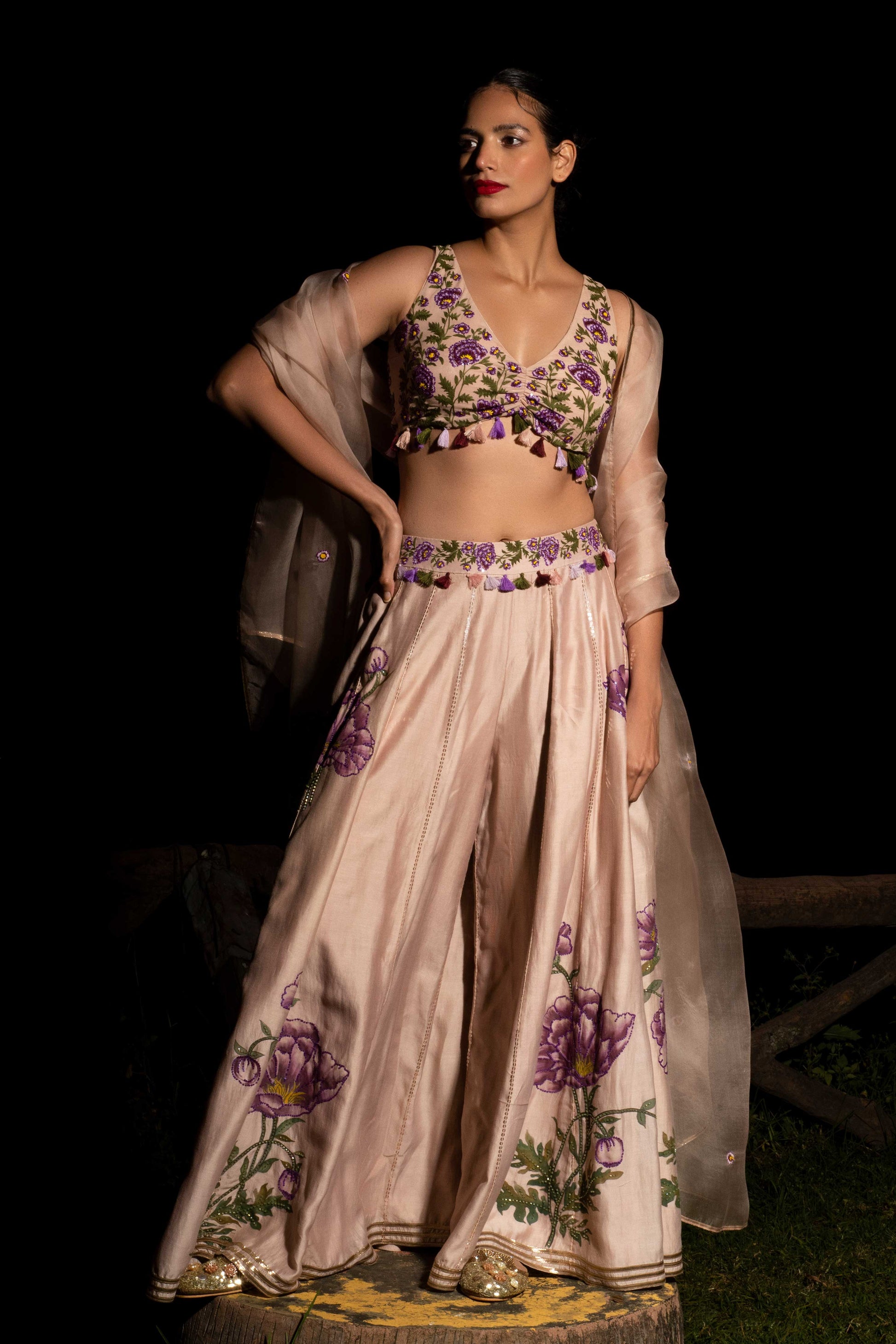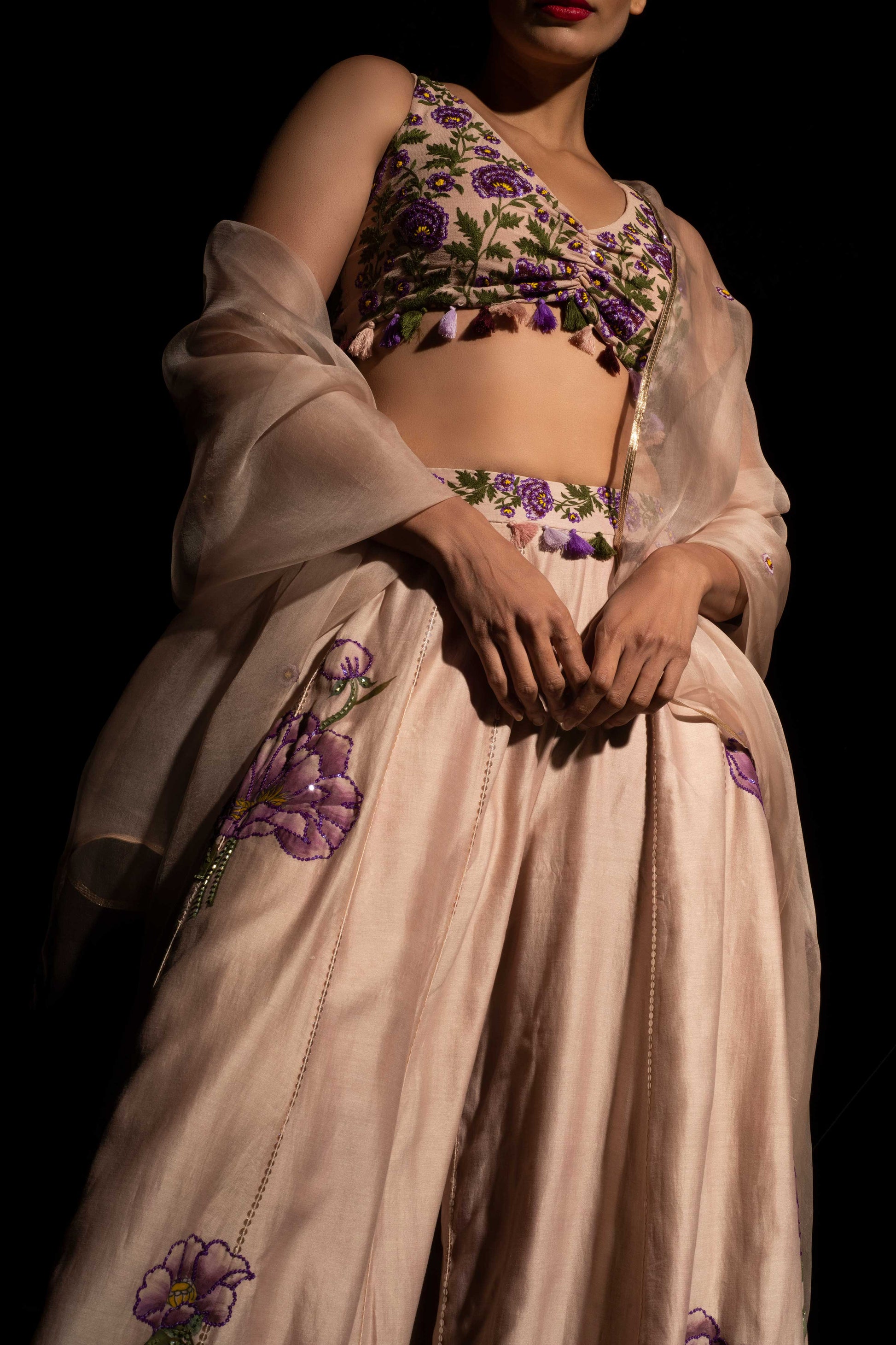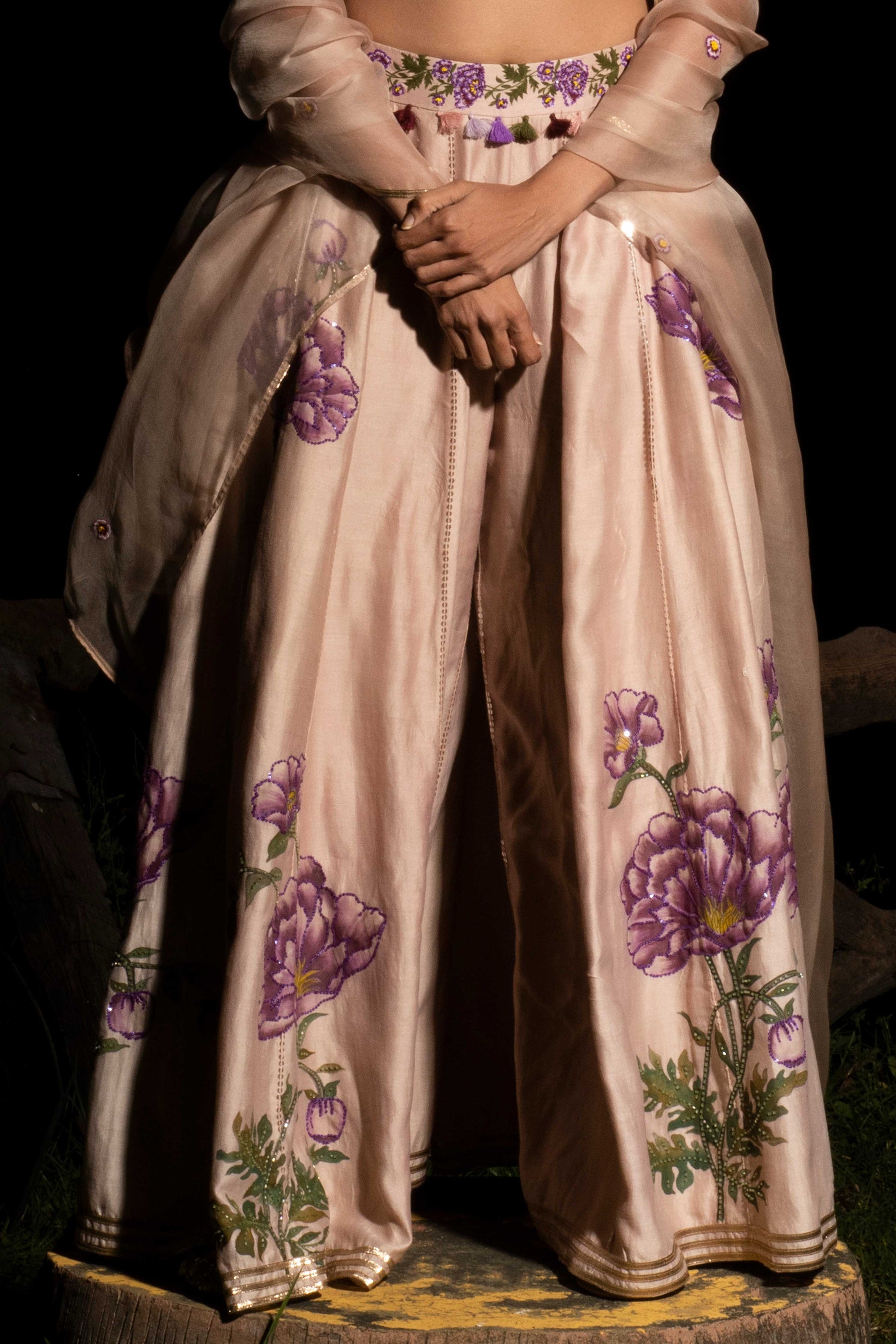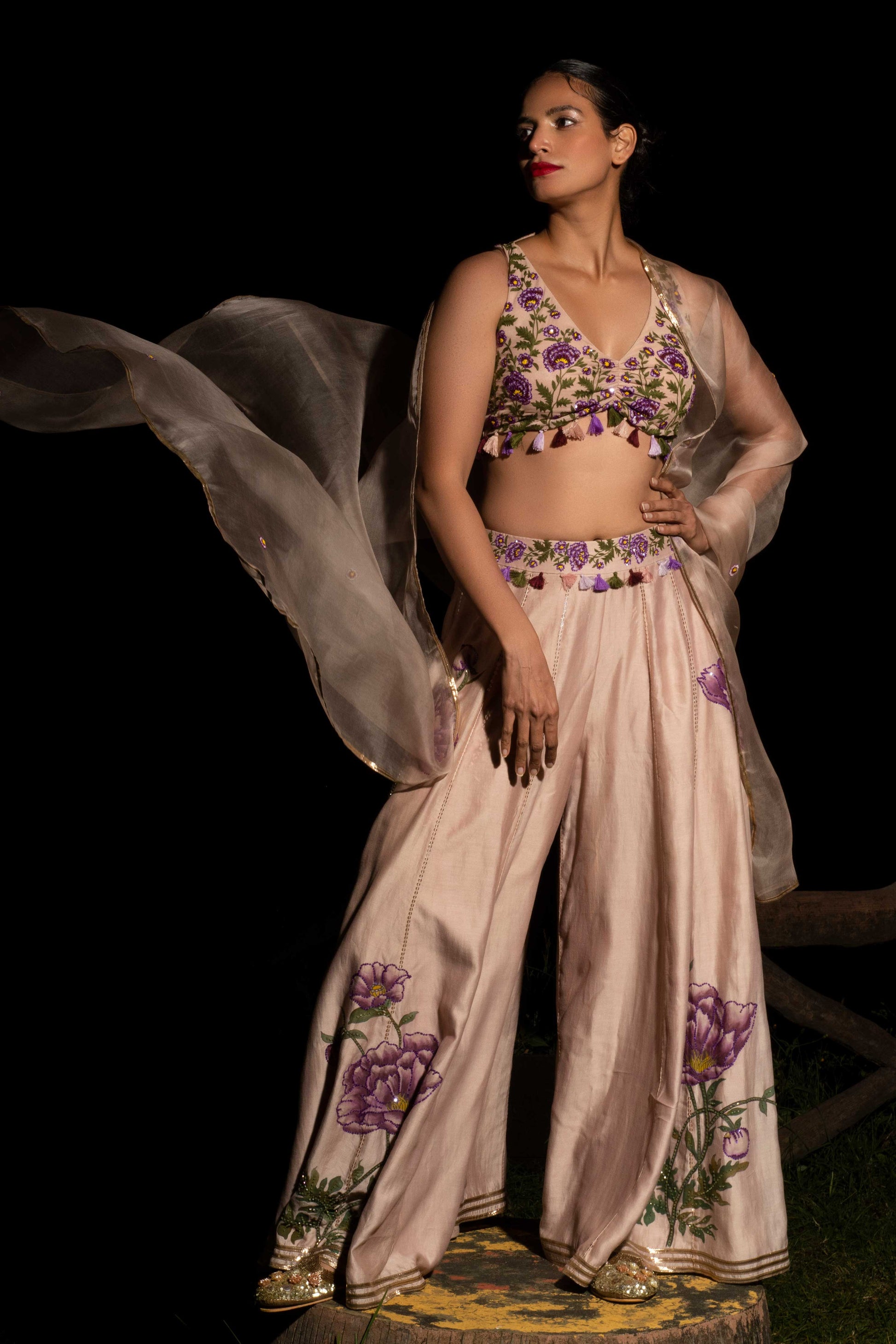 Sharara with hand-painted purple peonies, adorned with hand sequined highlights, the waistband is enhanced with sequins and threadwork, with tassel detailing. Paired perfectly with a stunning hand-embroidered crepe blouse, with tassel detailing on the hemline. The look is completed with a hand-embroidered matching butta pure organza duppatta, with matching lace.