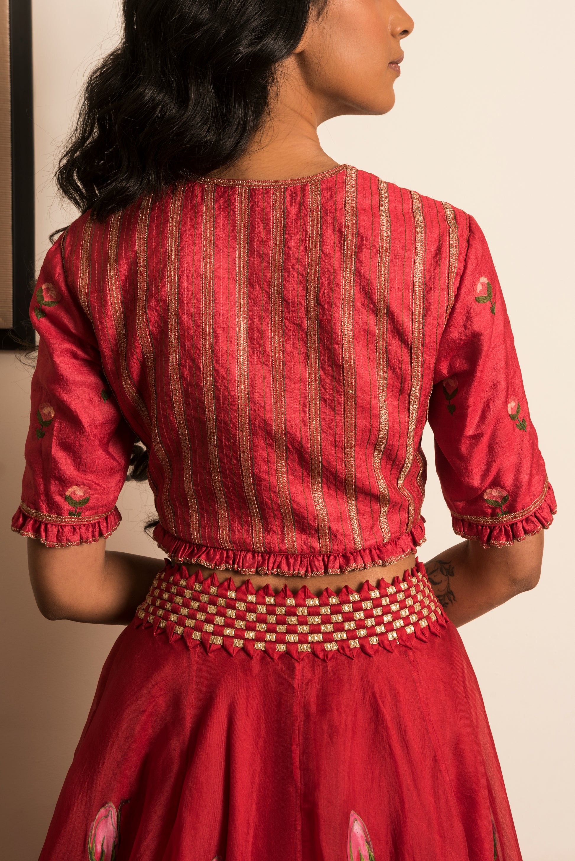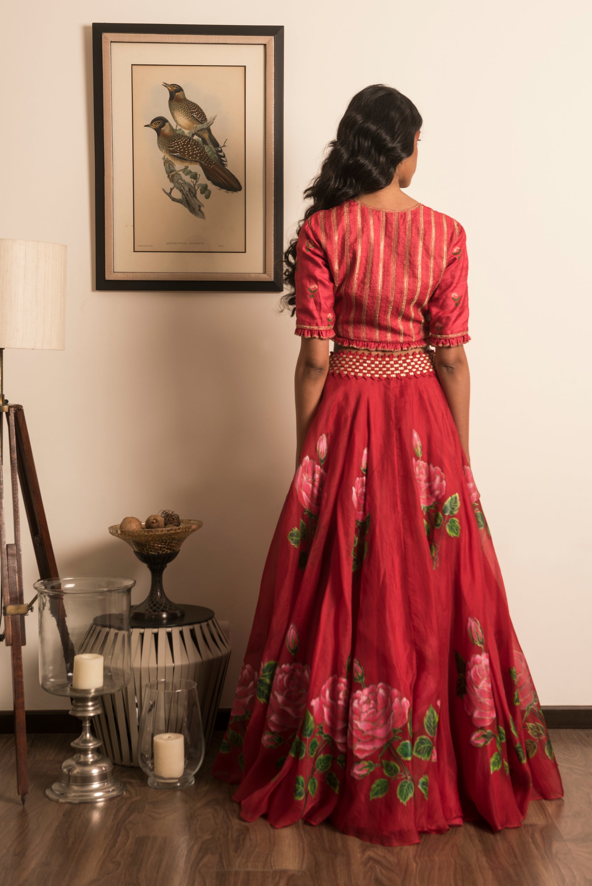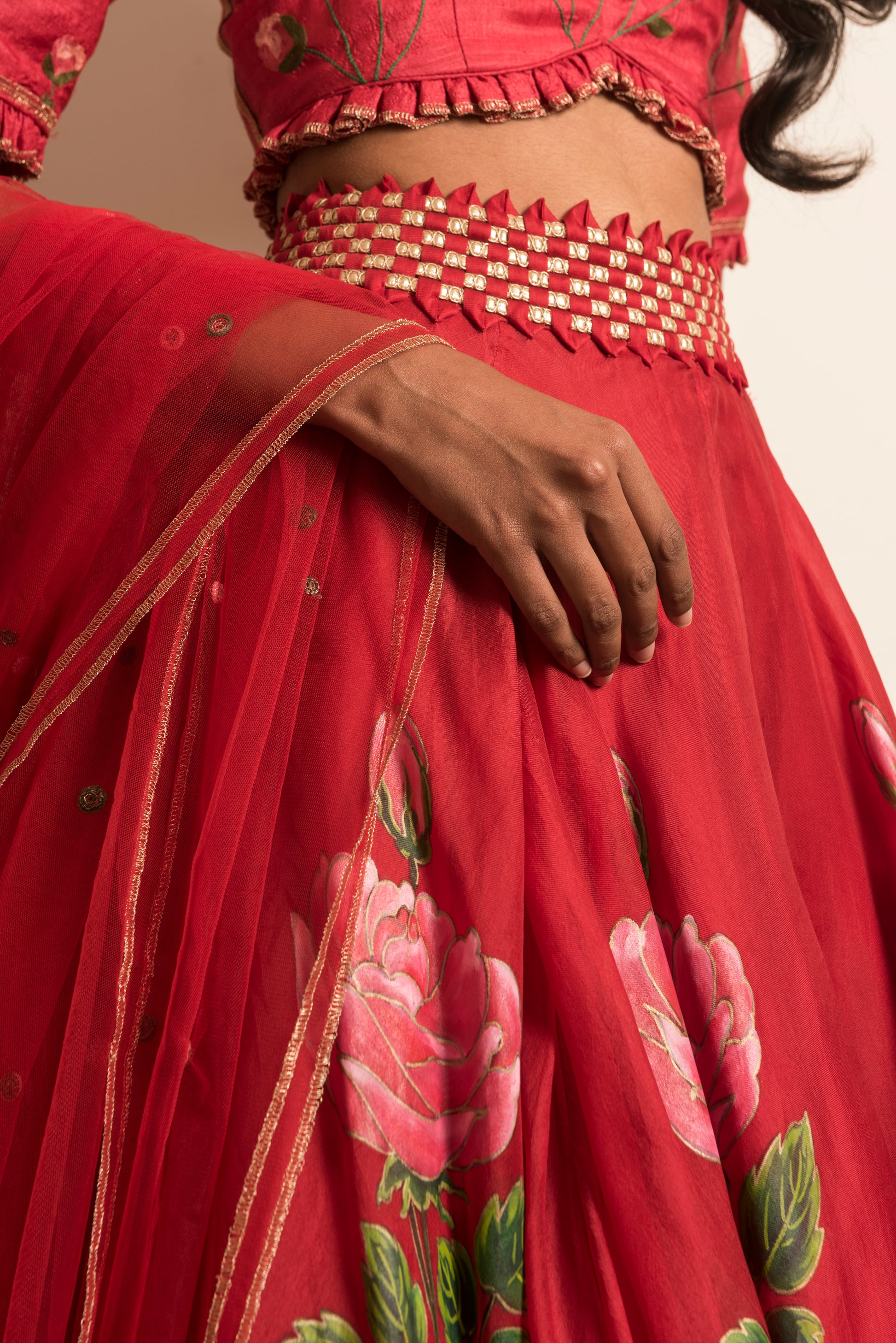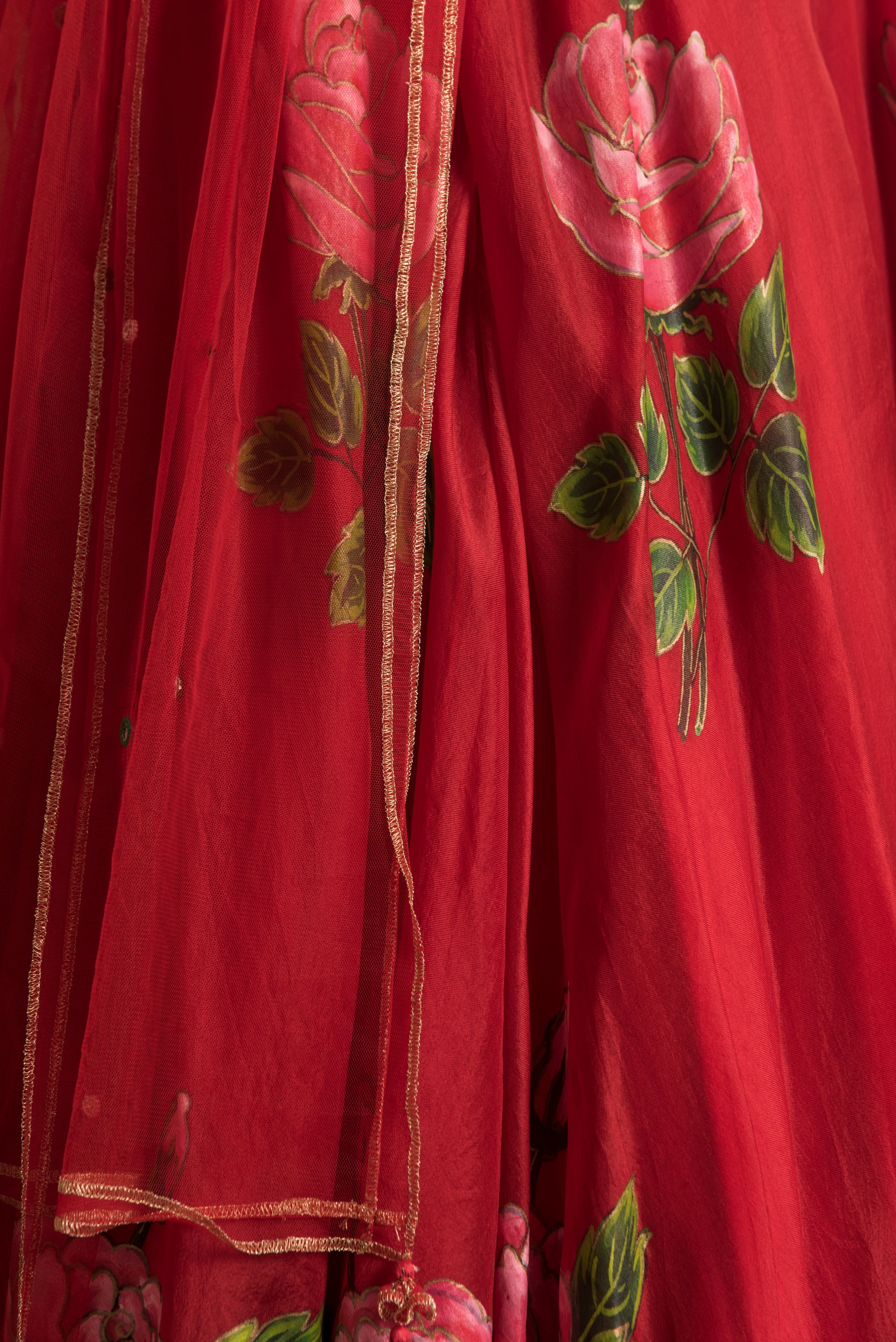 Scarlet Red skirt, hand-painted with flirtatious pink roses paired with an hand-embroidered top & net duppatta.