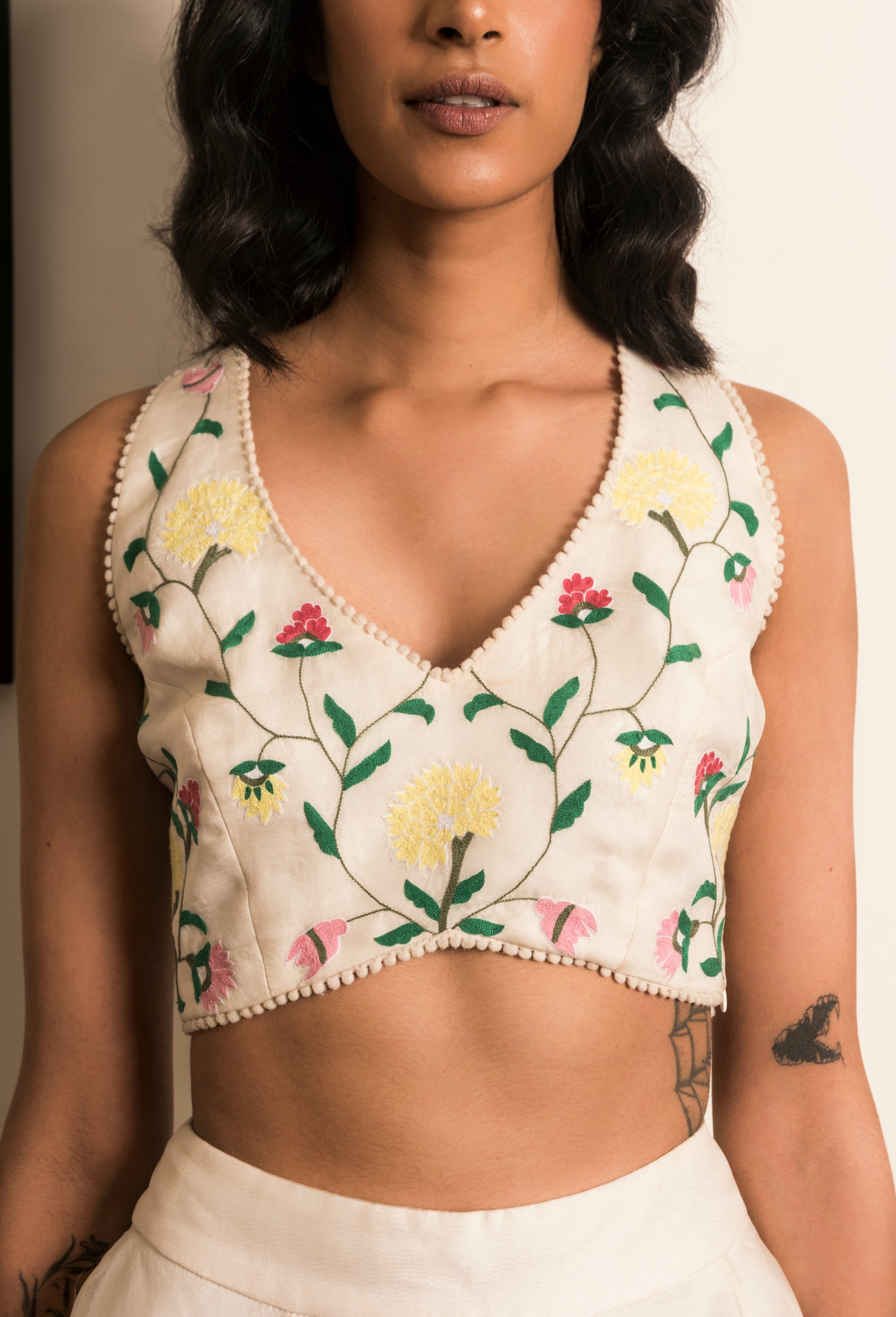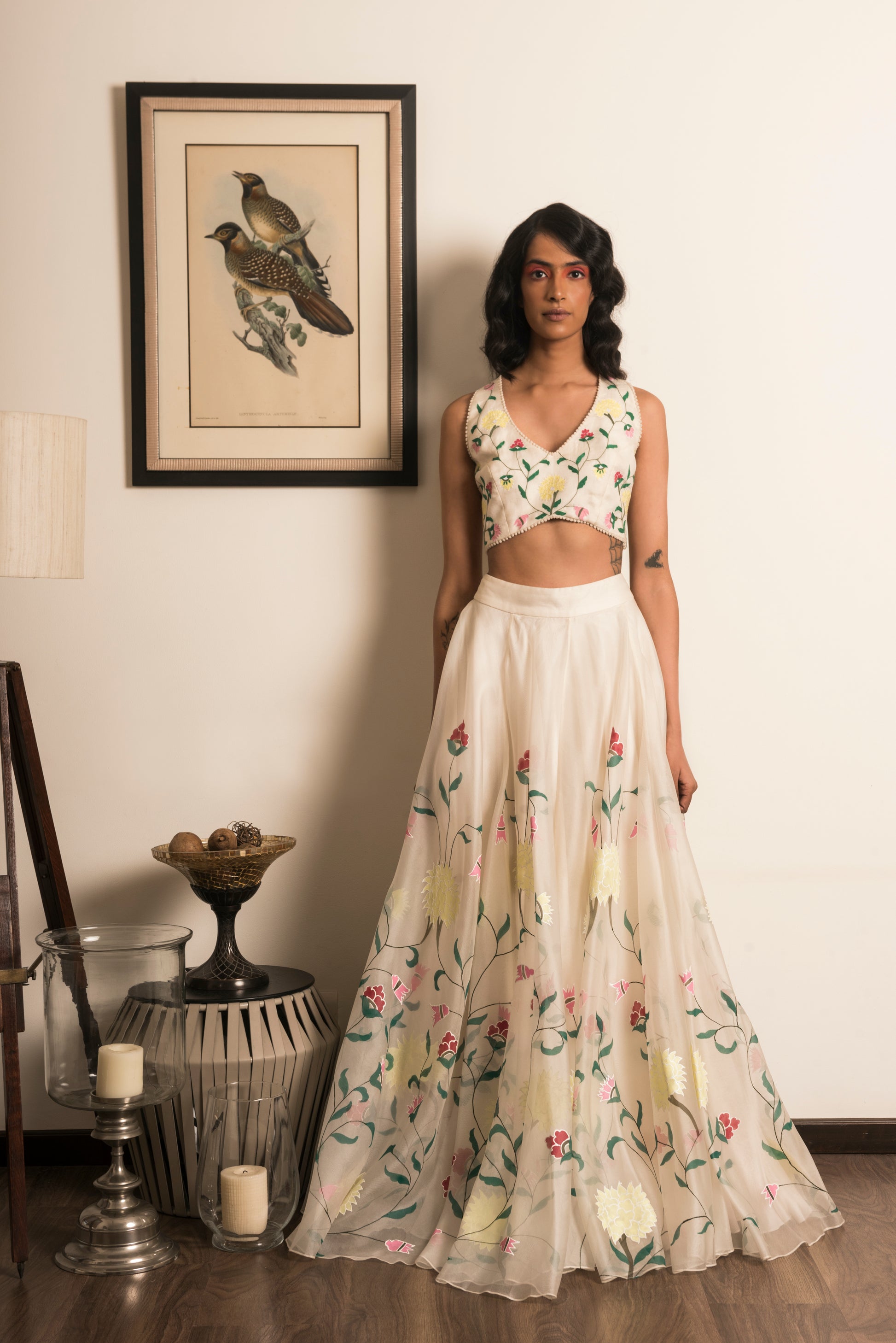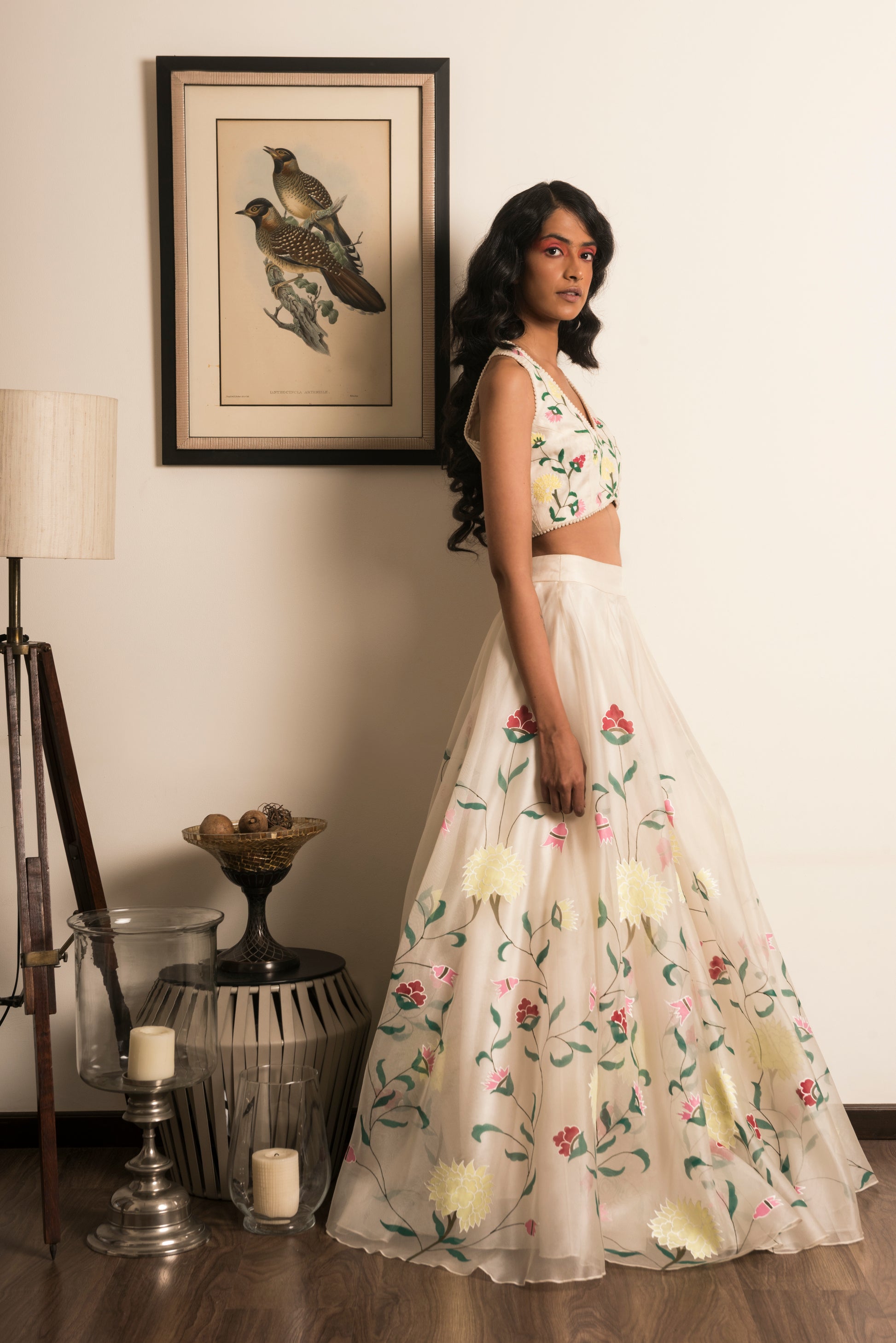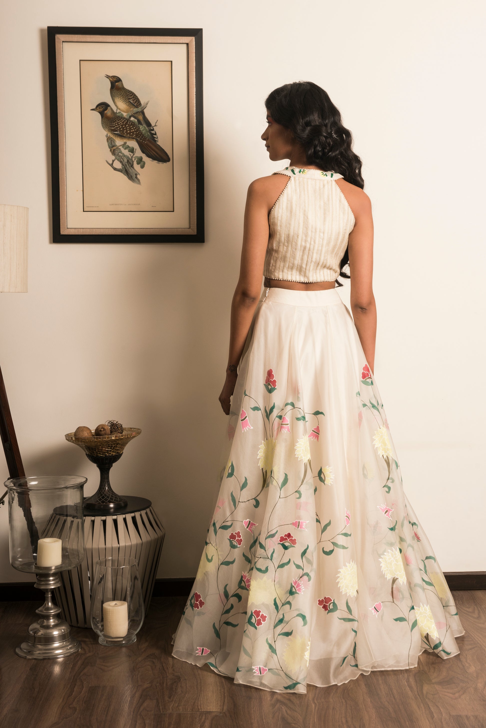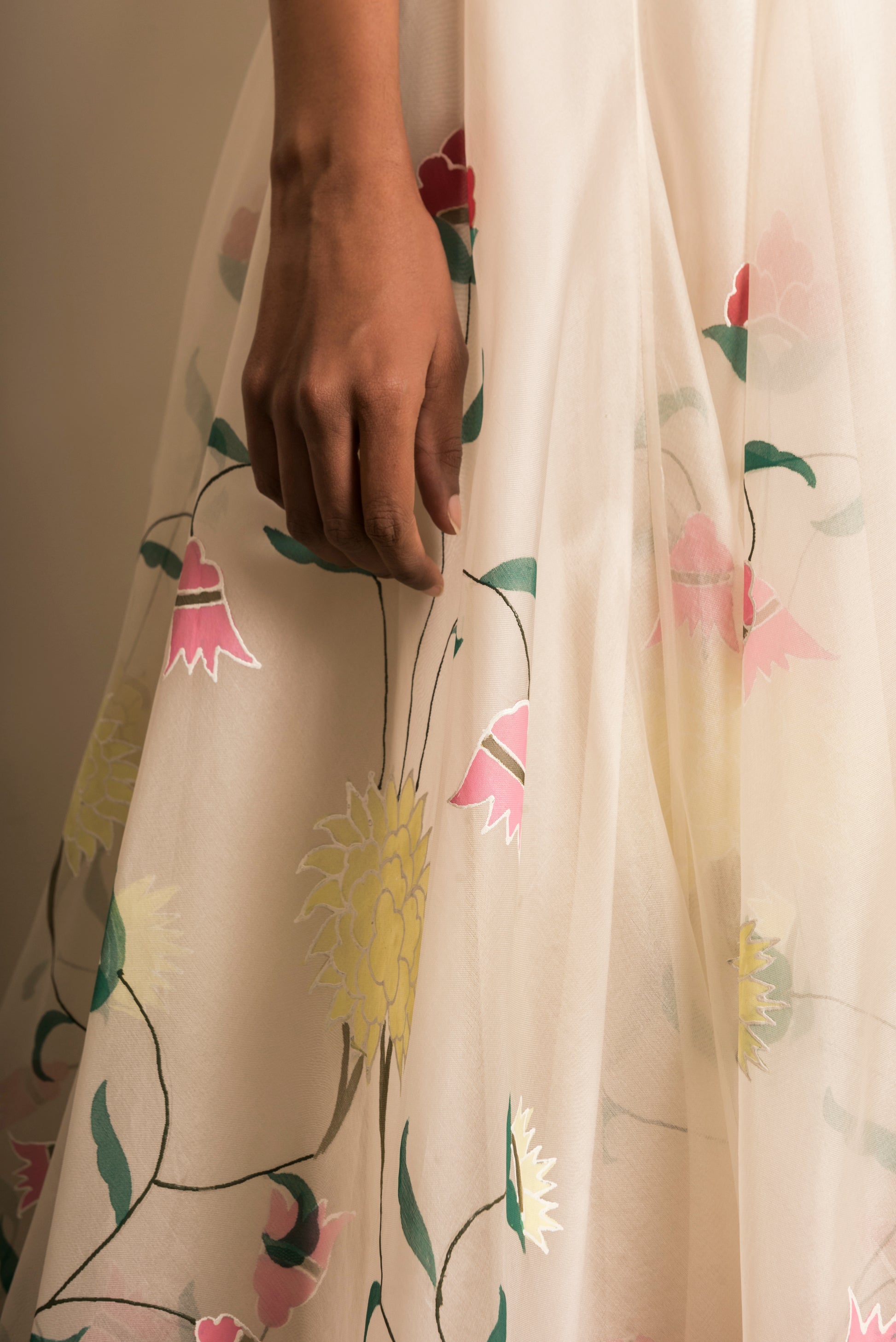 "Fluttering off-white skirt, hand-painted with a bouquet of yellow dahlias & pink tulips paired with an hand-embroidered sleeveless top."