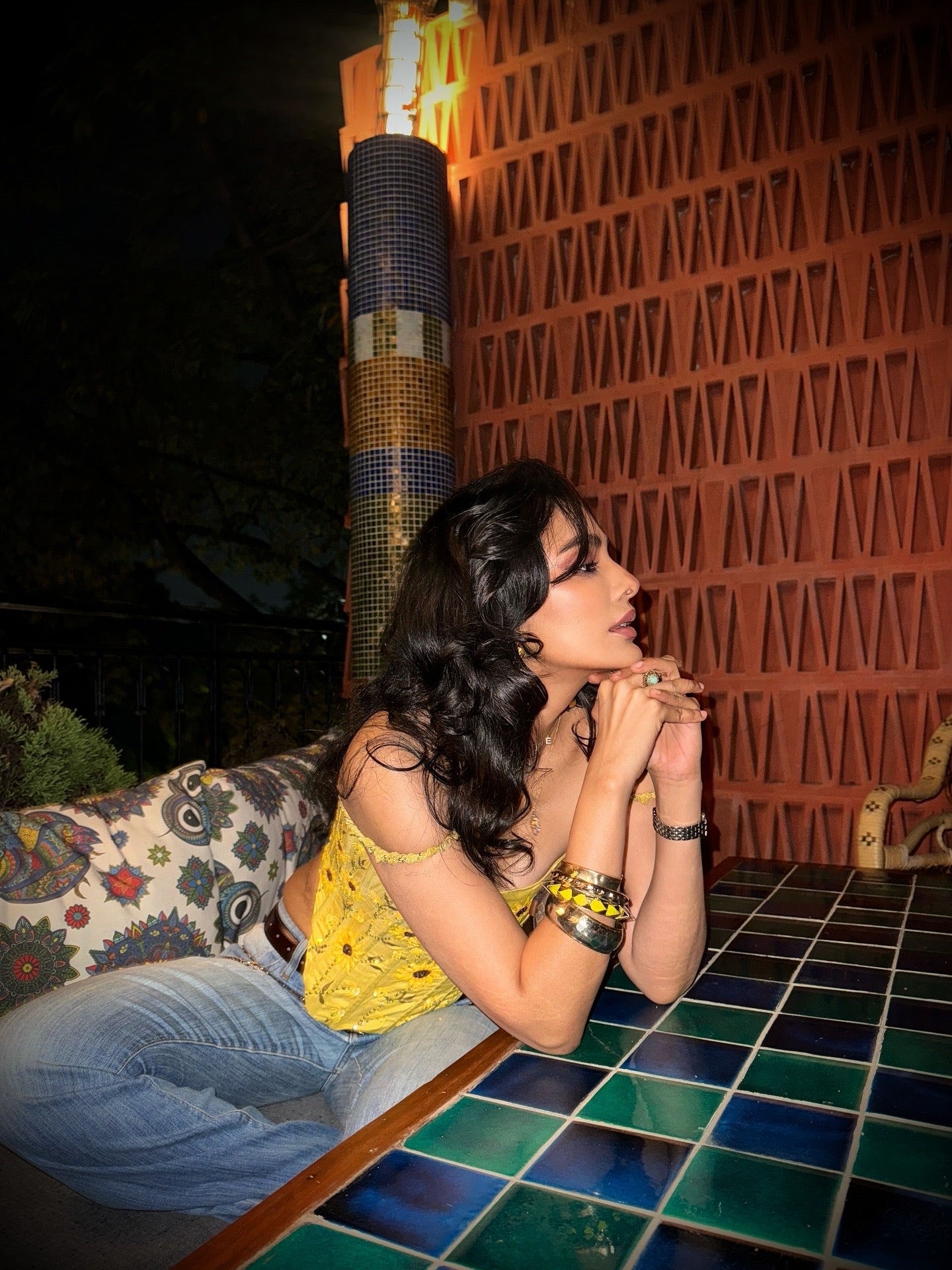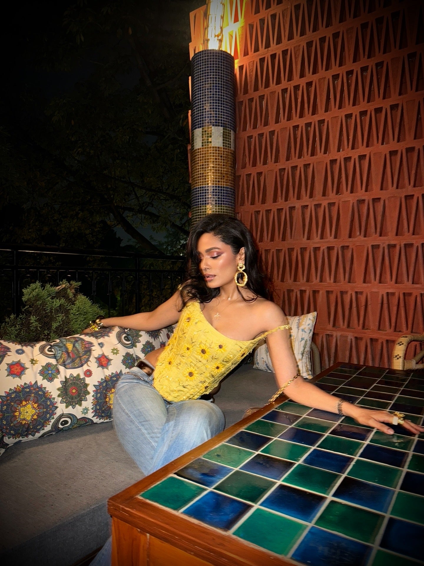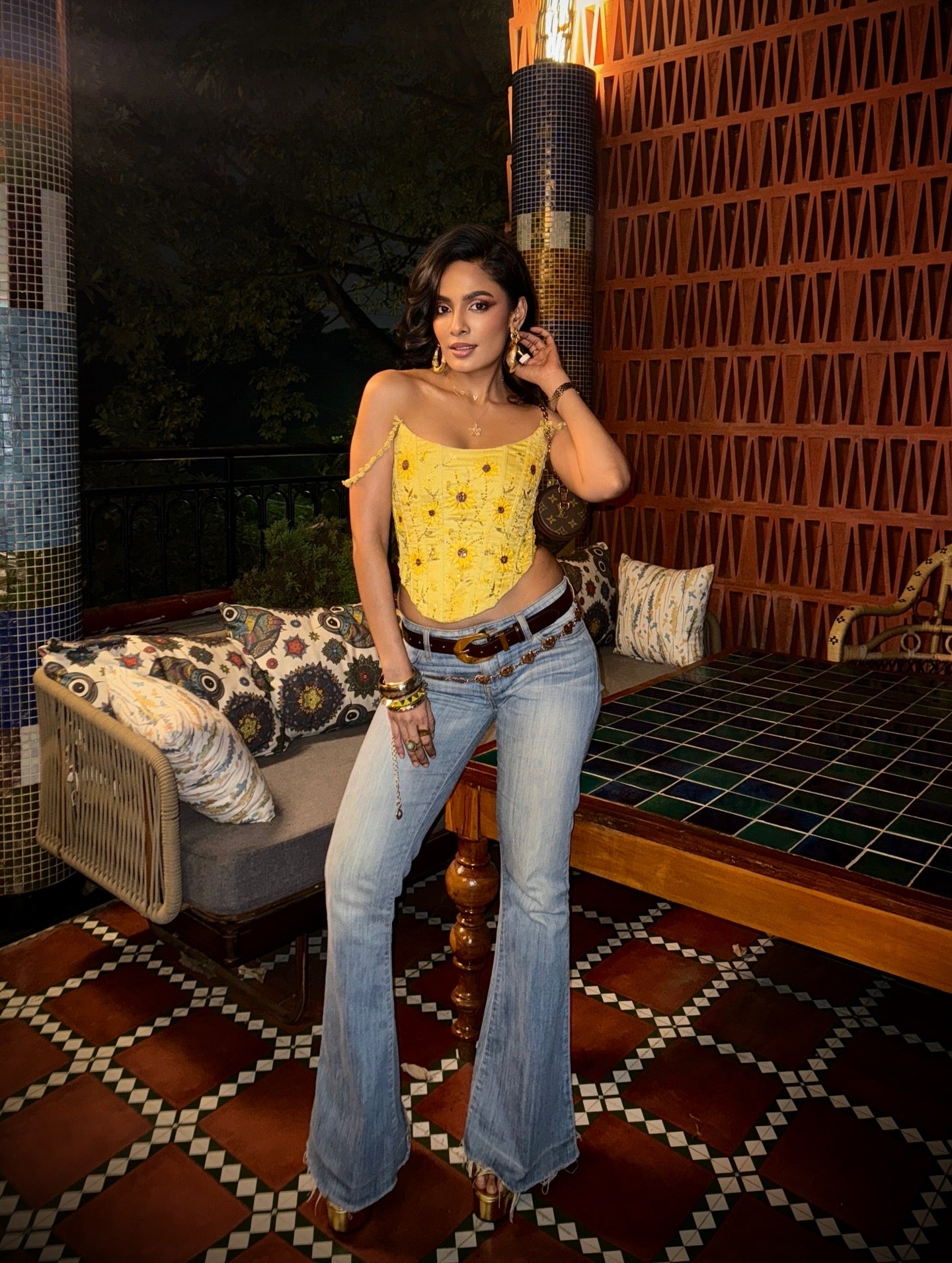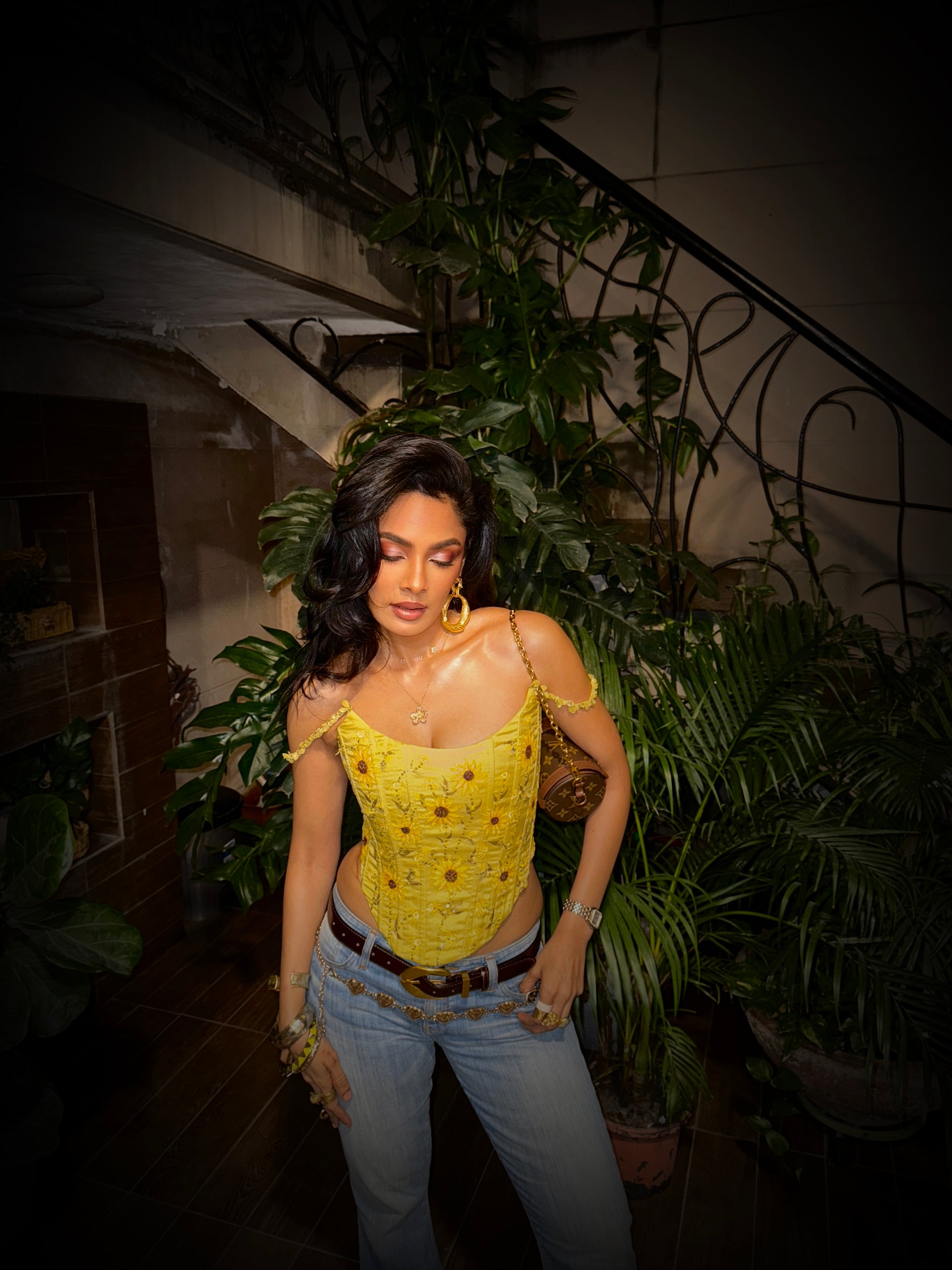 The yellow Sunflower corset features meticulously hand-painted sunflowers, enhanced with matching sequins that reflect light. The shoulder straps of the corset are beautifully detailed with appliqué embroidered flowers, giving them a 3D effect, and a modern edge.