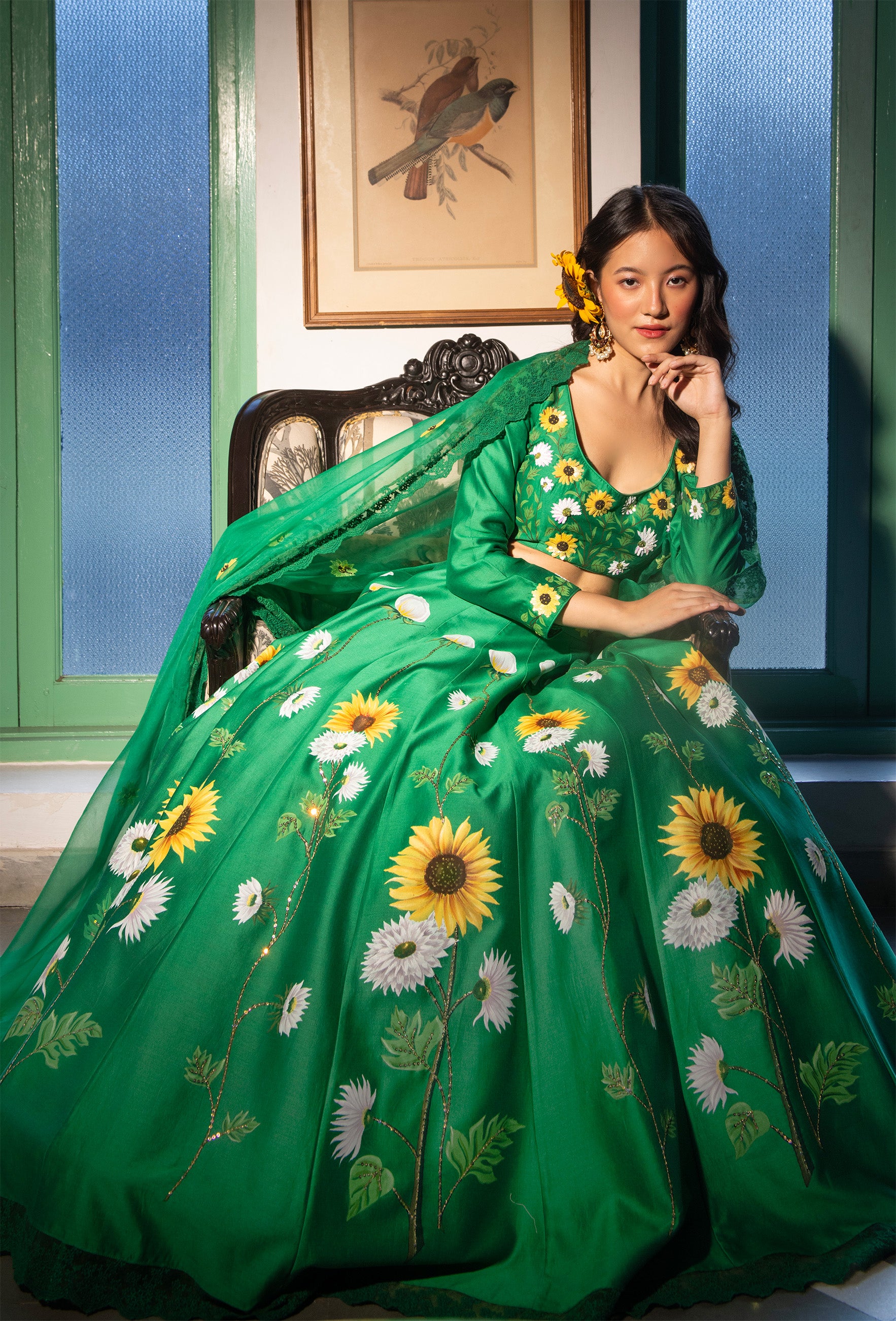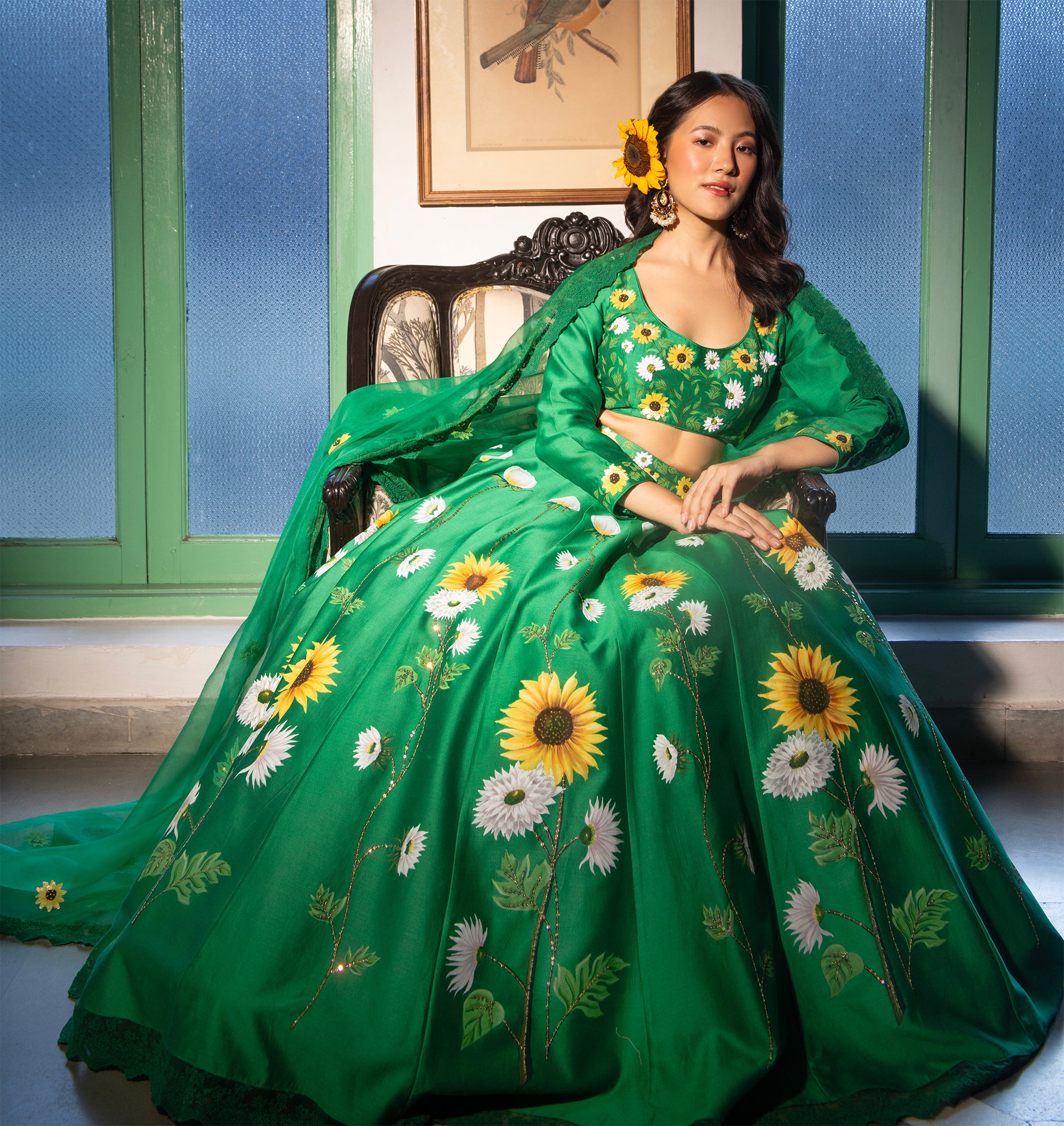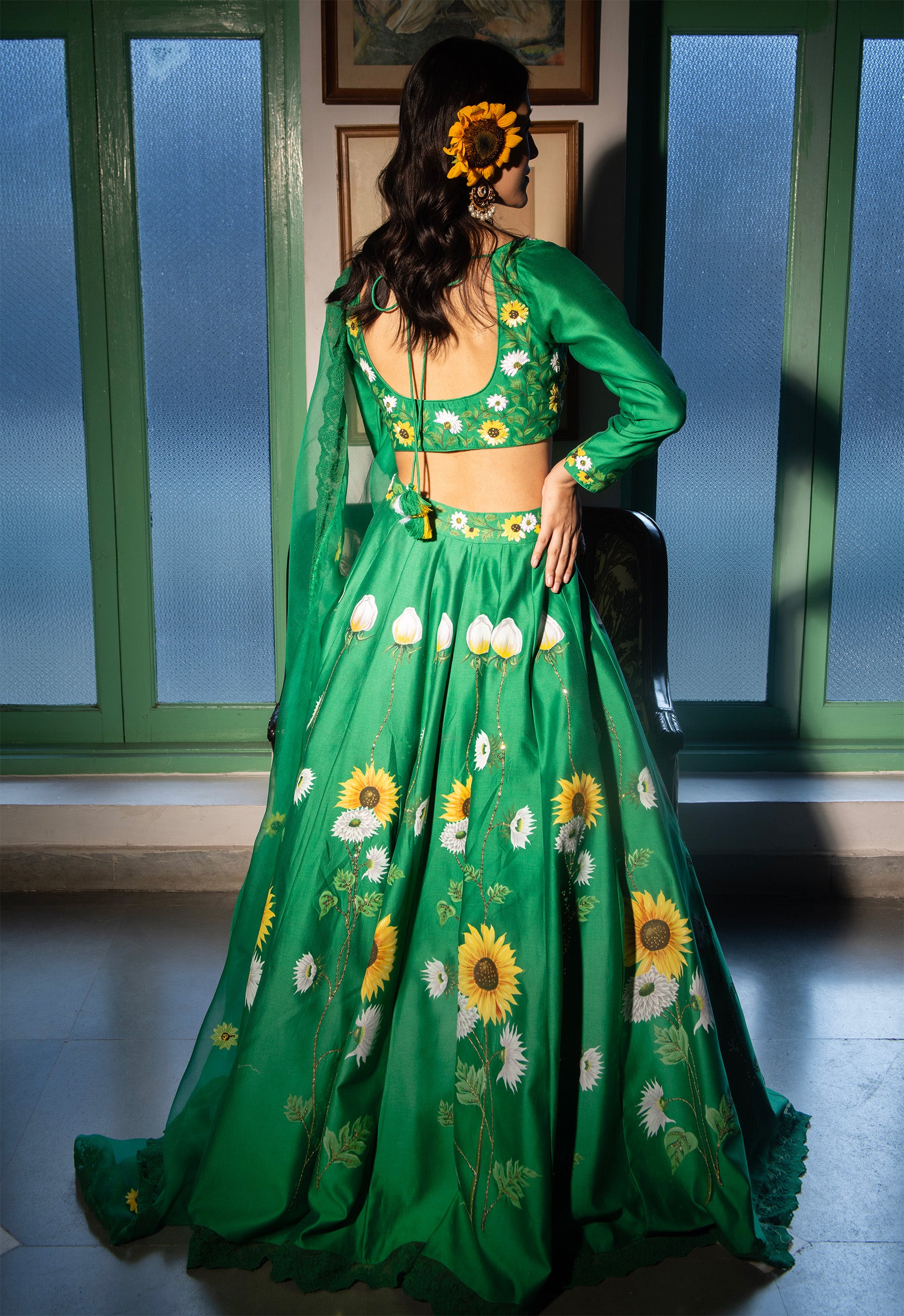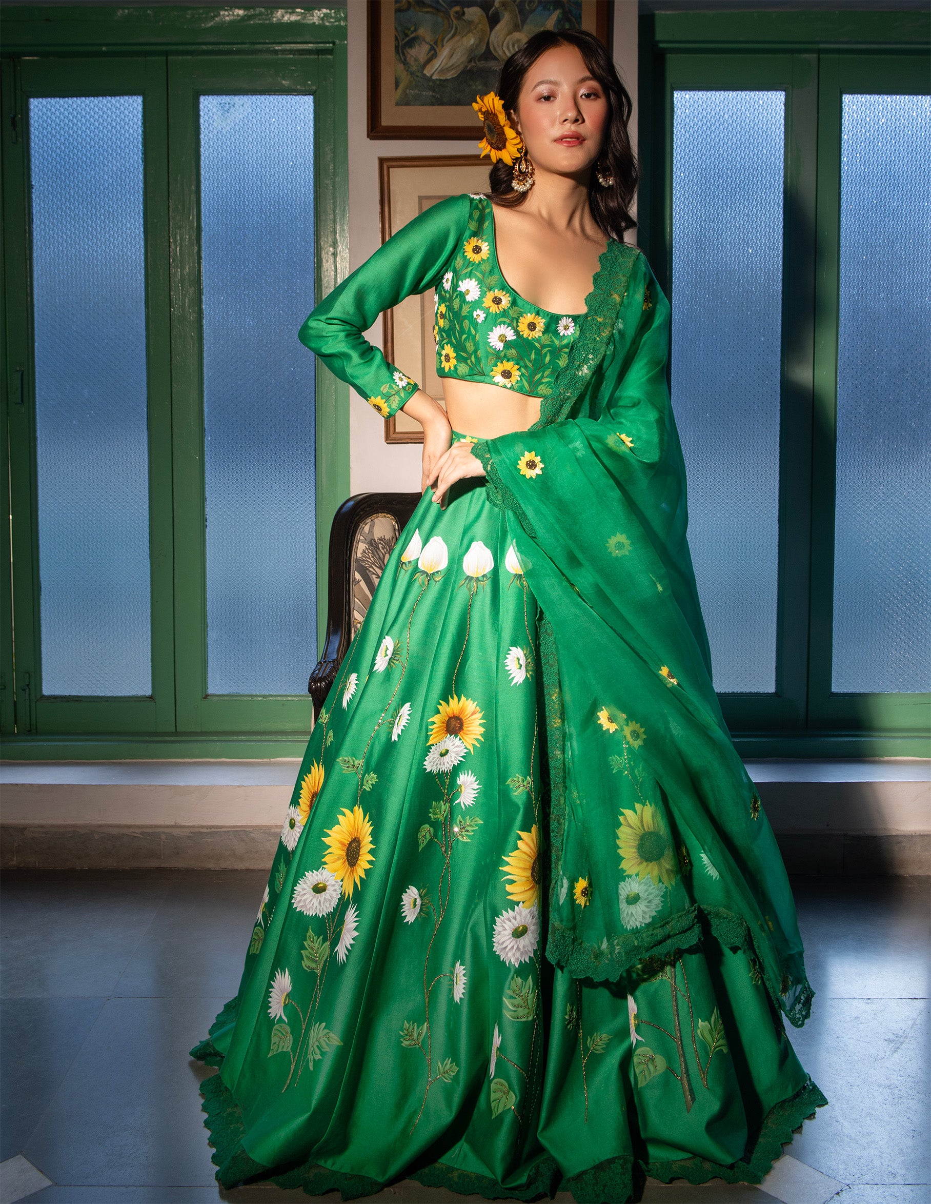 Surajmukhi is a vibrant green skirt set with hand-painted sunflowers on the chanderi skirt, highlighted with sequins and a detailed waistband. The top is highlighted with subtle hand-embroidery done with sequins and threads, along with an organza hand-embroidered dupatta finished with matching lace that completes this enchanting ensemble.