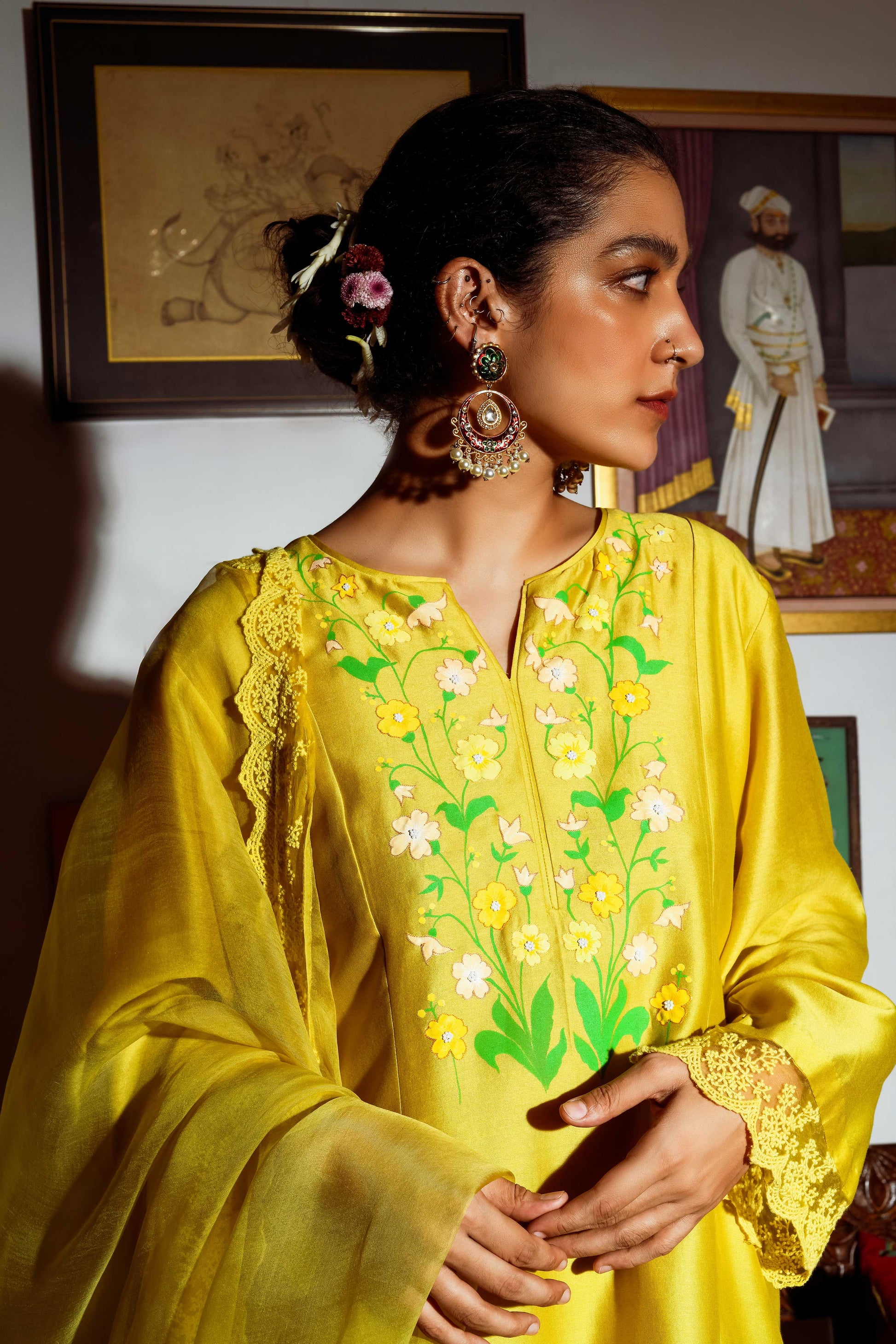 Hand painted detailed floral artwork on the yoke highlighted with hand embroidery, finished with a matching organza embroidered lace on the hemlines, paired with a matching duppatta which is also finished with lace.