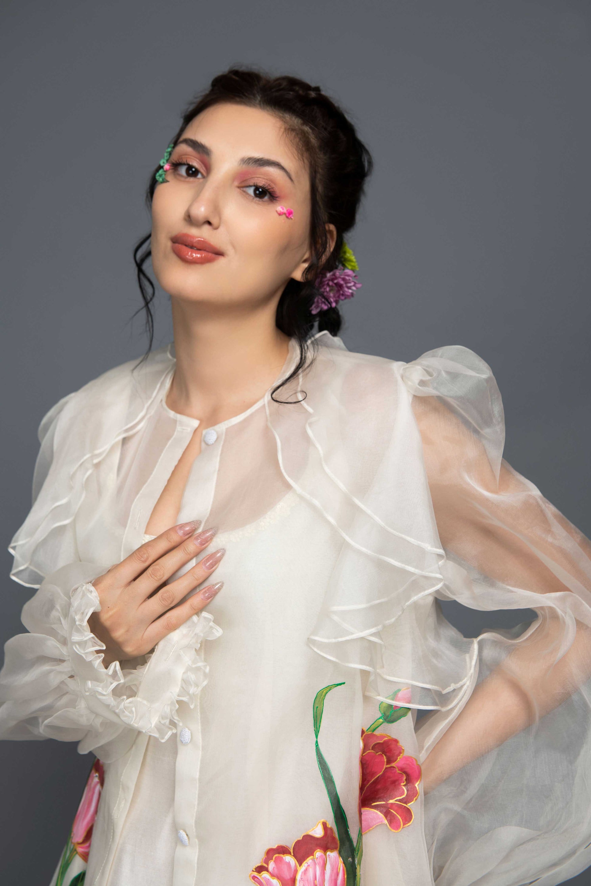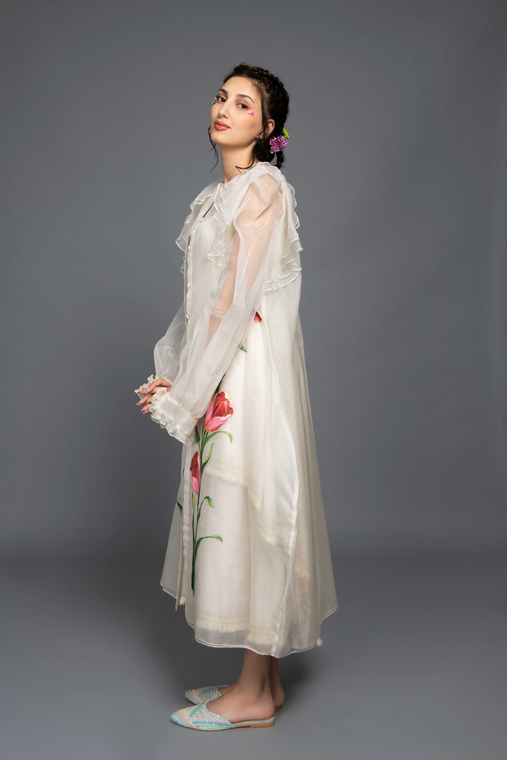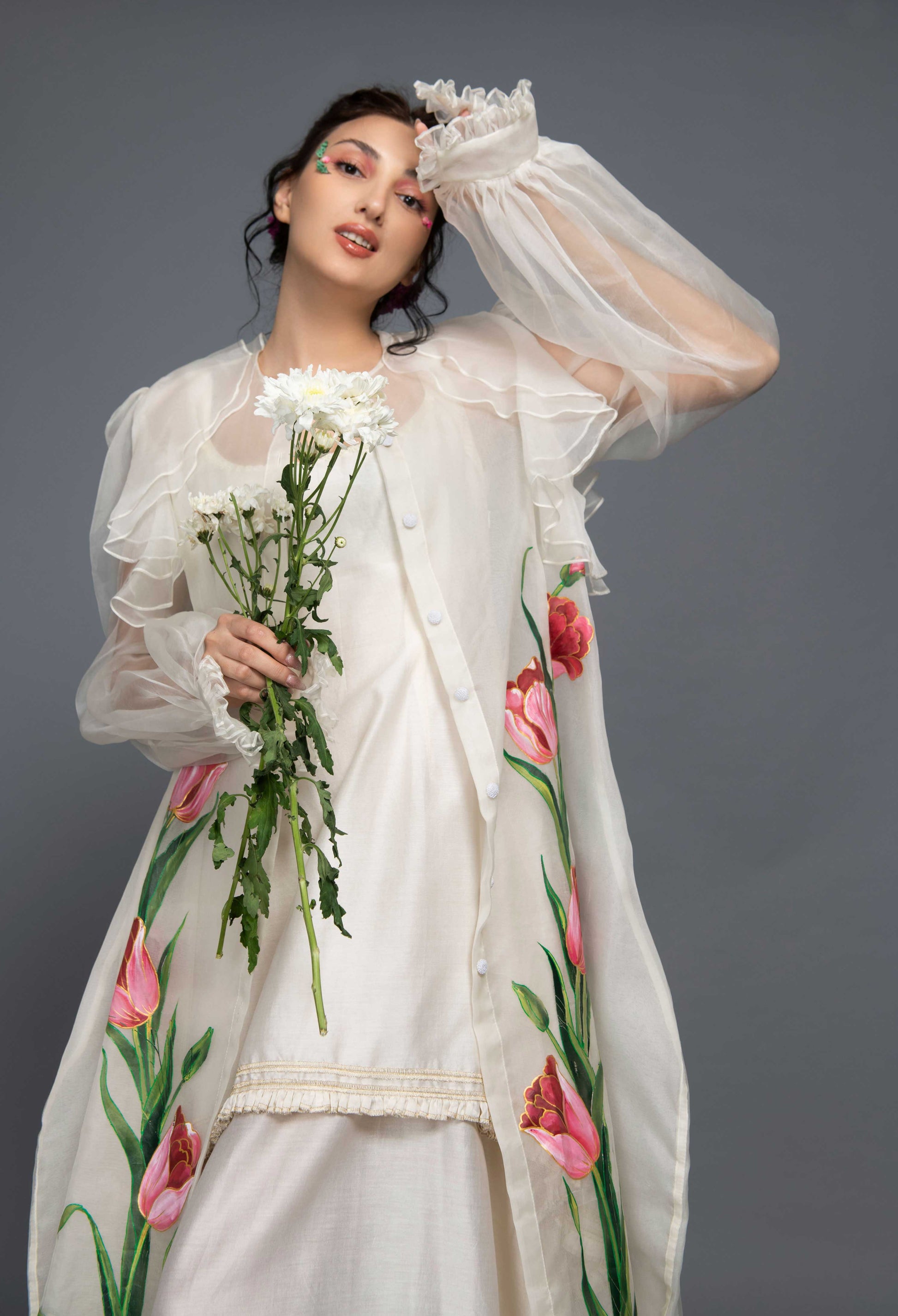 The Tulip Dress features a white midi chanderi silk dress paired with an organza hand-painted jacket adorned with tulip flower motifs. With flattering silhouette, the outfit is perfect for special occasions.