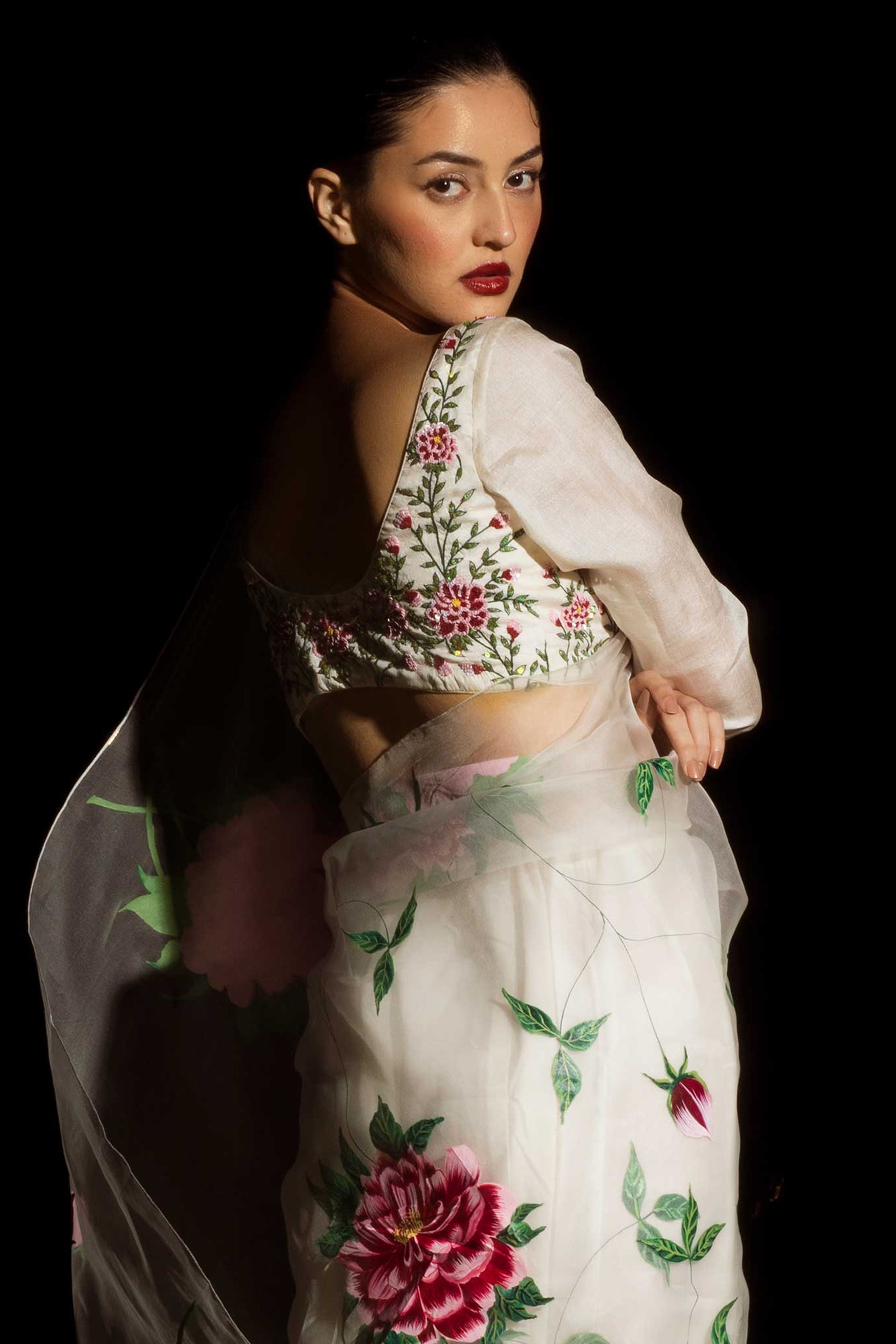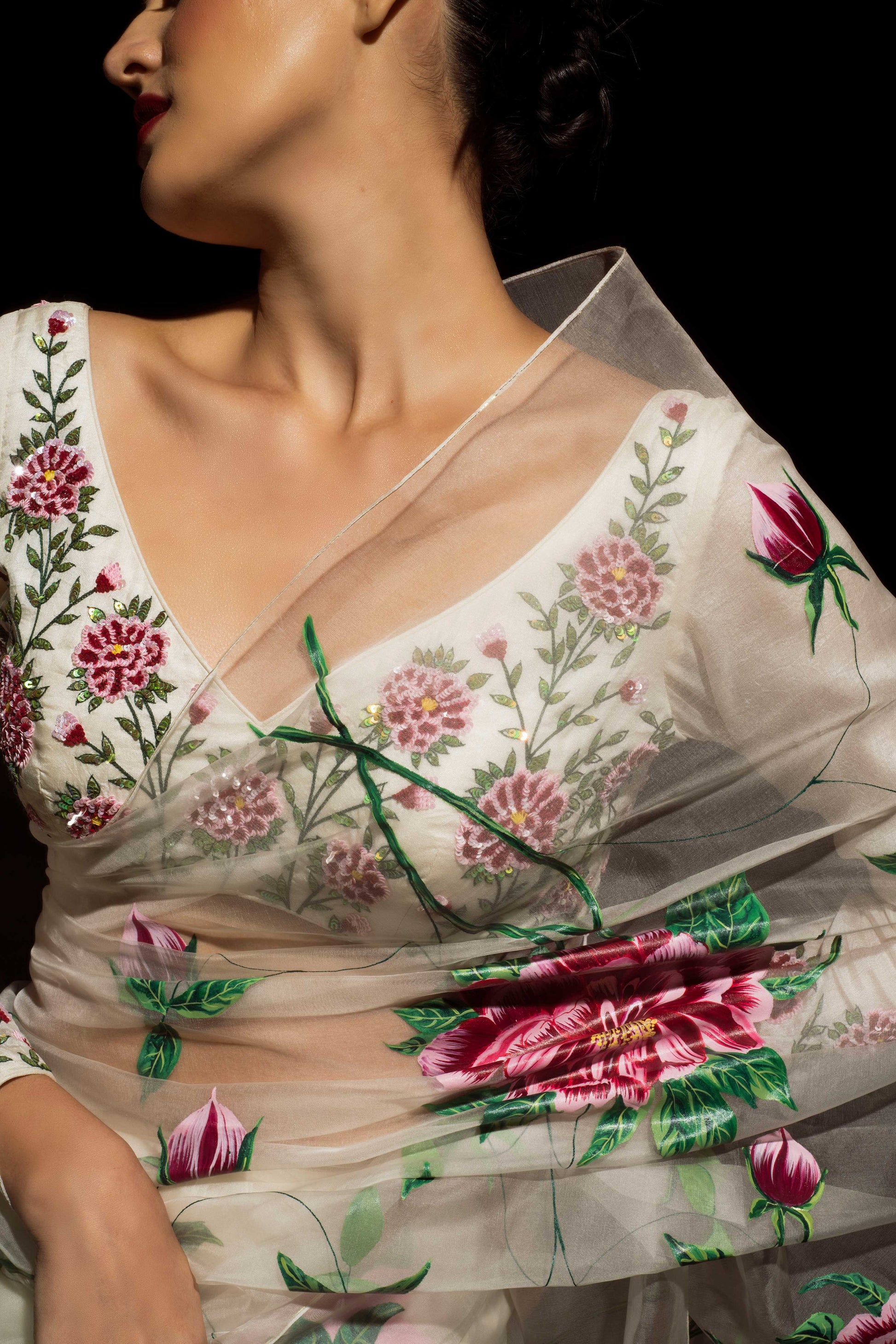 Silk blouse with optional fully hand embroidered thread and sequins work.